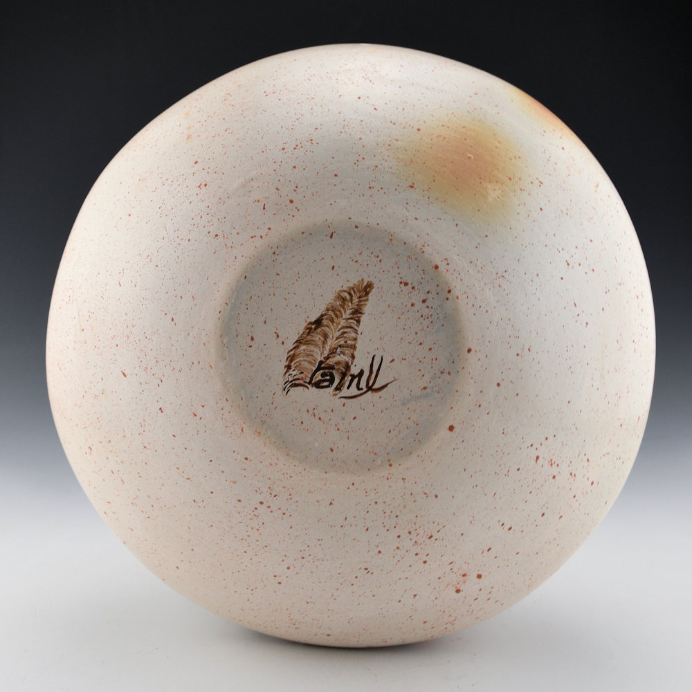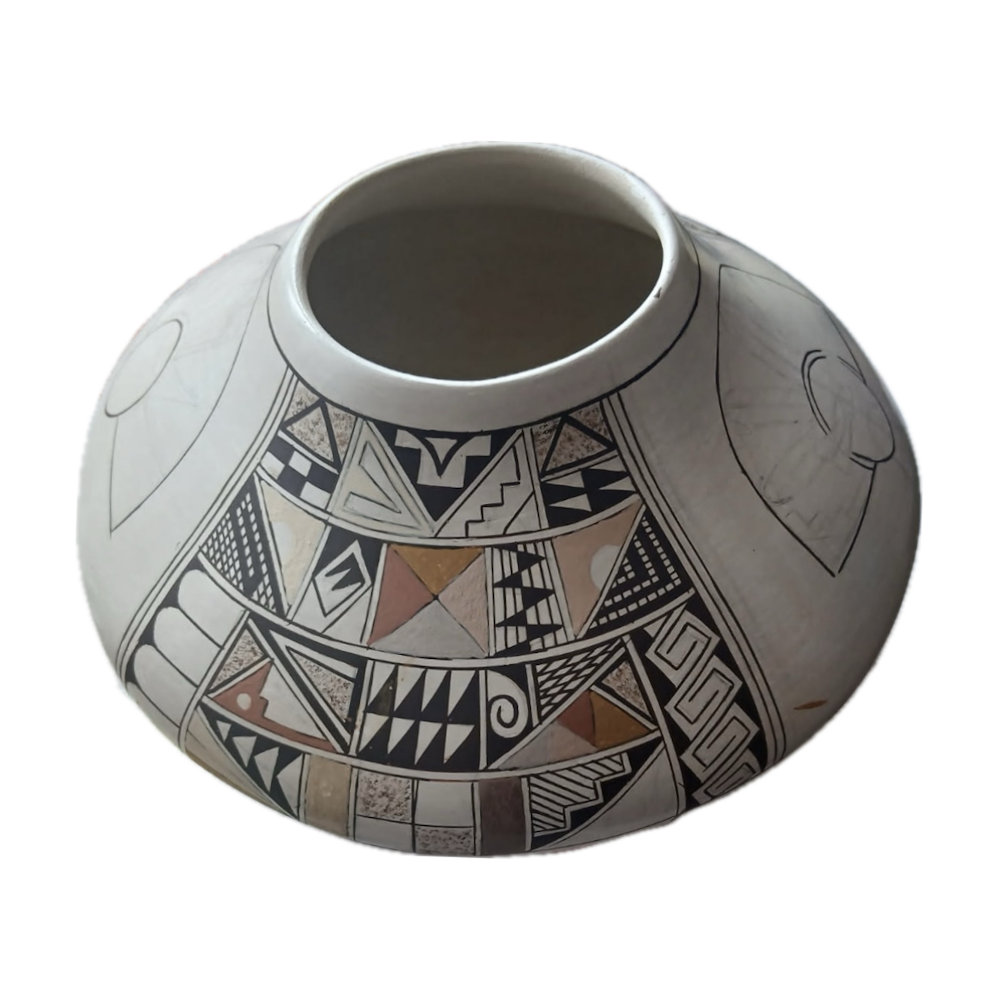 The two Salako figures are tightly painted and note how the feathers on each tablita is a version of her own feather signature! Separating the two figures is a panel Rainy described as “the Dance Shawl”. Each of the squares has a different design from classic Hopi-Tewa pottery. Note the very intricate checkerboard, and rain designs, along with all the various colors! So why the Awatovi designs? Rainy’s mother, Helen “Feather Woman” Naha, lived on a ranch in the Jeddito Valley, below the Awatovi Ruins and Helen was the first revivalist of their black and white pottery. Rainy has continued this revival with her innovative designs. The jar is painted with various clay slips, including bee-weed, which is black. It was traditionally fired and it is signed on the bottom with a feather and “Rainy”. Rainy has won numerous awards for her pottery at Santa Fe Indian Market and the Heard Market and her work continues to be a creative inspiration in Hopi-Tewa pottery. The last photo is one that Rainy send me of the jar in process (before it was fired, while it was being painted).