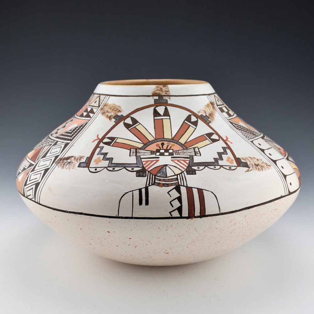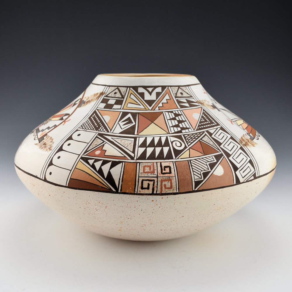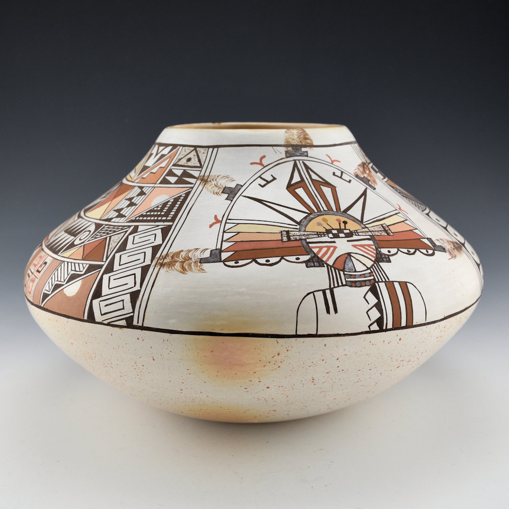 This large jar by Rainy Naha is intricately designed and painted. This jar has a wide shoulder and a sloping side. It is painted with a male Salako Katsina on one side, and a female Salako on the other.