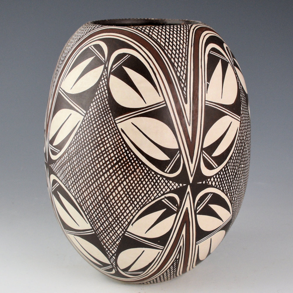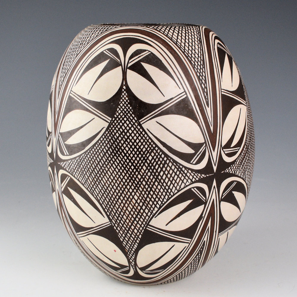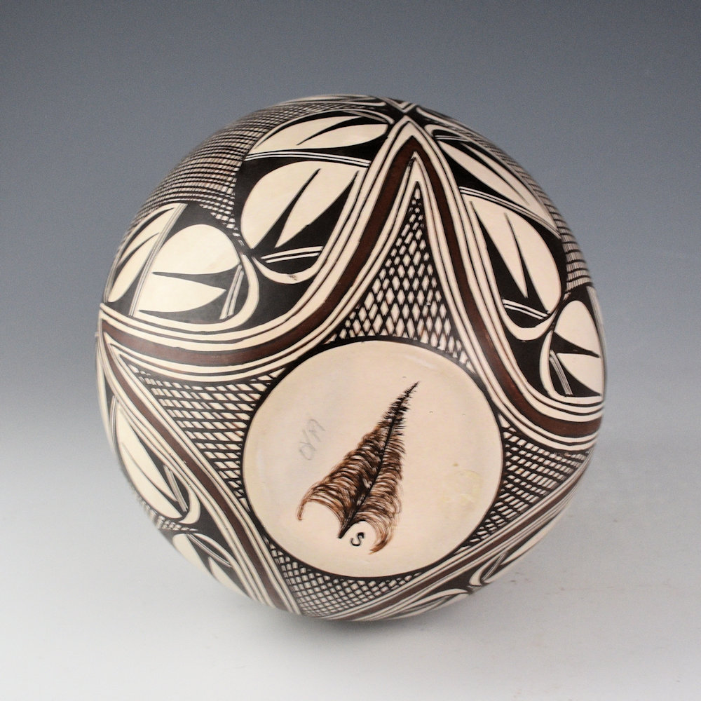 Sylvia Naha was a daughter of Helen “Featherwoman” Naha and a sister of Rainy and Burell Naha. She was known for her distinctive pieces painted with intricate designs on a white polished clay surface. Throughout the 1980’s, Sylvia was considered among the most innovative of the Hopi potters. Her pieces were classic in form and amazingly intricate in design. This is a tall jar and it is painted with the Awatovi Star pattern on the top and bottom. Under the star are bird wing designs. The striking feature to this jar are all the finely painted lines! This style was inspired by the “migration pattern” which Sylvia modified and made more complex with her flow of lines across the surface of the piece. The black on the painting is from Bee-Weed (a plant) and the red and other colors are natural clay slips. The jar is in excellent condition with no chips, cracks, restoration or repair. The jar is signed on the bottom with a feather and an “S”. It is certainly a striking piece by his exceptional Hopi-Tewa potter!