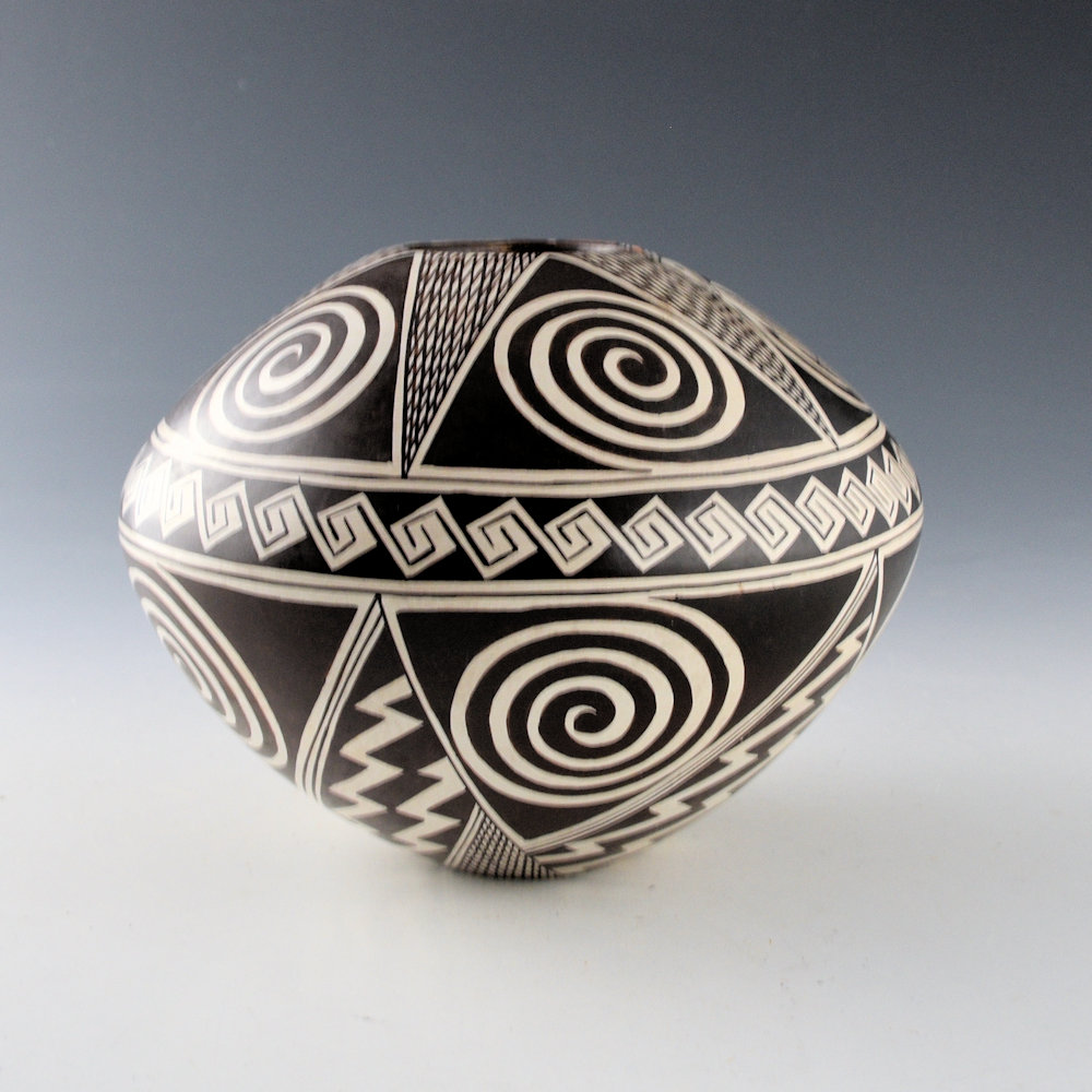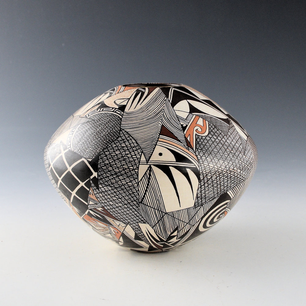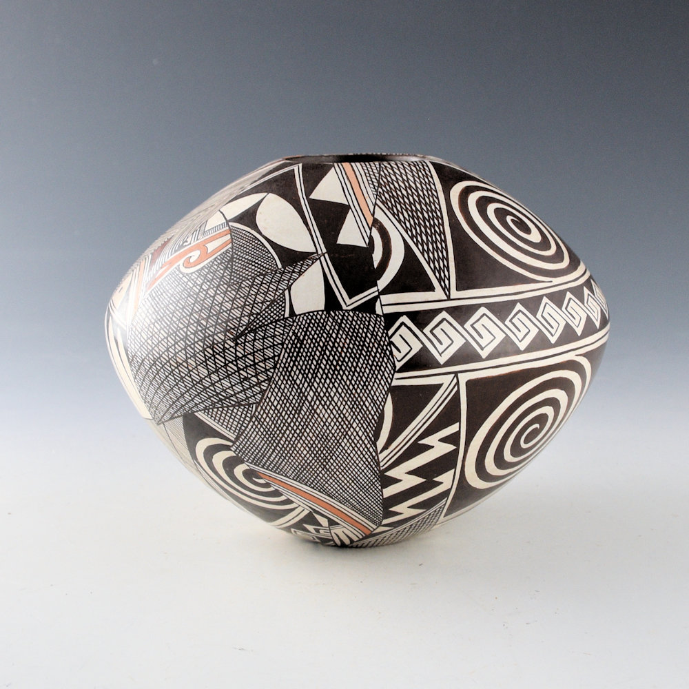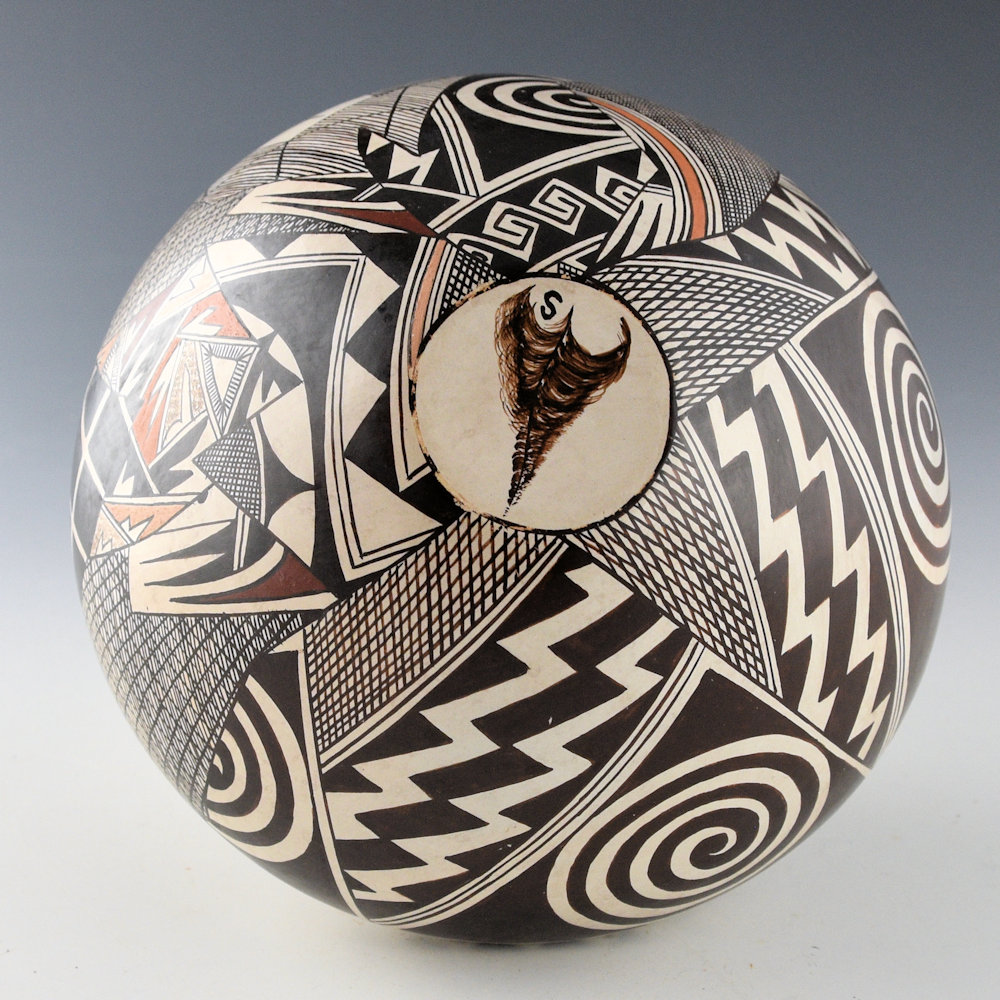This jar is an intricately painted piece by Sylvia Naha. She was a daughter of Helen “Featherwoman” Naha and a sister of Rainy and Burell Naha. She was known for her distinctive pieces painted with intricate designs on a white polished clay surface. Throughout the 1980s, Sylvia was considered among the most innovative of the Hopi potters. Her pieces were classic in form and amazingly intricate in design. This jar has a round shoulder and sloping sides. Half of the jar is painted withe the Awatovi Star pattern made famous by her mother. It is very tightly painted. As the piece is turned, there are large sections painted with very intricate hatchwork designs. These sections are taken from her mother’s classic style of bird migration jars. The background has been stippled with bee-weed to create a brown coloration. All the other colors are from various clays. The jar is in excellent condition with no chips, cracks, restoration, or repair. The jar is signed on the bottom with a feather and an “S”. It is certainly an extraordinary piece by his exceptional Hopi-Tewa potter!