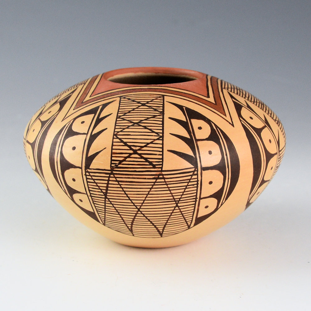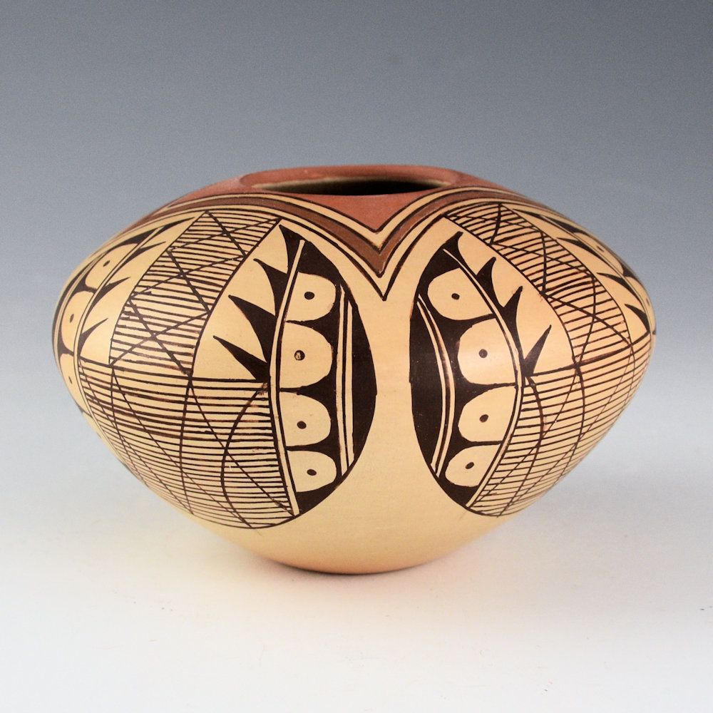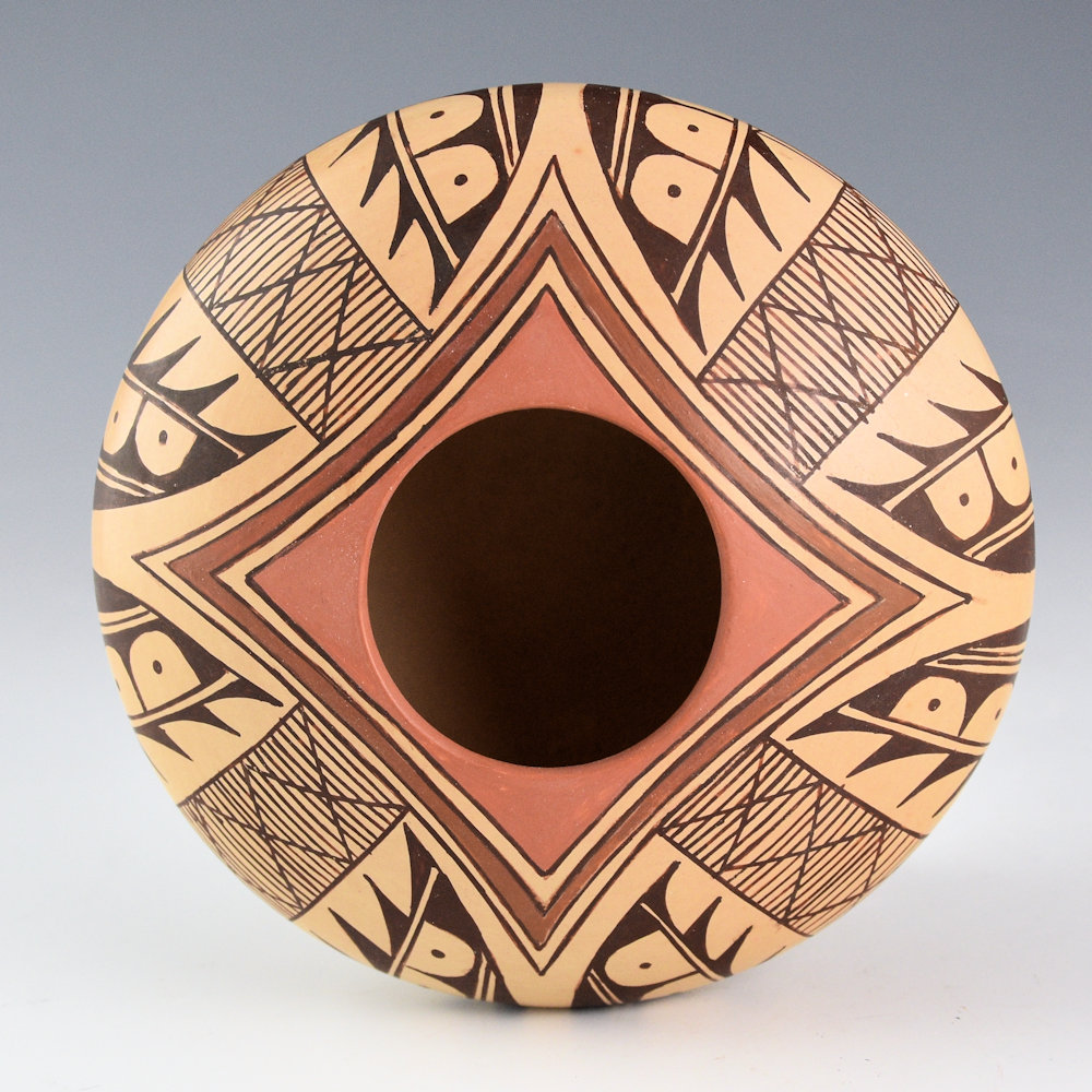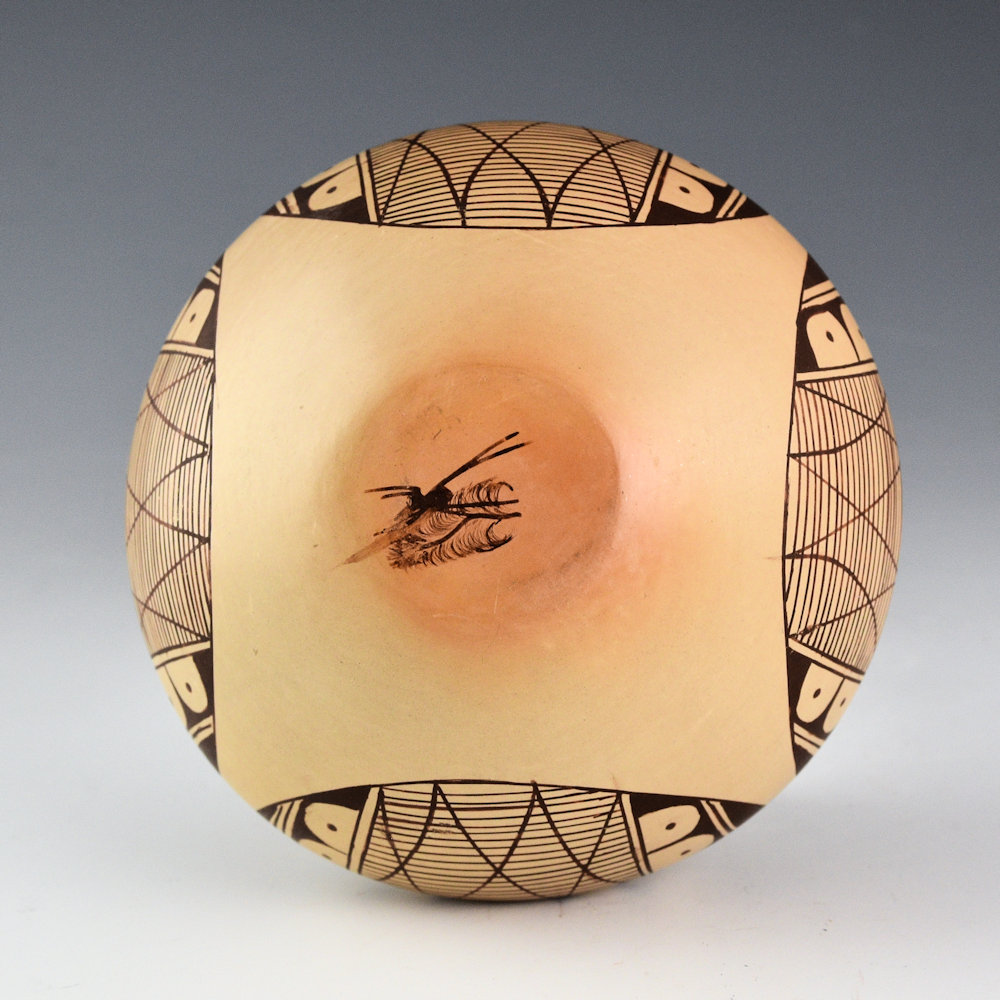 Tyra Naha is a daughter of Rainy Naha. She learned to make pottery from her mother and continues to make traditional-style Hopi-Tewa pottery in the style of her grandmother, Helen “Feather Woman” Naha. This bowl is fully polished and painted with a bat wing design. There are four bat wings. Note the use of the thin lines! The bowl was traditionally fired. It is signed with a feather and spider (Spider Clan ).