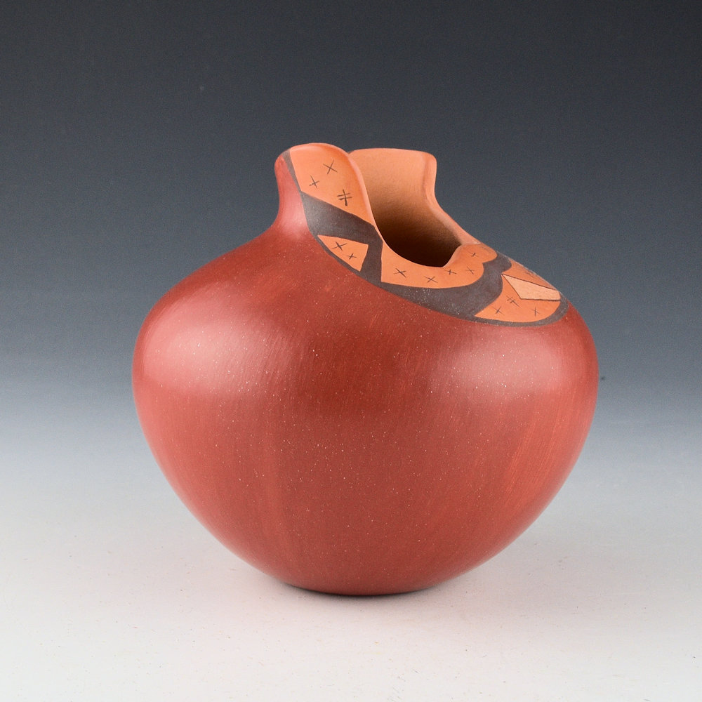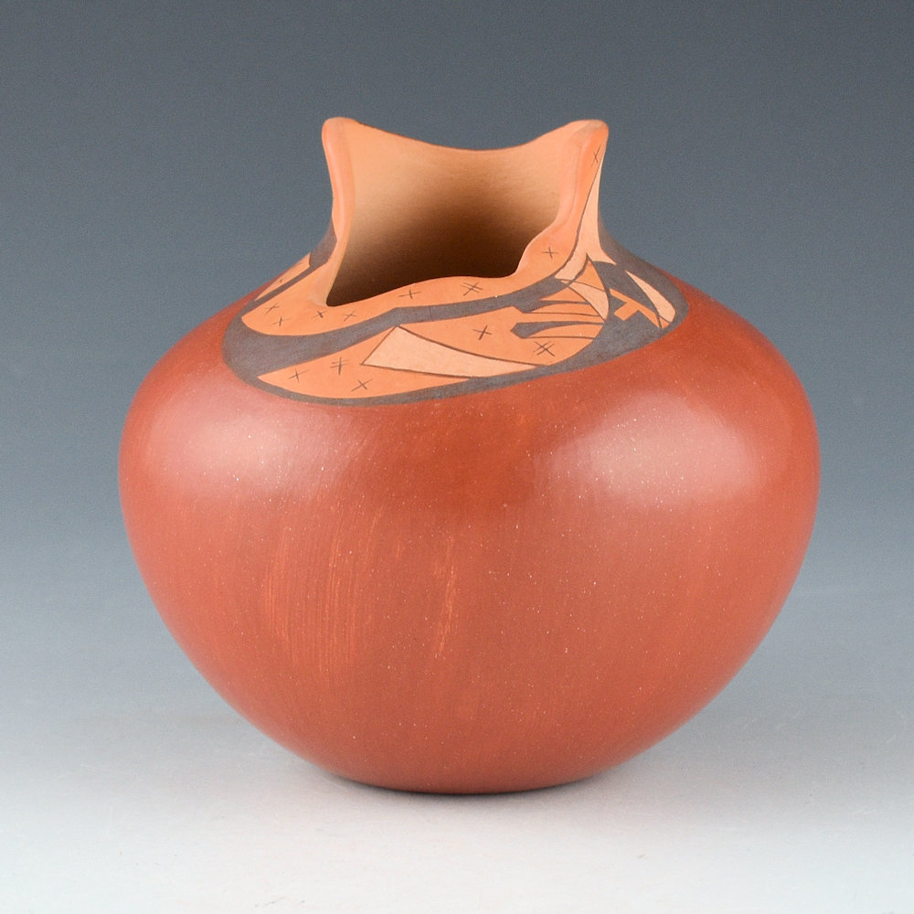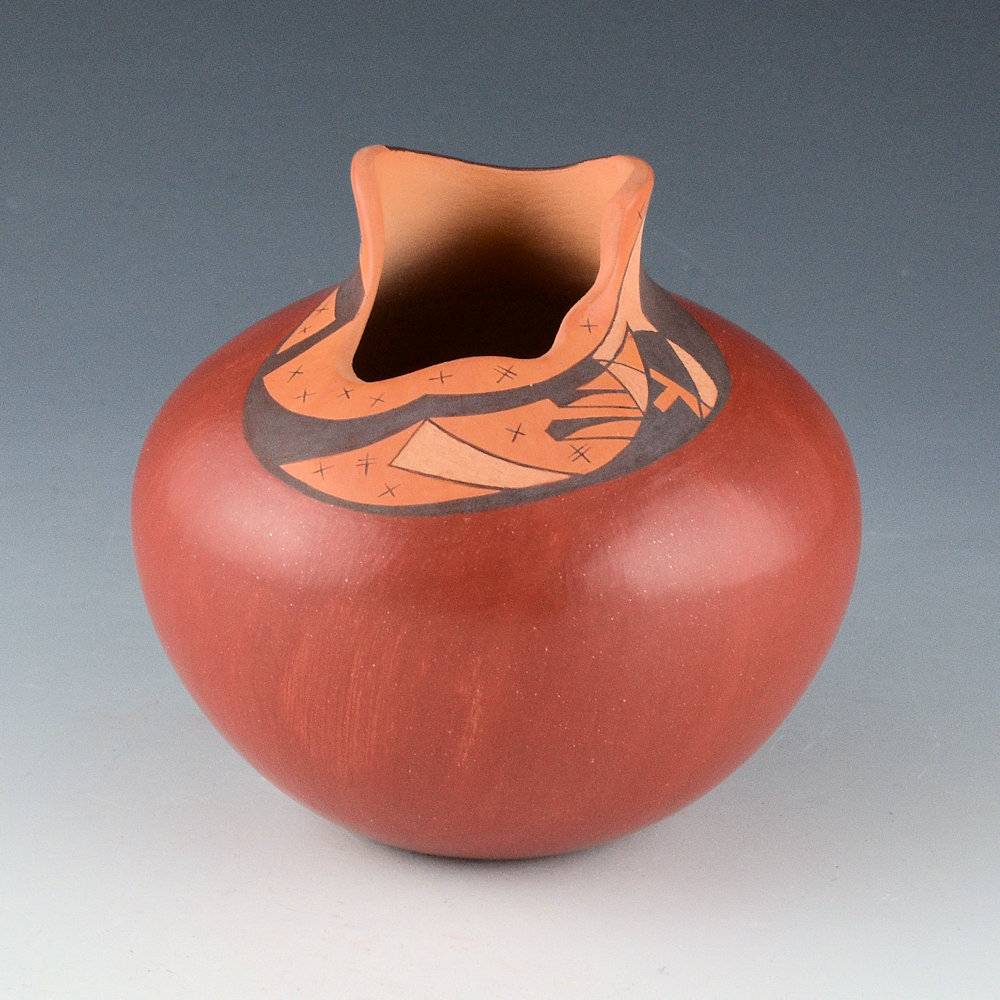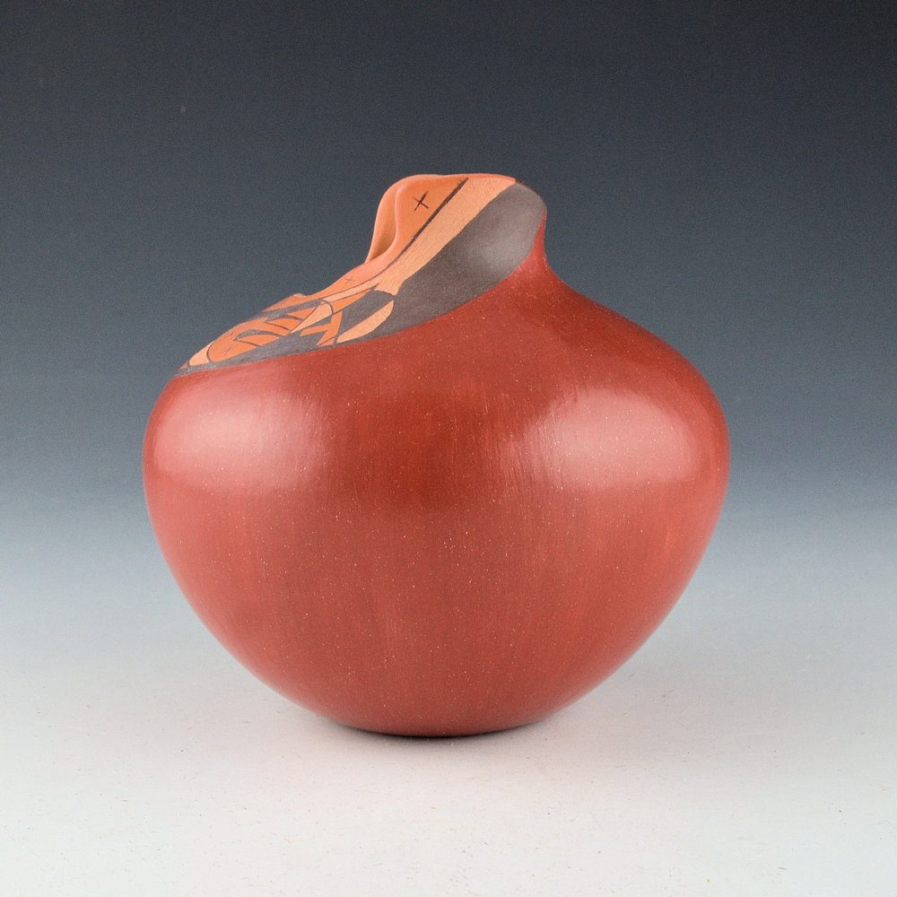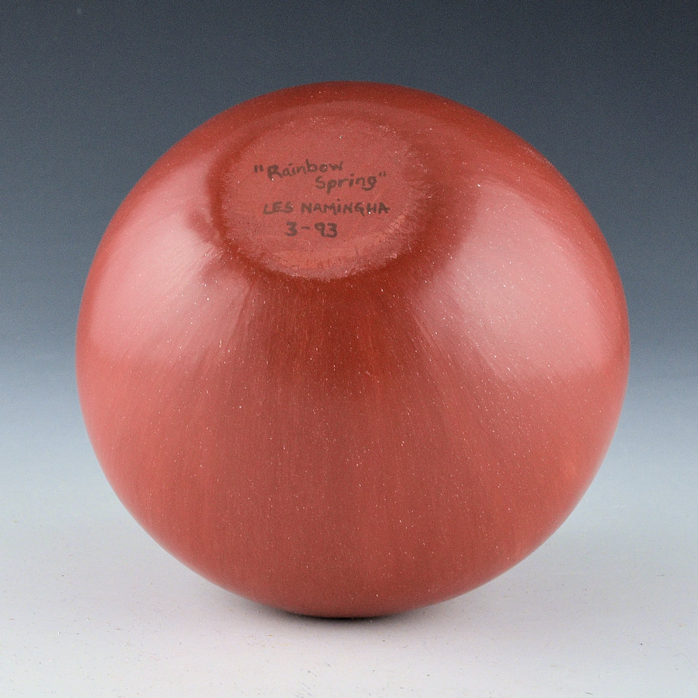 This is an innovative jar by Les Namingha from 1993. The jar is made with traditional Hopi clay and painted with bee-weed and polished red areas. The jar has a round shape with a raised neck. The jar is entitled, “Rainbow Spring”. majority of the jar is polished to a deep red coloration. The top of the shoulder has an area that is both painted and incised. There are painted stars and an incised setting, a crescent moon, and an incised prayer feather. The matte neck is meant to represent the Hopi Mesa and the black line is the rainbow. It is a detailed and creative jar! The piece was traditionally fired to create the blushes on the surface. The jar is in excellent condition with no chips, cracks, restoration, or repair. It is signed, “Les Namingha”.