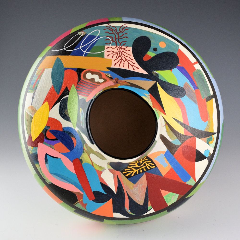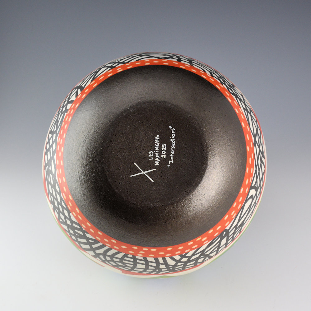Les Namingha is one of those potters who continues to defy expectations in his innovative clay art. This jar is entitled, “Intersections”. Les says this is a piece that combines a variety of his designs and styles from over the years. HIs poitilism, geometrics, and migration swirls are all present. The sides of the jar have green geometric fields above stylized landscpaes and the “earth” at the base. It’s the intersection of his artistic styles along with the everything from the earth to the sky. It is a bold and striking piece! Once again Les creates such thoughtful work and challenges the viewer to find a deeper meaning in each piece!