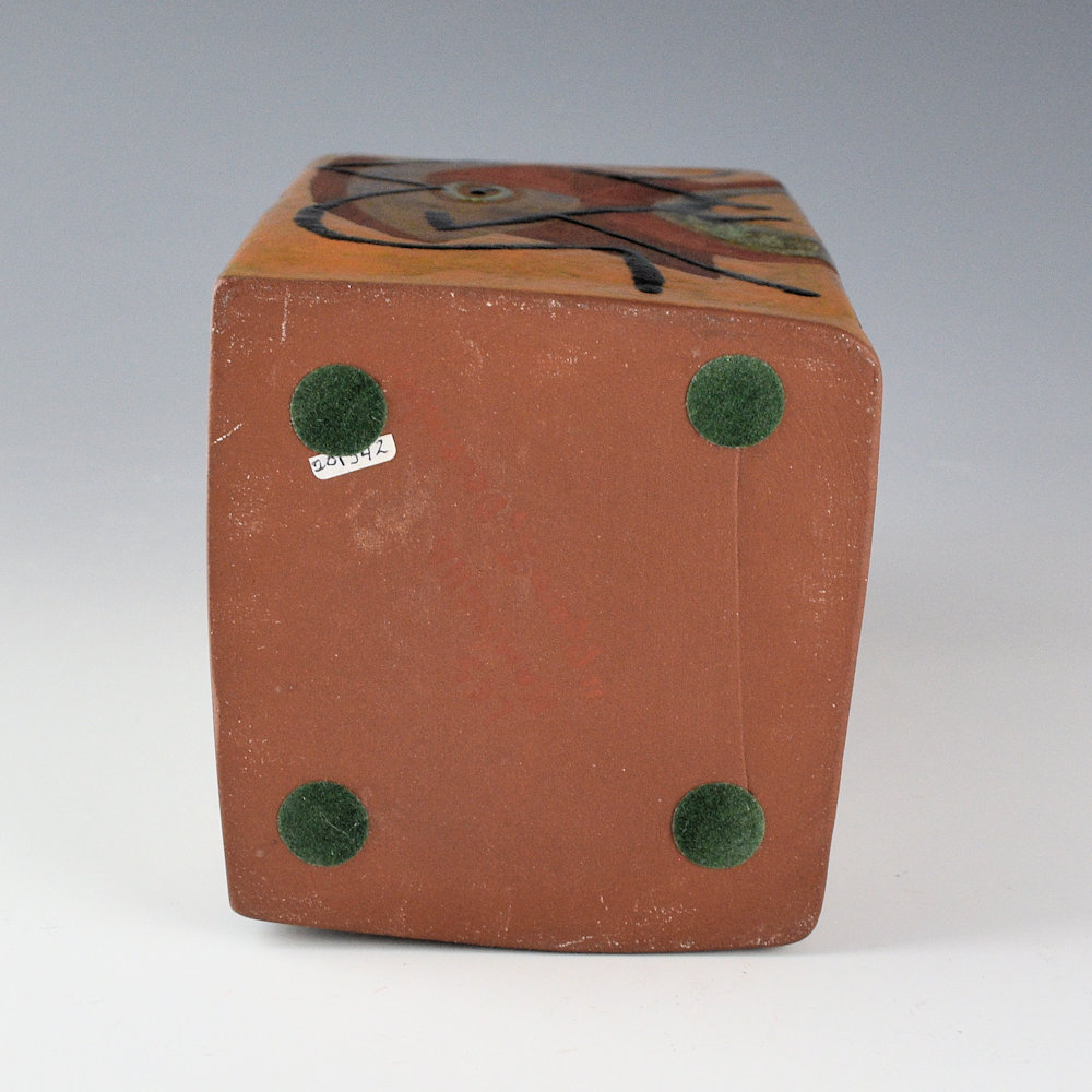 This is a creative and unusual jar by Les Namingha from 2015. The jar has a square shape with a flat top and short neck. The piece is entitled, “Poem I, December”. It combines painted and glazed designs. The top has his geometric earth patterns. Below are stylized lines and geometric patterns. It is a creative use of shape and modernist designs. The piece is part of the evolution in Les’s pottery that began to diverge significantly from Hopi-Tewa designs in the early 2000’s. The jar is in excellent condition with no chips, cracks, restoration, or repair. It is signed, “Les Namingha”.