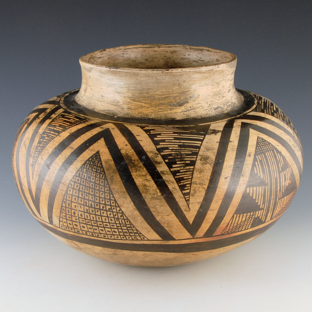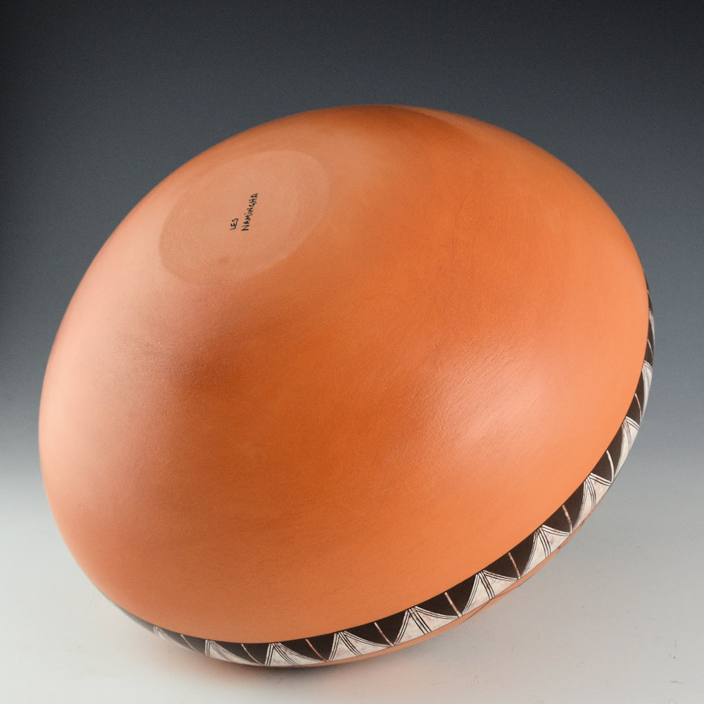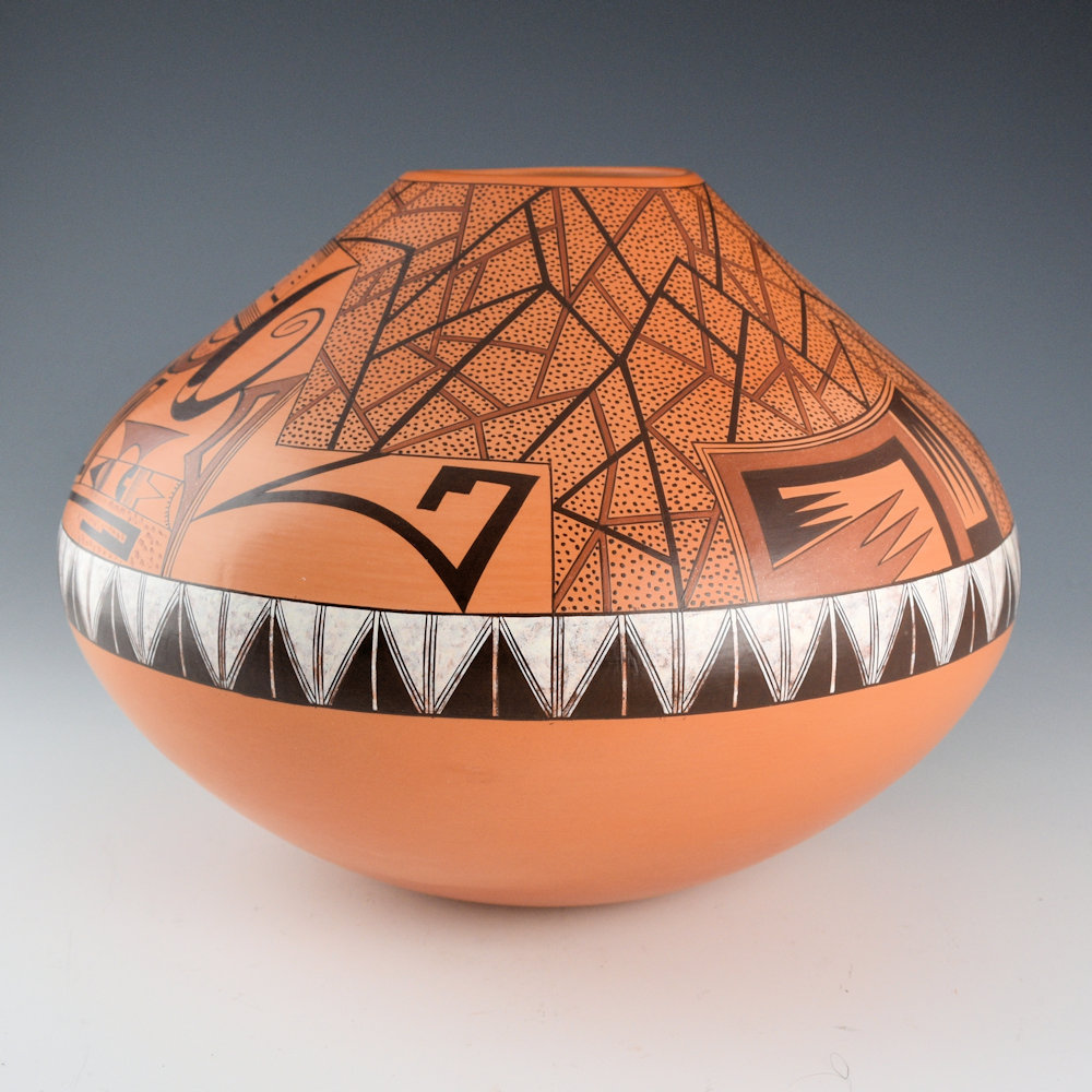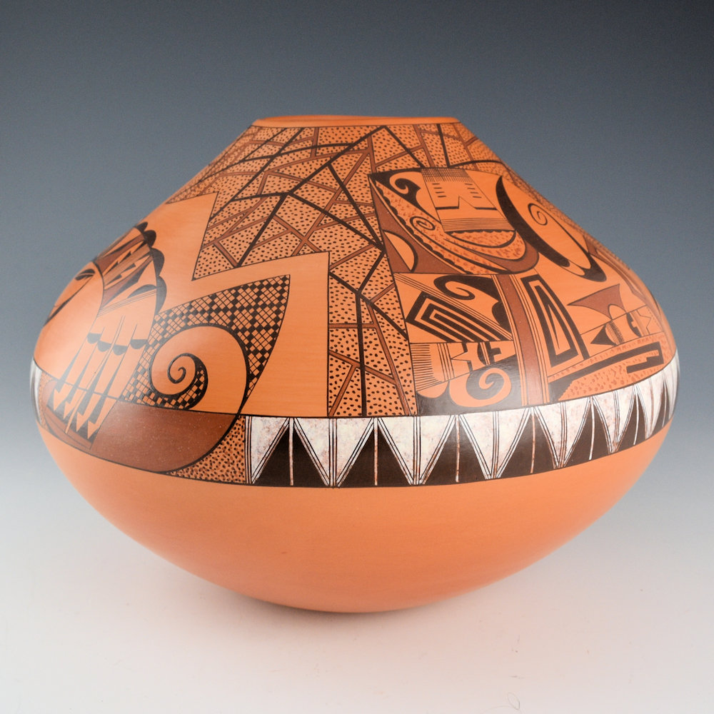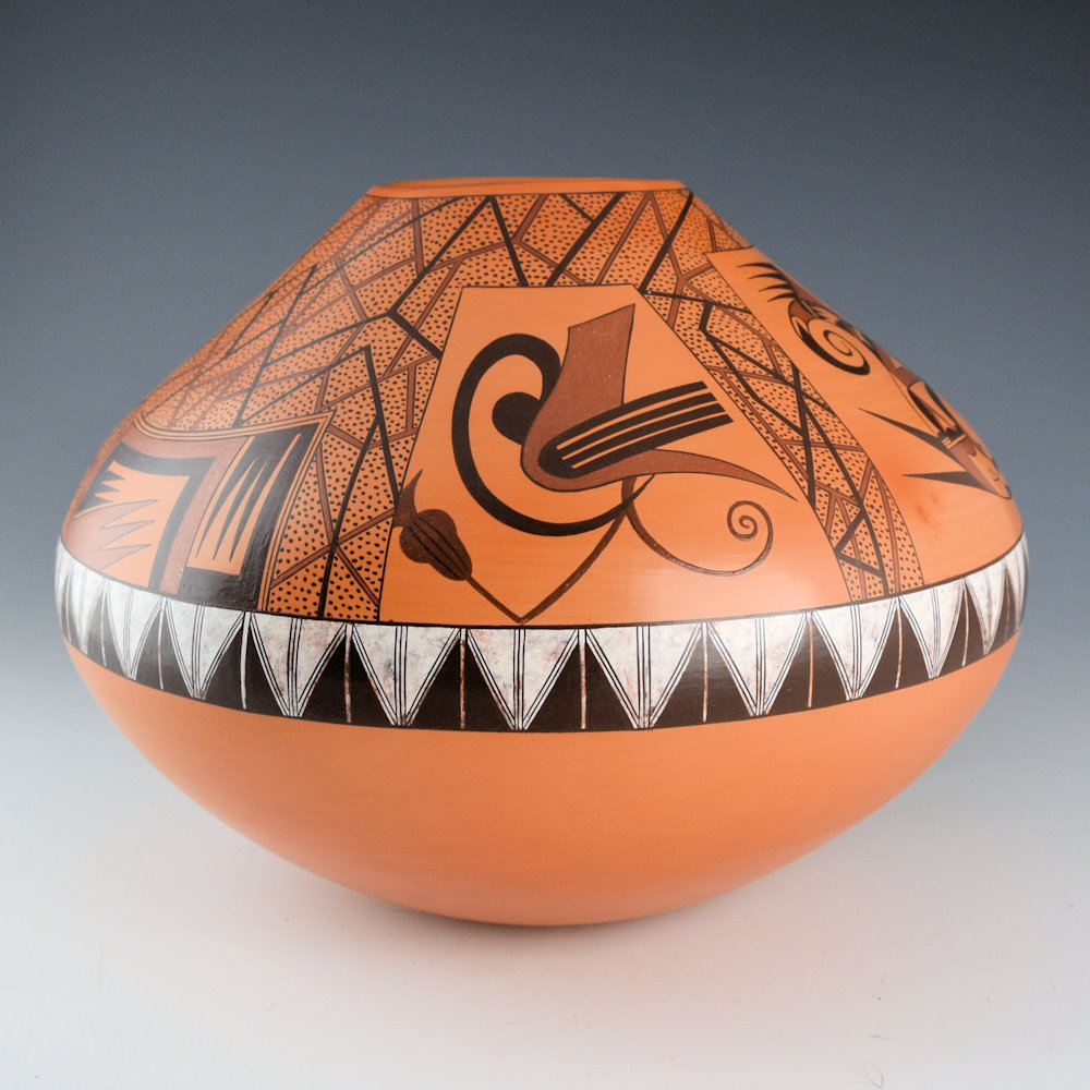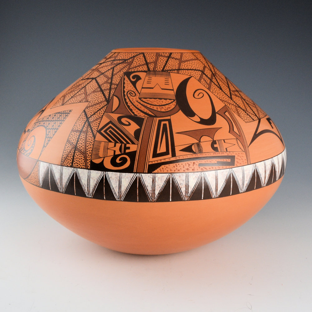 This is a striking large jar by Les Namingha. The jar is made with traditional Hopi clay and painted with mineral and clay slips. The piece is entitled “Points of Origin”, reflecting on the various design traditions in Hopi-Tewa pottery. There is a large swirling Sikyatki bird in one section. Next to it is a checkerboard pattern that is reminiscent of a period of design by Namepyo of Hano. There is another section with hummingbird and katsina faces. The final large area is a Hopi squash blossomg design. They are all connected by a tightly painted linear design with small dots. This is the work of Les Namingha and how he connects to the past traditions. Around the shoulder are rain and mountains with white clouds. The jar was traditionally fired to create the blushes on the surface. The complexity and fluid designs are a hallmark of Les’s painting strength. The jar is in excellent condition with no chips, cracks, restoration, or repair. It is signed, “Les Namingha”. The last three photos are for reference, in terms of the imagery on the jar. There is a Hummingbird design peice by Dextra Quotskuyva, a checkerboard design piece by Nampeyo of Hano, and a squash plant design jar by Mark Tahbo. I think it is interesting to see how other artists have used this imagery on thier pottery.