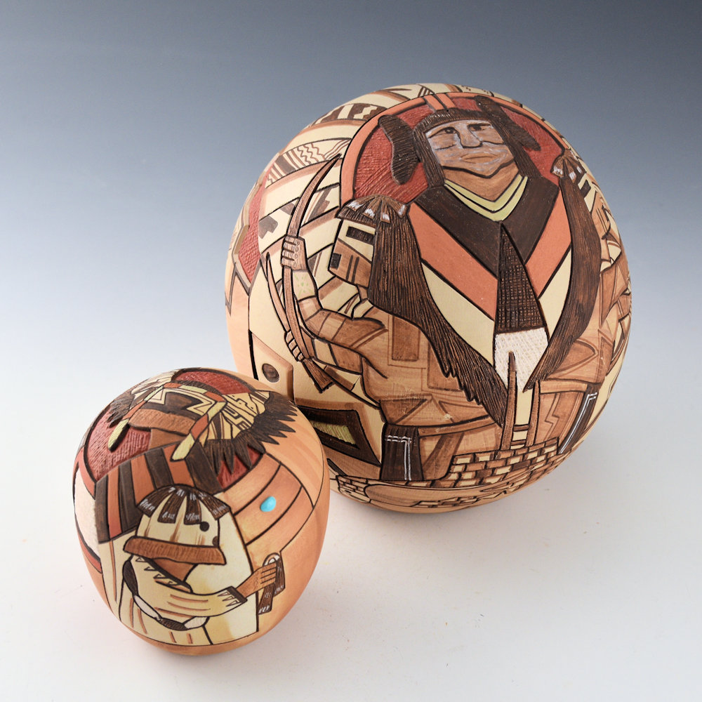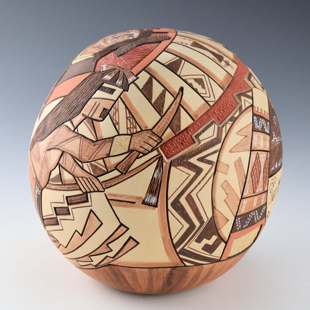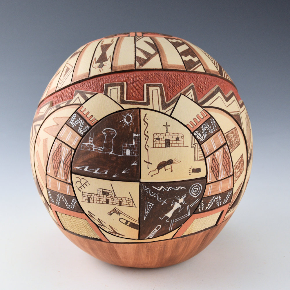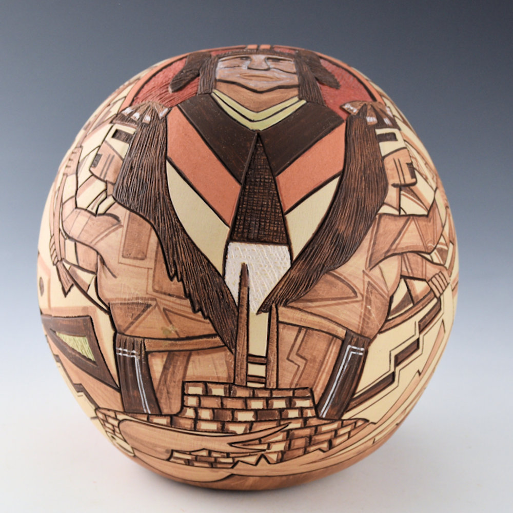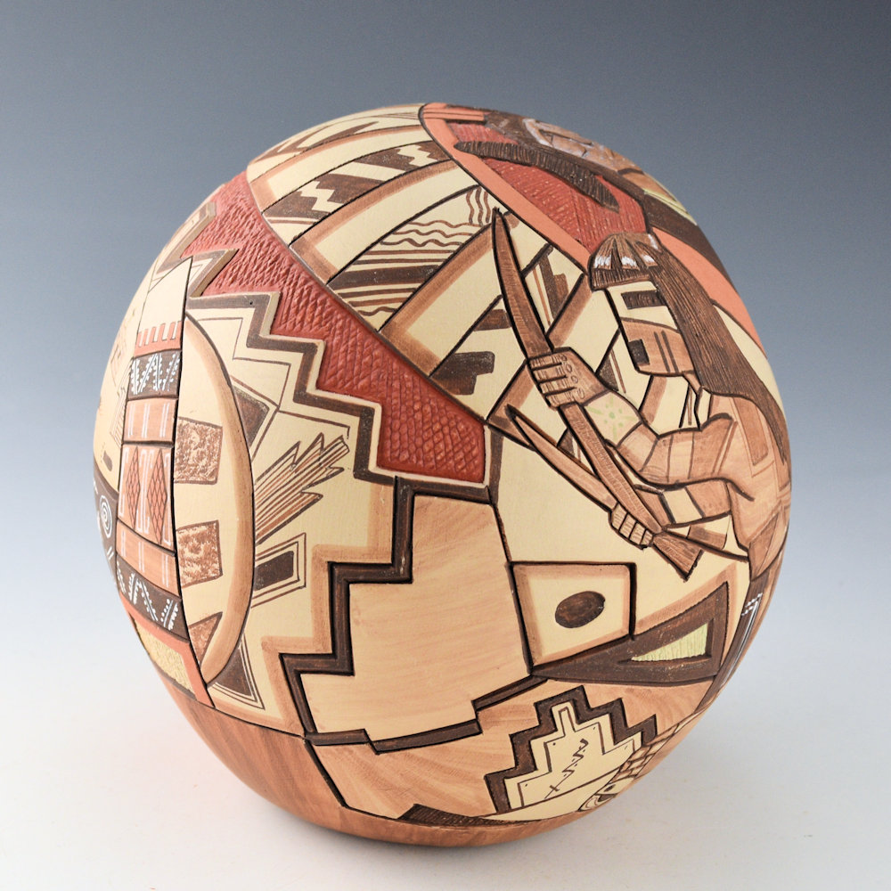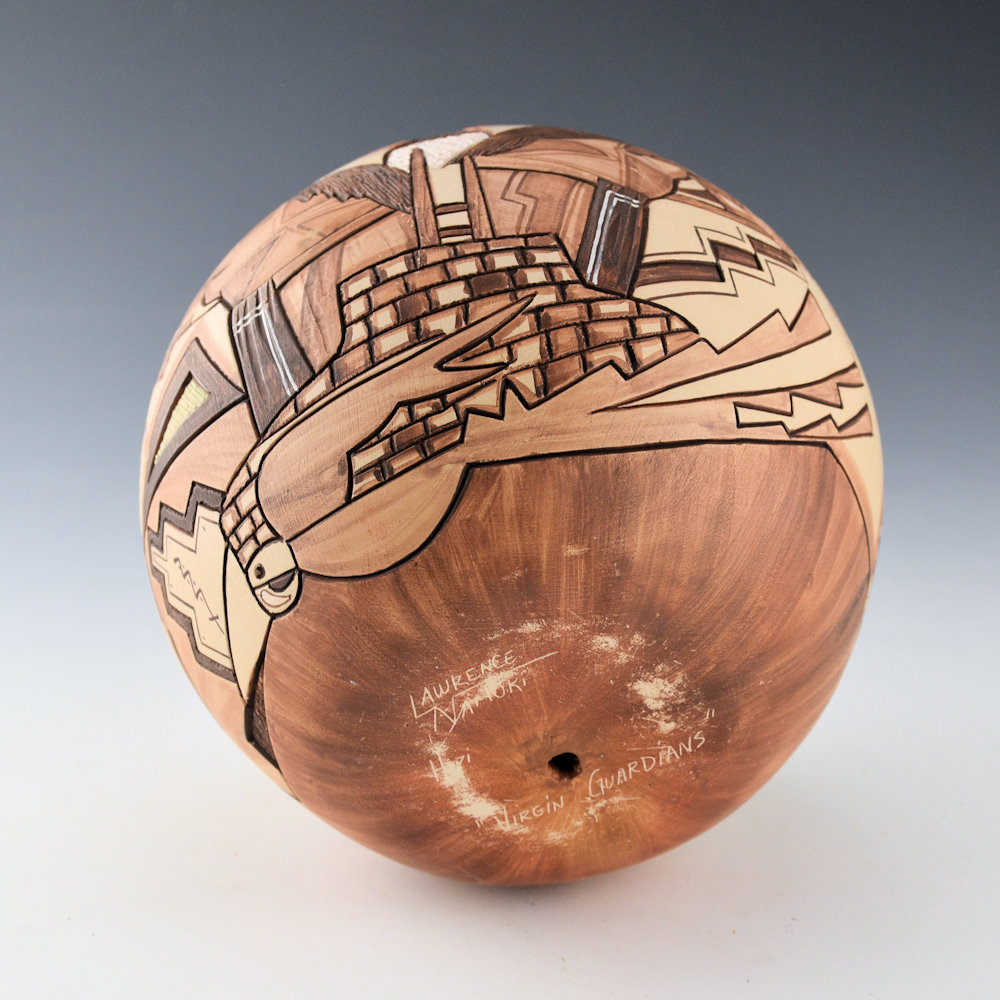 Lawrence Namoki was known for the variety of styles of his pottery. While he began with deeply carved pottery, he ended his career by creating delicately painted vessels. This piece is entitled, “Virgin Guardians”. There is a Hopi maiden on the front/top of the piece. In front of her are two Hano Katsinas, who are her guardians. Below is the kiva with the ladder. Surrounding her is a sun with painted feathers. The back of the piece is interesting with a large medallion, designed in four sections. The to left is Walpi (with the famous rock formation). There is on with a church, one with the Hopi building and corn, and the last is the universe. It is surrounded by a double shawl. It is a very complex and interesting piece! The piece highlighted with additional clay slips for coloration. The seedpot is signed on the bottom, “Lawrence Namoki”. It is in very good condition with no chips, cracks, restoration or repair.