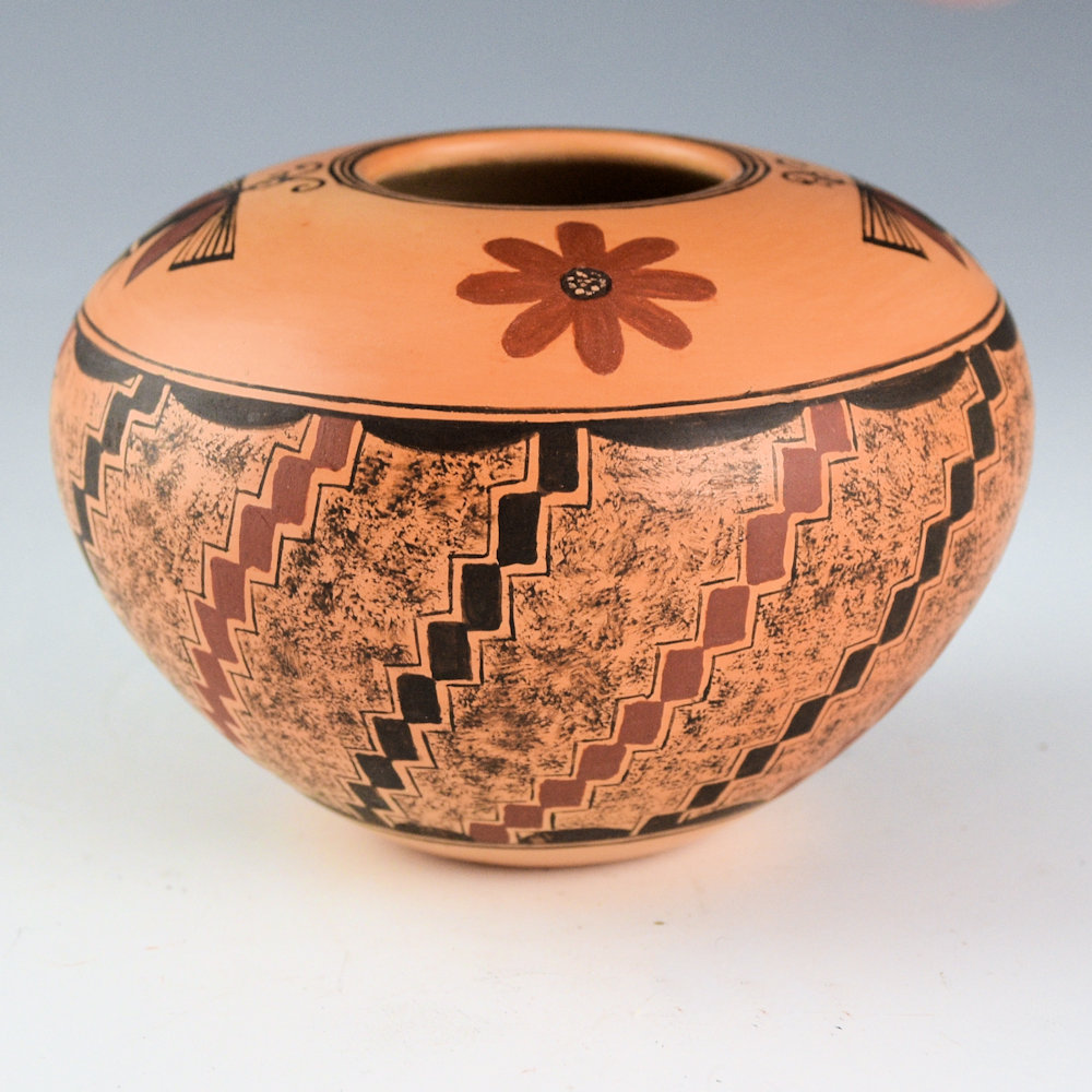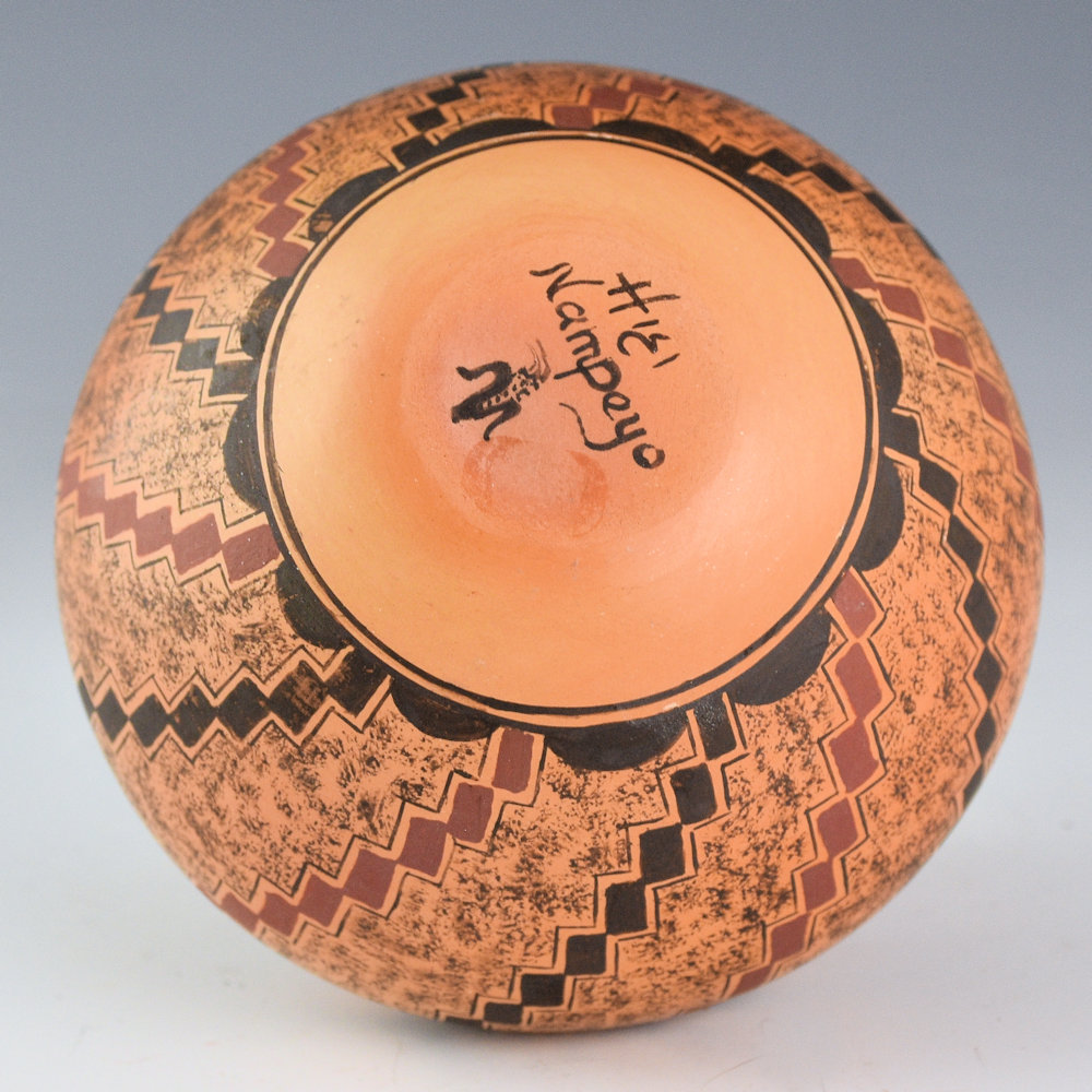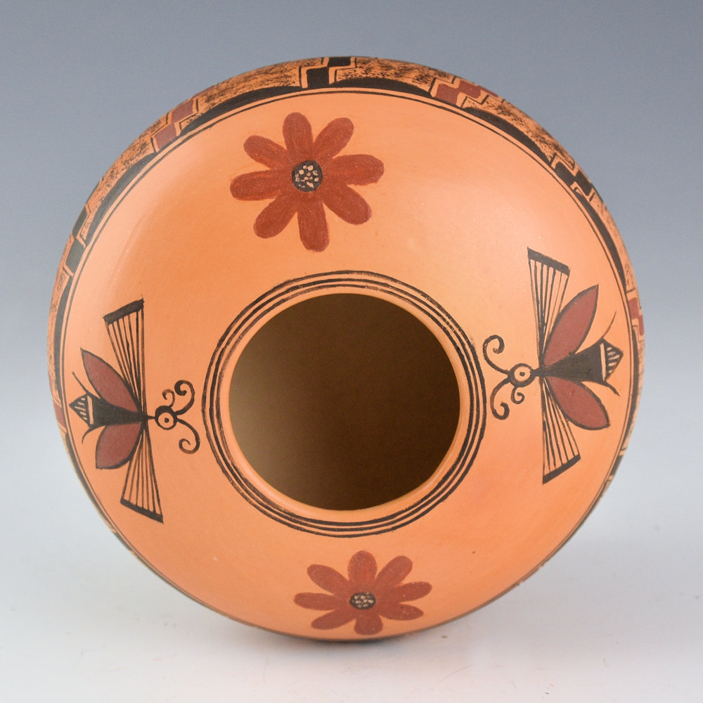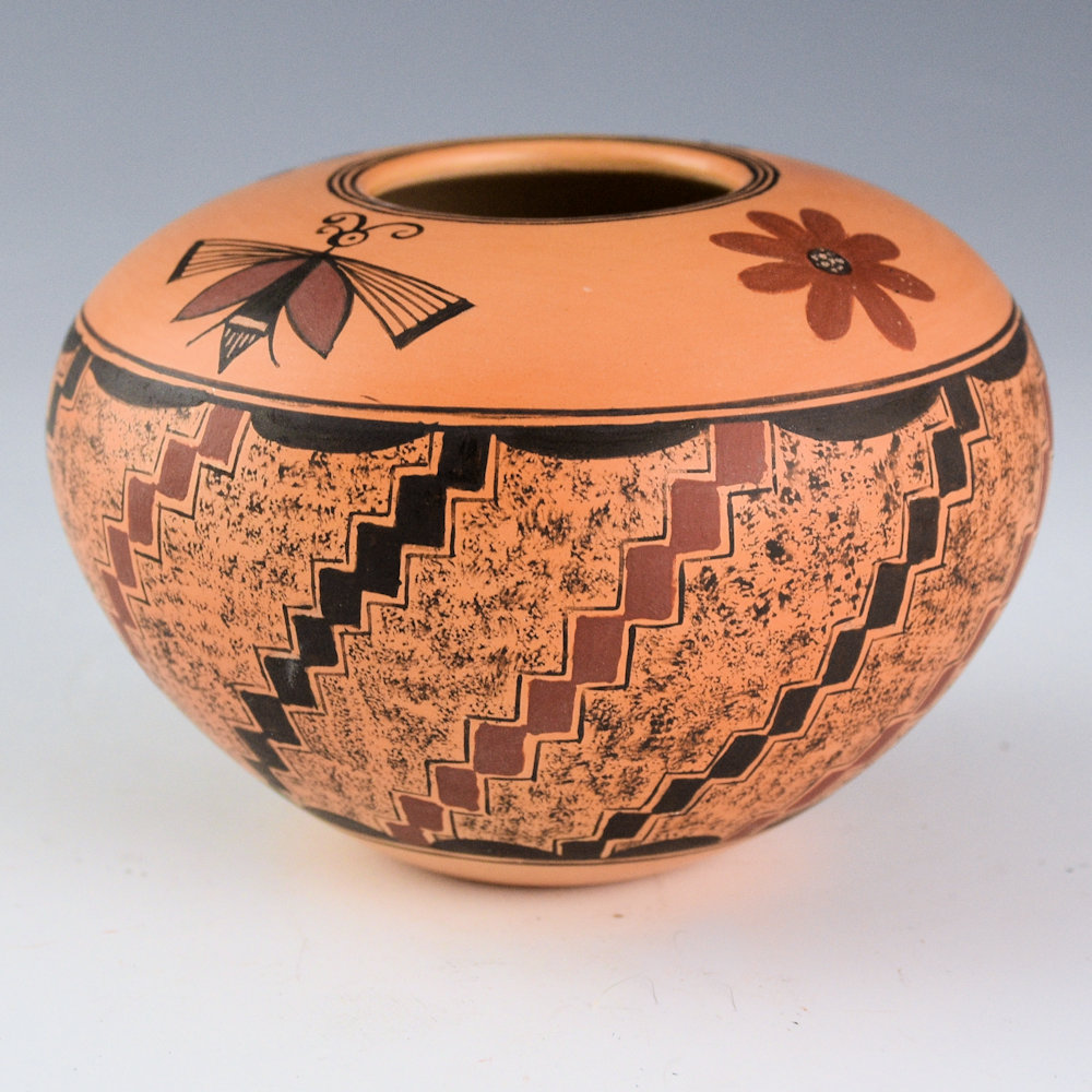 Camille “Hisi” Quotskuyva learned to make pottery from her mother, Dextra Quotskuyva, a sister of noted painter Dan Namingha and a descendant of Nampeyo of Hano, Annie Healing and Rachel Nampeyo. She is known for her use of traditional imagery and the delicate painting of her designs. This bowl is a classic round shape. The top is painted with two butterflies and two flowers. The side of the bowl has a more complex checkerboard lightning design. The bowl is painted with bee-weed and red clay slip. The bowl was traditionally fired to create the blushes on the surface. The piece is signed on the bottom, “Hisi Nampeyo” and a corn plant for Corn Clan. Note the subtle variations in color from the firing. It is in excellent condition with no chips, cracks, restoration or repair.