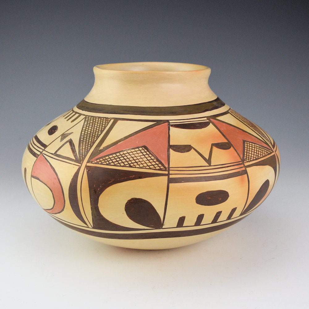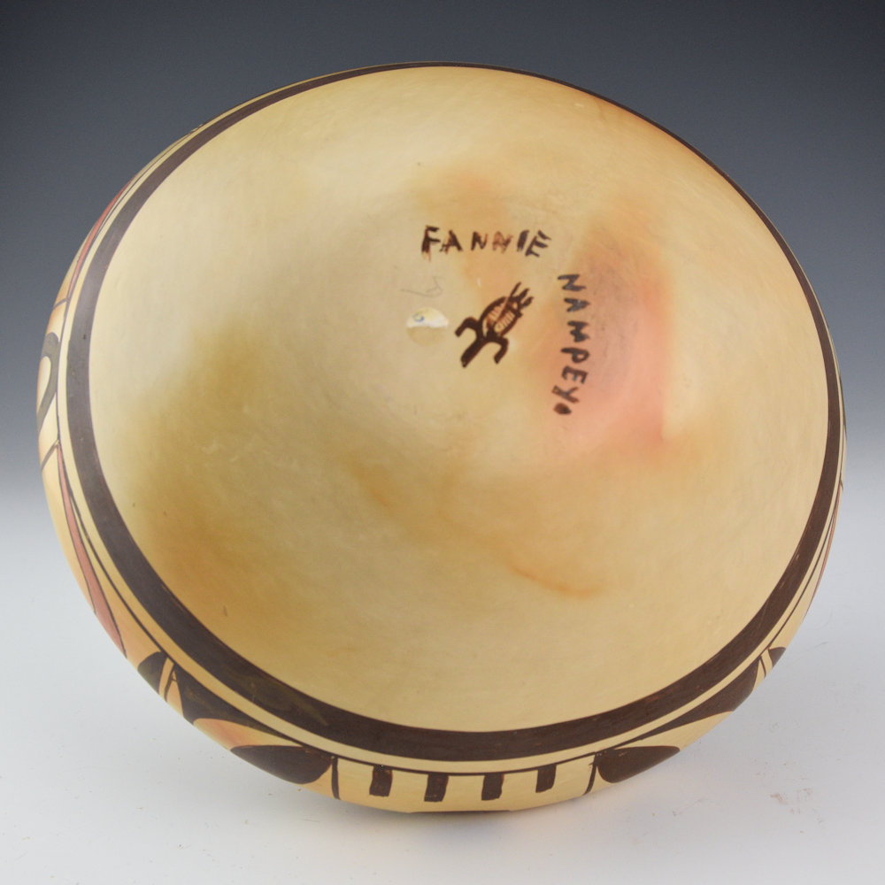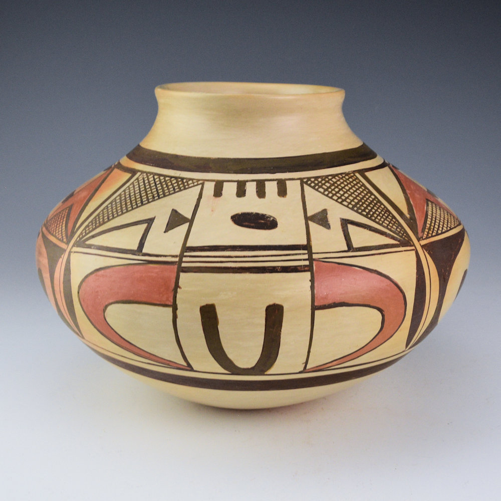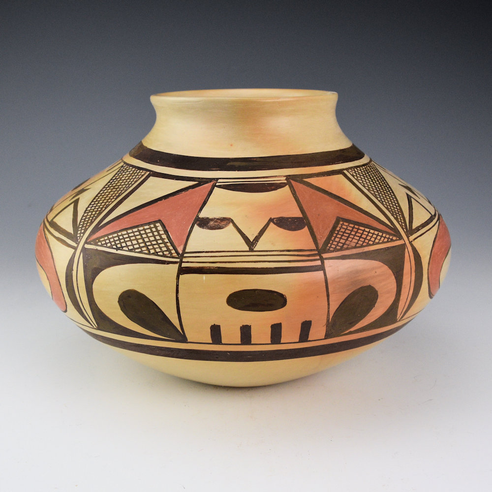 Fannie Nampeyo was the youngest daughter of noted potter Nampeyo of Hano and also the mother of noted potters Iris Nampeyo, Leah Nampeyo, and Thomas Polacca. She was certainly among the most skilled of her generation in painting and designing pottery. This jar has sloping sides and a short neck. The piece was coil-built and painted with bee-weed (black) and red clay for accents. The design is one that is a classic in the pottery of Nampeyo of Hano. There are alternating Katsina faces and birds. The piece is very finely painted with thin lines and delicate imagery across the surface. It was traditionally fired to create the blushes on the surface. It is signed, “Fannie Nampeyo” with an ear of corn to represent Corn Clan. It is in excellent condition with no chips, cracks, restoration or repair.