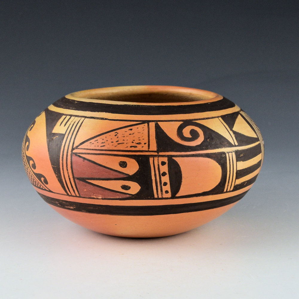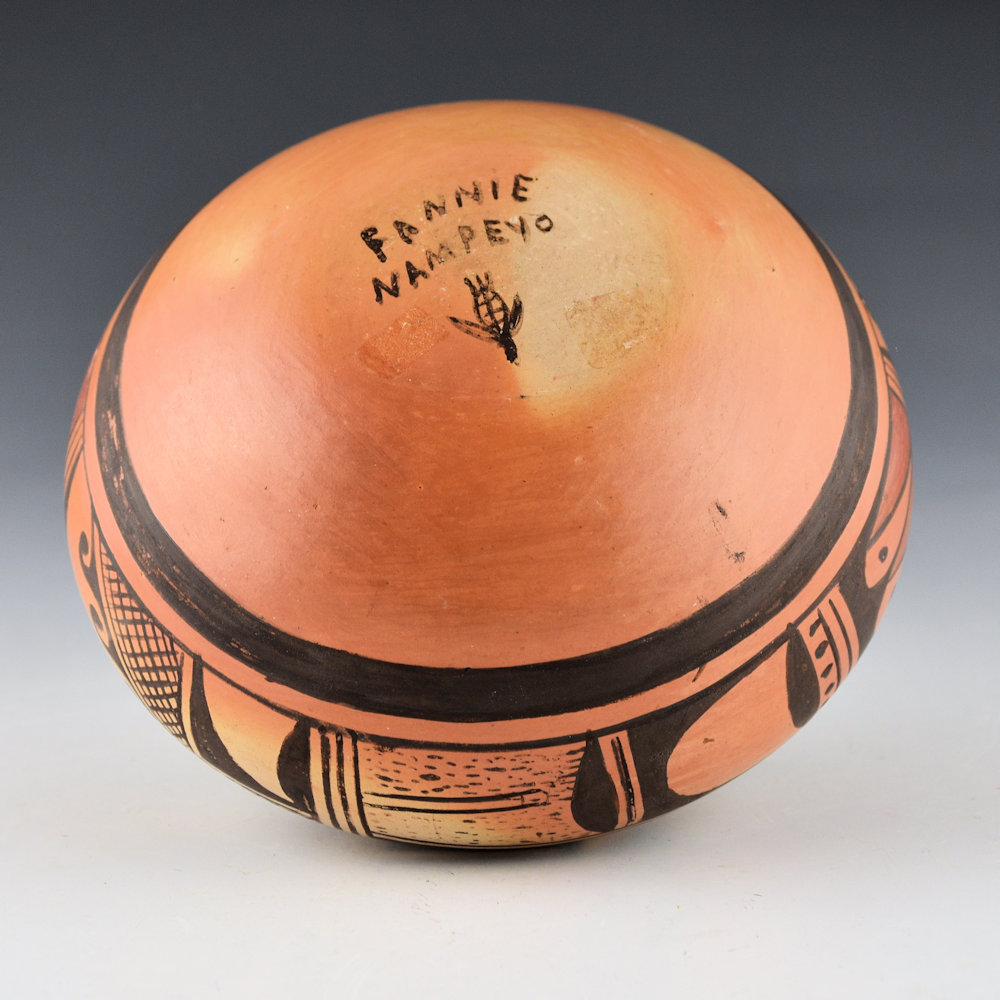 This is a classic bowl by Fannie Nampeyo. She was the youngest daughter of noted potter Nampeyo of Hano and also the mother of noted potters Iris Nampeyo, Leah Nampeyo, and Thomas Polacca. She was certainly among the most skilled of her generation for painting and pottery designs. The bowl is round in shape and the entire surface is fully polished. The bowl has a river and cloud design painted across the surface. The design is painted with bee-weed (black) and has thin lines to accentuate the imagery. The bowl was traditionally fired so that it has some visually striking blushes on the surface. It is signed on the bottom, “Fannie Nampeyo,” and a corn plant representing the corn clan. It is in excellent condition with no chips, cracks, restoration, or repair.