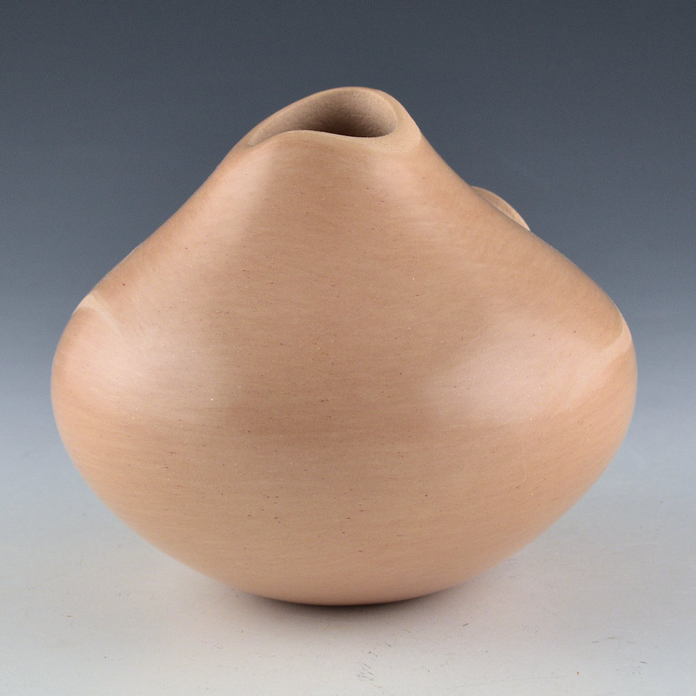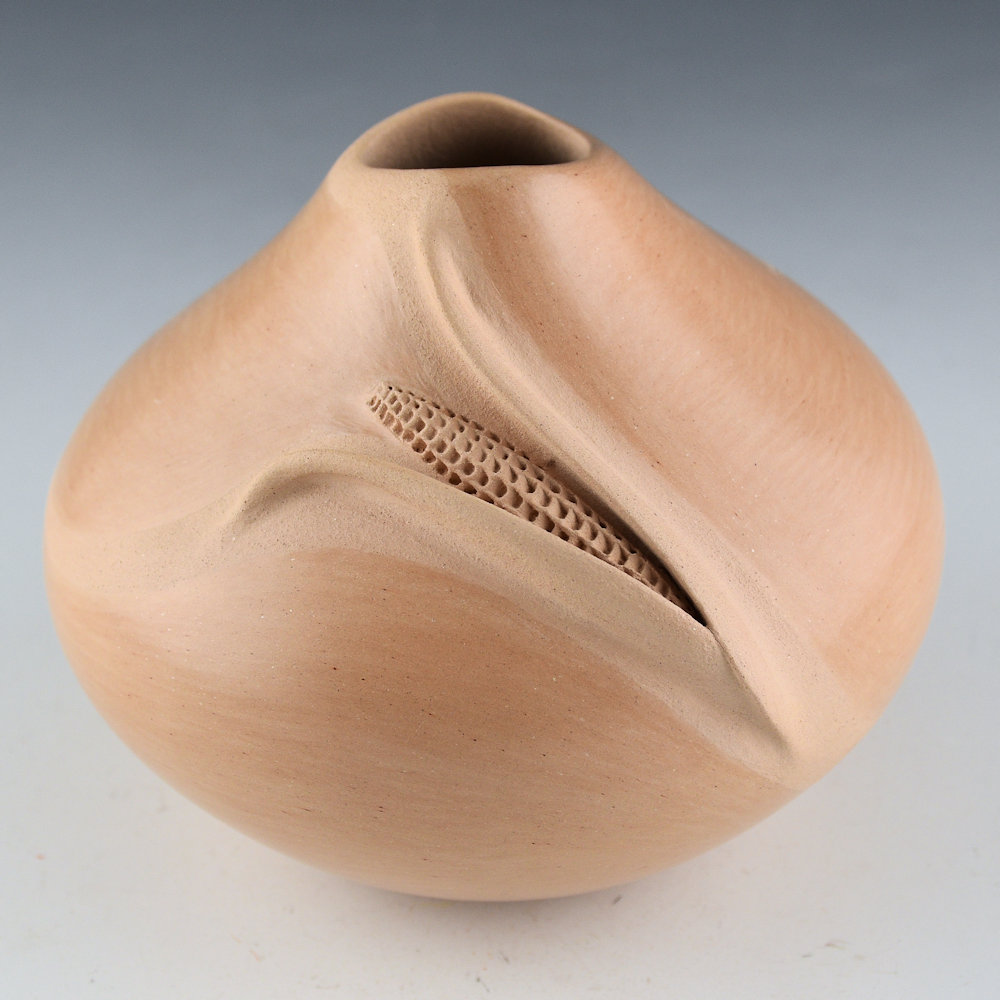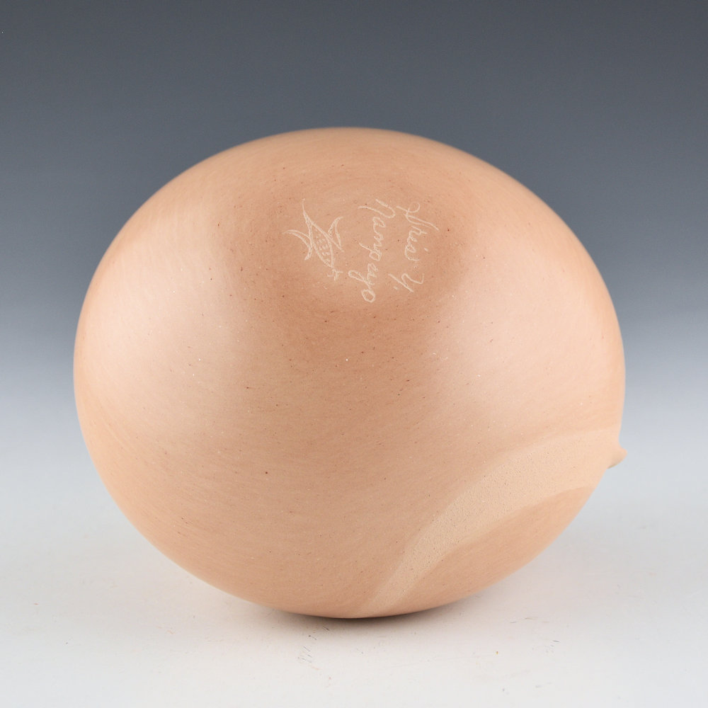Iris Nampeyo was a daughter of Fannie Nampeyo and was well known for her elegant asymmetrical vessels with corn as part of the design in relief. Iris began using the corn in relief on the surface of her pottery in the early 1980s. The corn is symbolic of being part of the Corn Clan. The surface of the jar is stone polished and there is an ear of corn in relief. The husk is sharp-edged and matte, with flowing sections that extend around the jar. The opening is asymmetrical, which is in keeping with the organic style of the form. There is simplicity and elegance in her pottery. Iris’s pottery remains a classic among Hopi-Tewa pottery. This jar is signed on the bottom in the clay, “Iris Nampeyo” and it is in excellent condition with no chips, cracks, restoration, or repair.