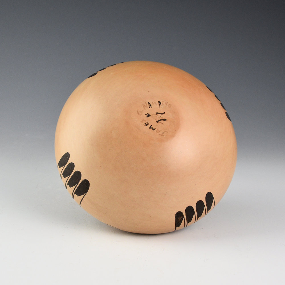 James Garcia Nampeyo was a son of Leah Garcia Nampeyo, a grandson of Fannie Nampeyo, and a great-grandson of Nampeyo of Hano. This is a classic wide shoulder jar with a short neck. The top is painted with red clay. The design is an eagle tail pattern that extends over the shoulder. There is a lot of great detail in the design. The black is bee-weed (a plant). The jar was traditionally fired to give it the coloration with some slight blushes. It is signed on the bottom, “James G. Nampeyo”. It is in very good condition with no chips, cracks, restoration or repair.