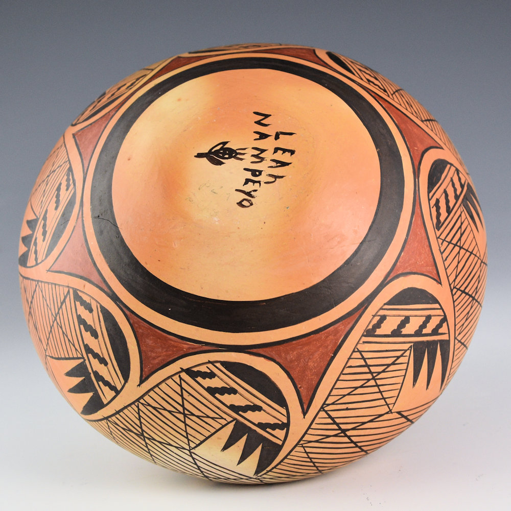 Leah Garcia Nampeyo was a daughter of noted potter Fannie Nampeyo. This jar is a classic shape with a round shoulder and a slightly turned-out rim. The jar is fully polished and then painted with bee-weed and red clay. The jar has the classic migration pattern that is painted around the body of the piece. This is a design that was made famous by Leah’s grandmother, Nampeyo of Hano. The imagery of the migration pattern has a series of bird wings and thin lines. There are eight wings above the shoulder and eight below, for a total of 16. The jar was traditionally fired, so there are blushes and fireclouds around the surface, which add to the overall appearance of the jar. It is signed on the bottom, “Leah Nampeyo”. It is in excellent condition with no chips, cracks, restoration or repair. Surprisingly, I didn’t realize how few pieces of her work we have had over the years. I looked back and since 2000 we have had less than ten pieces come through the gallery!