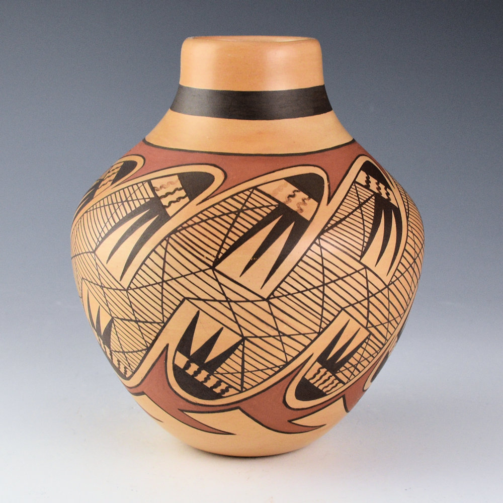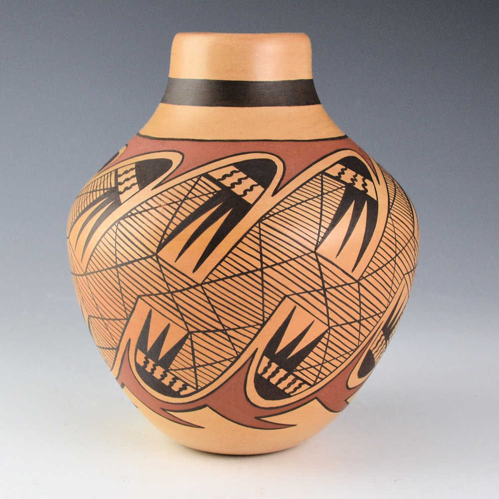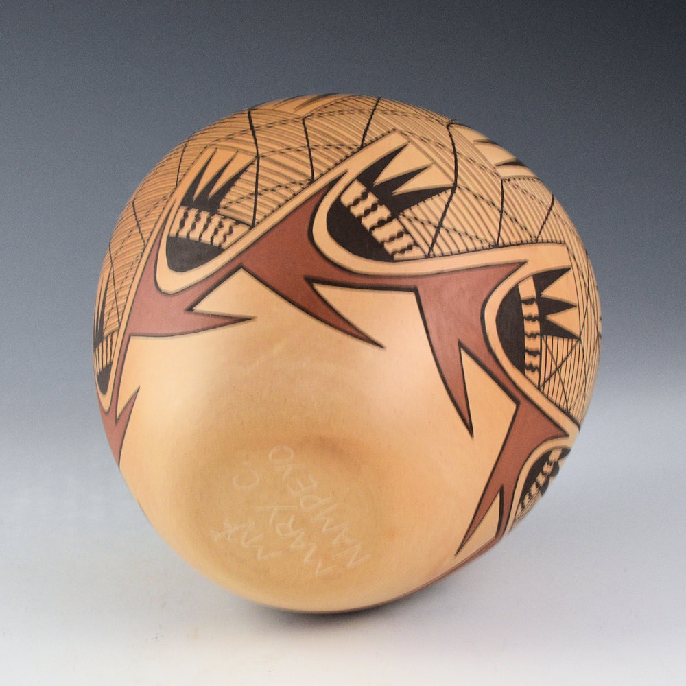 Mary C. Nampyo is a great-great-granddaughter of Nampeyo of Hano and a great-granddaughter of Nellie Nampeyo. This jar is painted with bee-weed and red clay slip. It has a classic migration pattern painted onto the piece. There are eight bird wings above the shoulder, and eight below for a total of 16. This is a design that is seen on the pottery of Nampeyo of Hano. The jar is signed, “Mary C. Nampeyo”. It is in excellent condition with no chips, cracks, restoration, or repair.