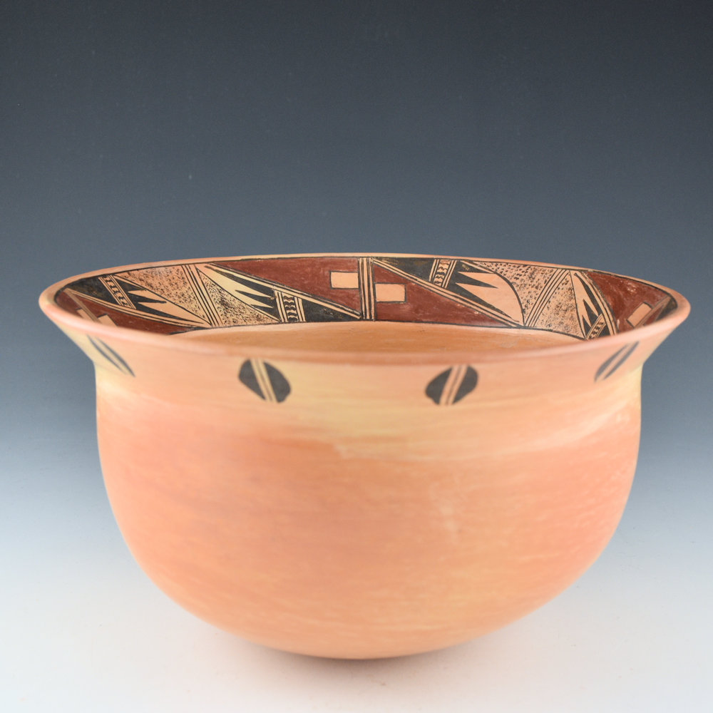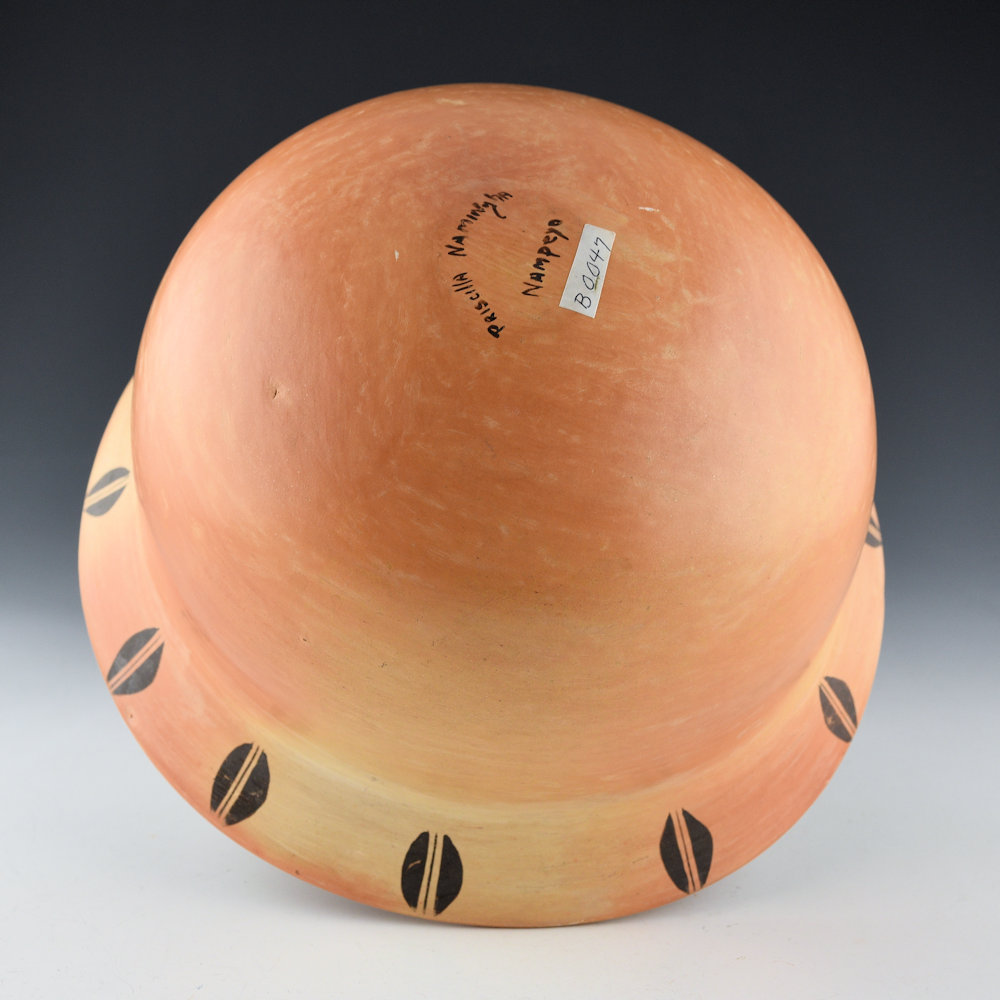 Priscilla Namingha Nampeyo was a great-granddaughter of Nampeyo of Hano and granddaughter of Annie Healing. Priscilla began making pottery when she was only seven years old, under the guidance of Nampeyo of Hano. The shape of this piece is a traditional “stew bowl” with a turned out rim. The enfire piece is fully polished. The interior of the rim is painted with rain and bird wing designs. The exterior of the rim has seed designs. It is painted with bee-weed (a plant) for the black, and the red is an additional clay.The bowl was traditionally fired, so there are striking blushes on the surface. Priscilla was known for her traditional designs, along with the tightly painted designs. It is signed on the bottom “Priscilla Namingha Nampeyo”. It is in excellent condition with no chips, cracks, restoration, or repair. It is nice to see such a large and classic-designed piece of her work in the gallery!