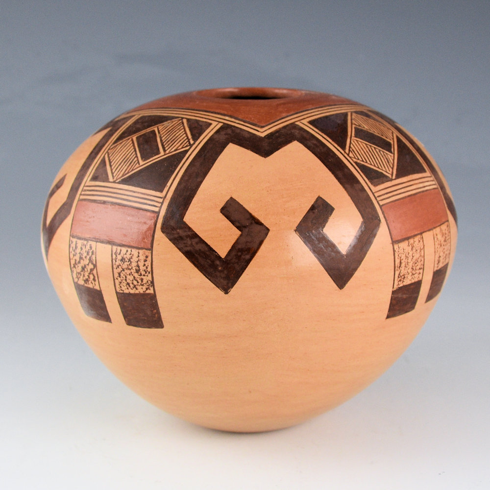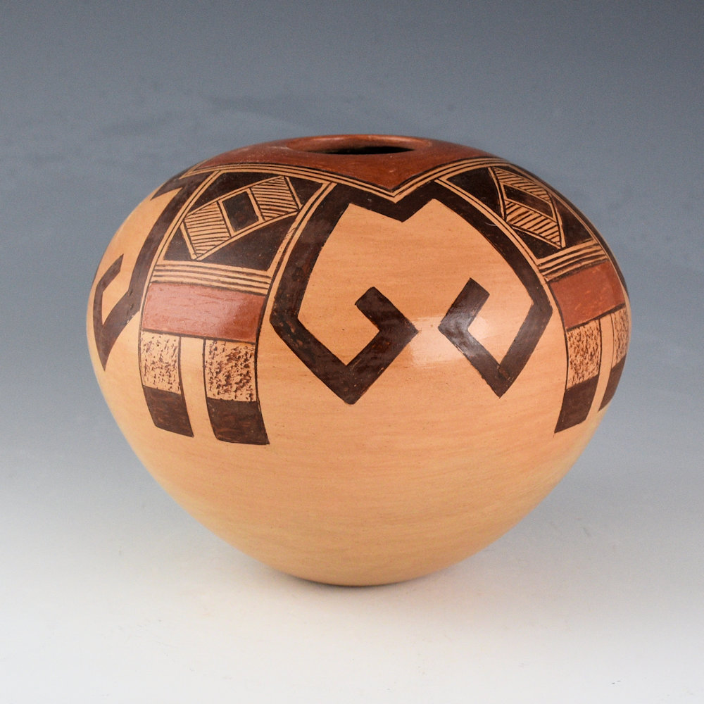 This is an unusual bowl by Tonita Nampeyo. She was a daughter of Fannie Nampeyo and a granddaughter of Nampeyo of Hano. She was known for her traditional pottery using natural clay slips and bee-weed for the black. This bowl is coil-built, thin-walled, and painted with bee-weed (black) and a red clay slip. The bowl is round in shape, but what makes it unusual is the design. It is a modernized eagle tail pattern. Note how the wings are angular, the back of the tail has an off-center rectangle. It give the piece a very modern appearance to a very historic design. The bowl was traditionally fired for the striking coloration of the blushes. It is in excellent condition with no chips, cracks, restoration, or repair. It is signed on the bottom, “Tonita Nampeyo”. The corn plant signifies that she is part of the Corn Clan.