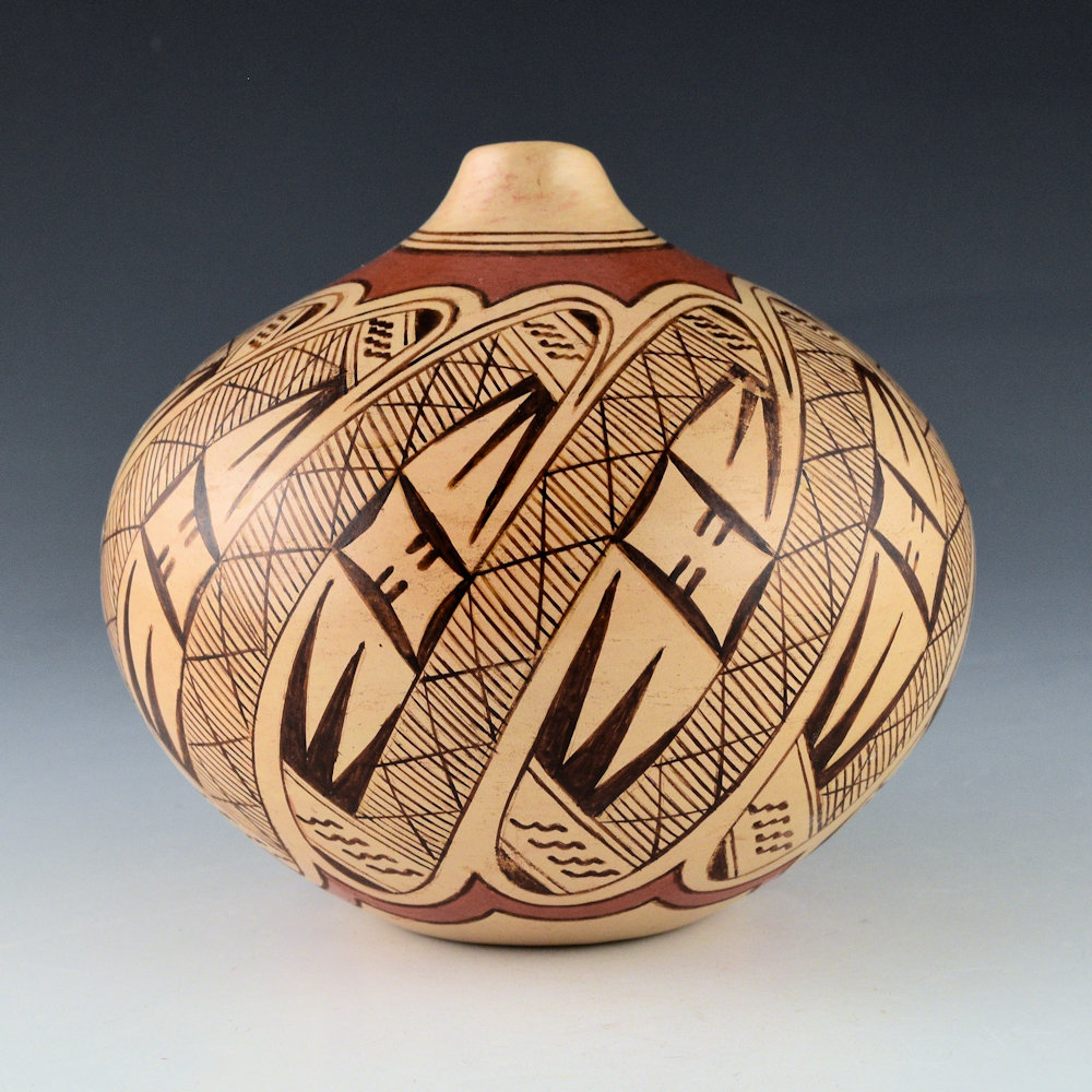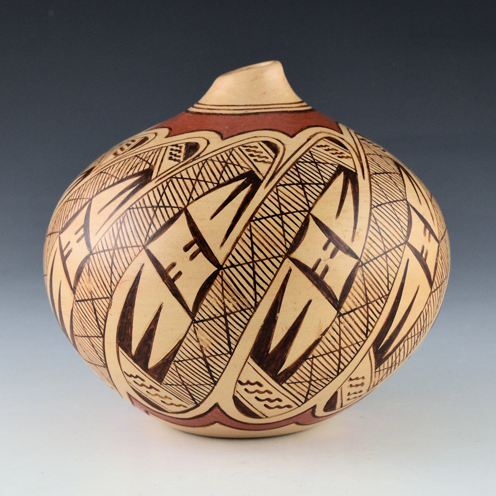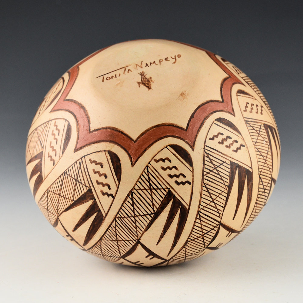Tonita Nampeyo is a daughter of Fannie Nampeyo and a granddaughter of Nampeyo of Hano. She is known for her traditional pottery, which uses natural clay slips and bee-weed for blacks. This jar is an elegant shape with a round shoulder and a short neck. The jar has a classic “migration pattern” painted around the shoulder. The design was revived by Nampeyo of Hano in the late 1800s from ancient Sikyatki pottery of the 1400-1600 period. The design consists of interlocking bird wings and thin lines. This jar has ten wings above the shoulder and ten below, for a total of 20! In addition, there are all the thin lines connecting the wings. It is traditionally fired, creating light blushes on the surface. It is signed, ‘Tonita Nampeyo” and a corn plant for Corn Clan. It is in excellent condition with no chips, cracks, restoration or repair.