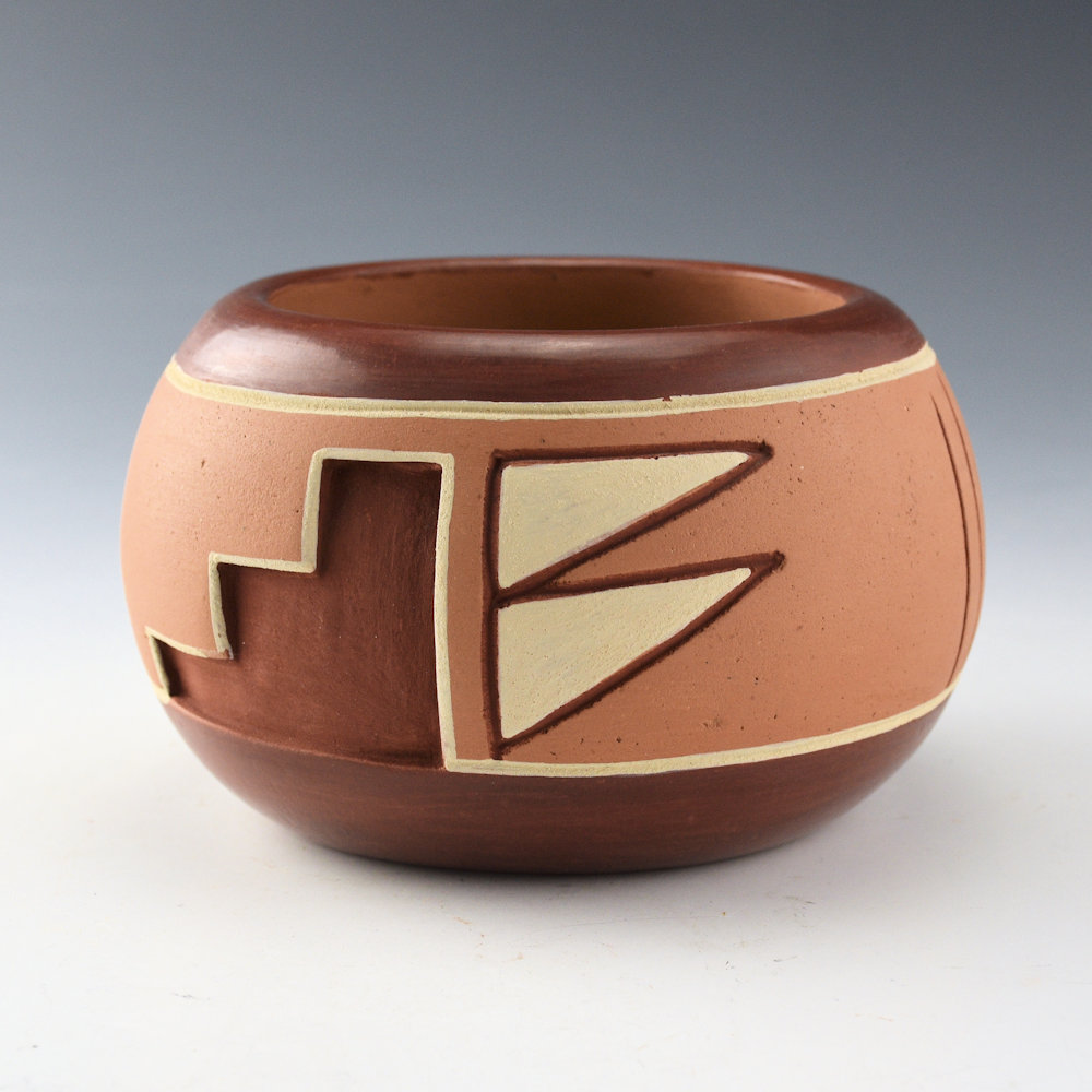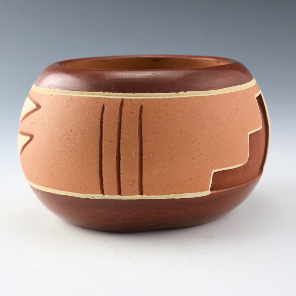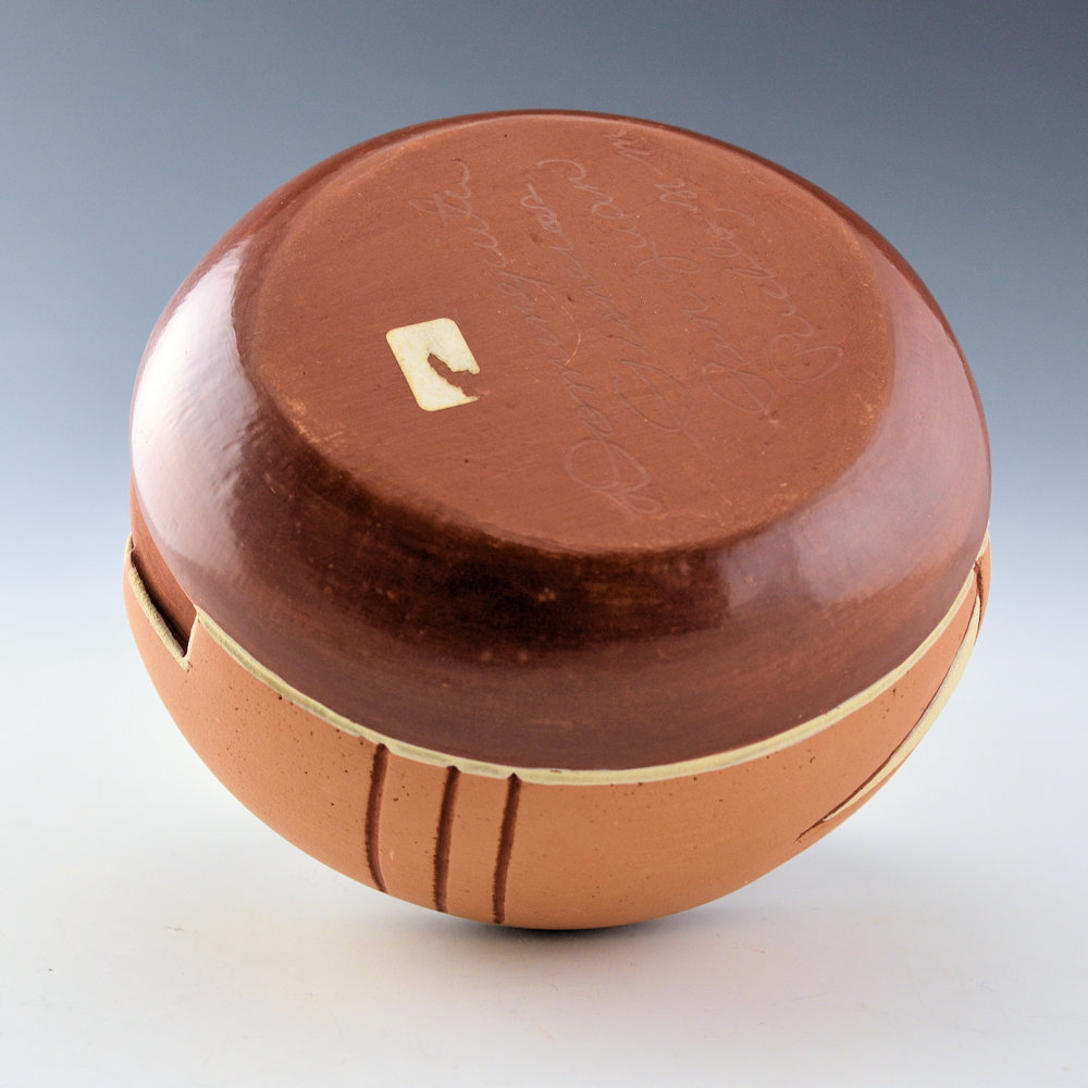 Dominguita Sisneros Naranjo is a daughter of noted Ohkay Owingeh potter Tomasita Montoya and a sister of Rosita de Herrera. This bowl is coil-built and polished a deep red on the neck and the base. The central band is deeply carved with clouds and rain designs. The designs are higlighted with red and white clay slips. This color combination is visually striking and enhances the design. It is signed on the bottom in the clay, “Dominguita Sisneros”. It is in excellent condition with no chips, cracks, restoration or repair.