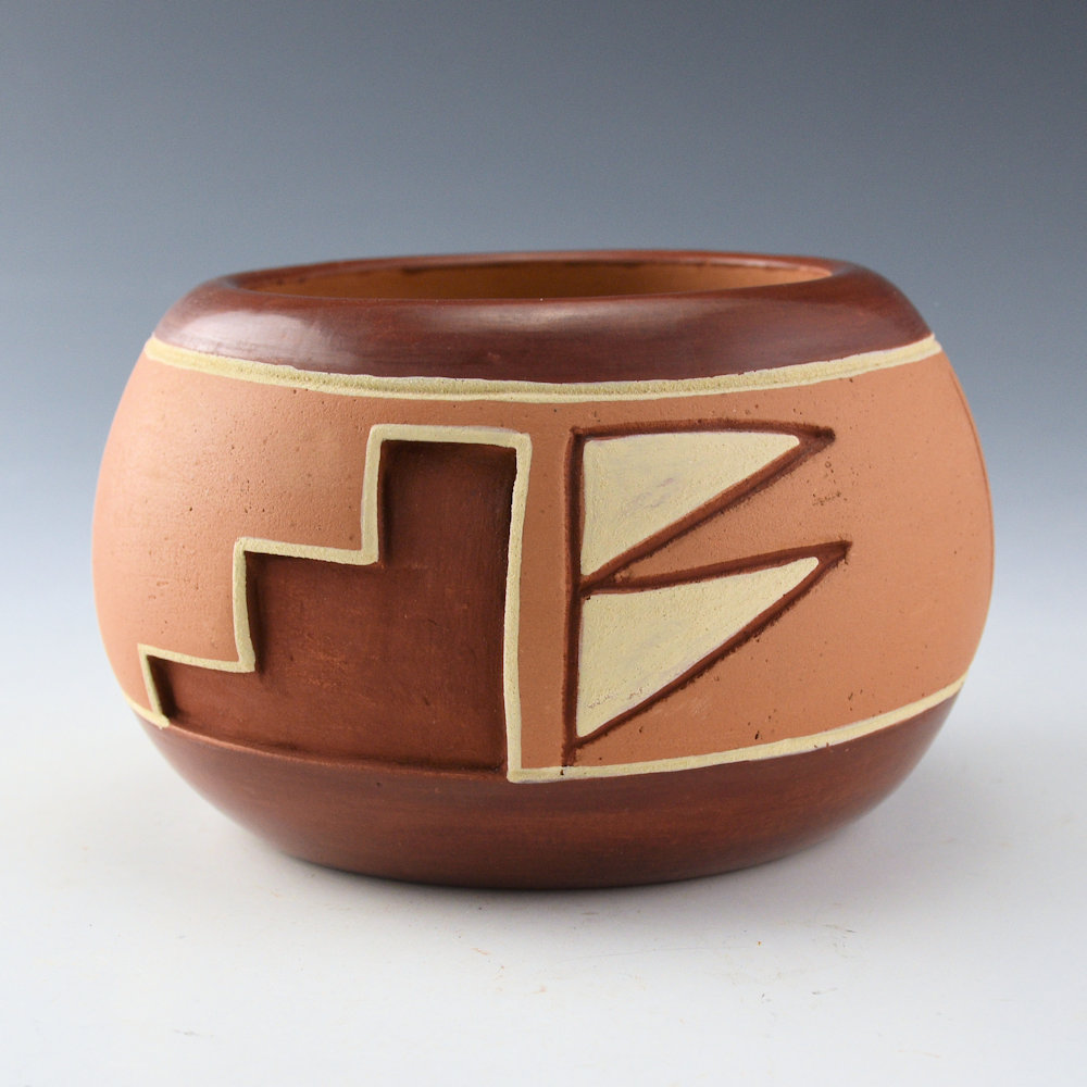 Dominguita Sisneros Naranjo is a daughter of noted Okay Owingeh potter Tomasita Montoya and a sister of Rosita de Herrera. She is known for her use of deeply carved and incised designs along with classic pueblo imagery.