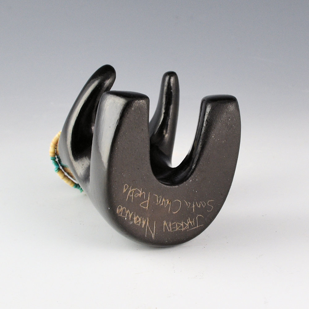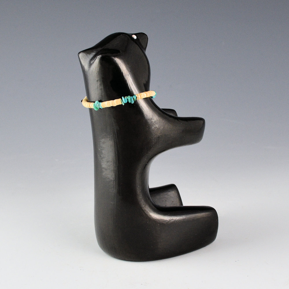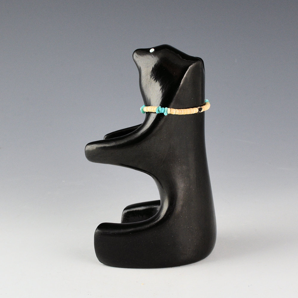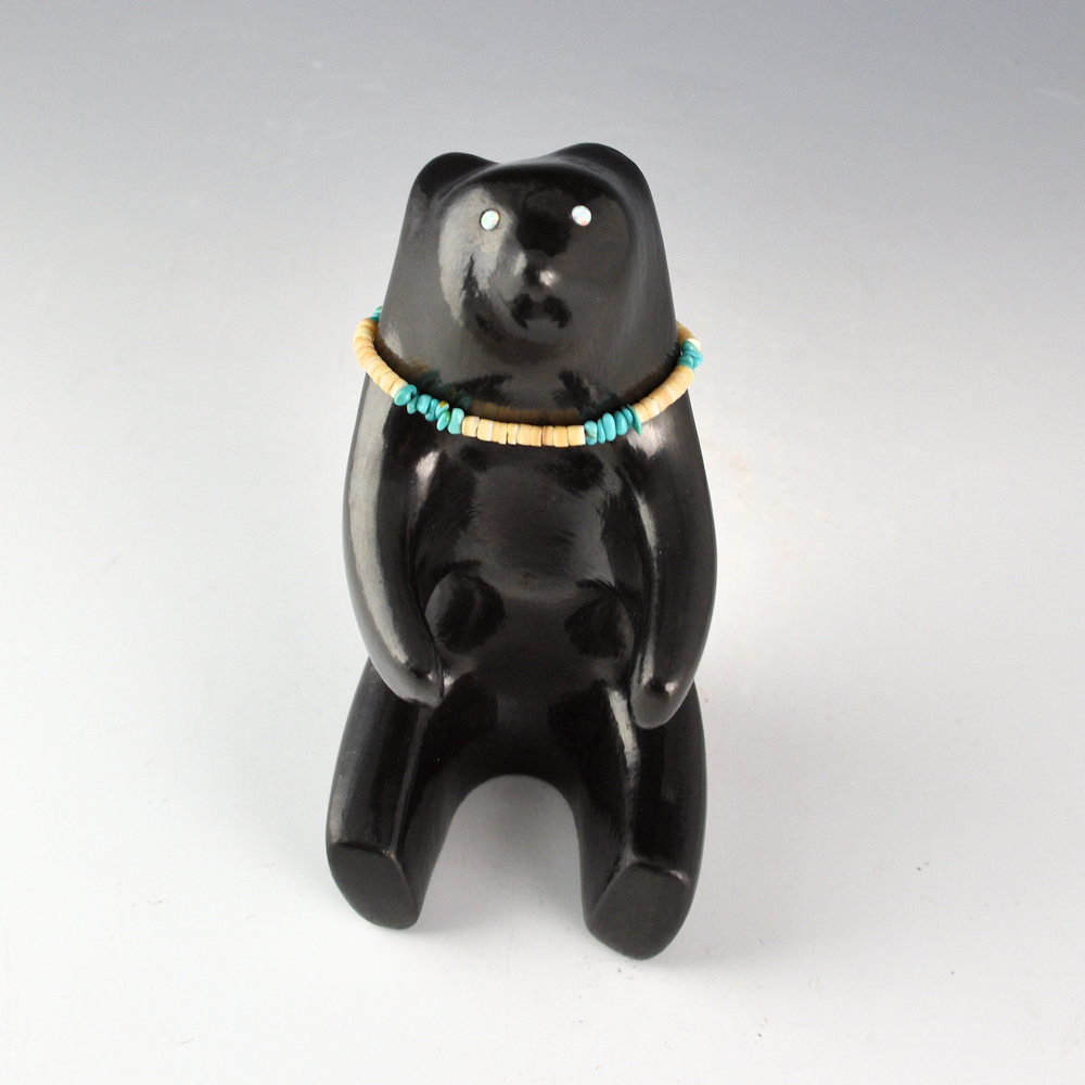 Jarren Naranjo (b. 1996) is a grandson of Flora Naranjo and a son of Sammy Naranjo. Each piece is made from native clay, stone polished and traditionally fired black. Jarren said this is one of the largest sitting bears. The bear is made from clay, and it is sitting upright on its back legs. His bears have a very sculptural appearance with angular faces. Note how the entire piece, even the bottom, is fully polished! There are inset opal eyes and a turquoise and shell necklace! The bear is signed, Jarren Naranjo.