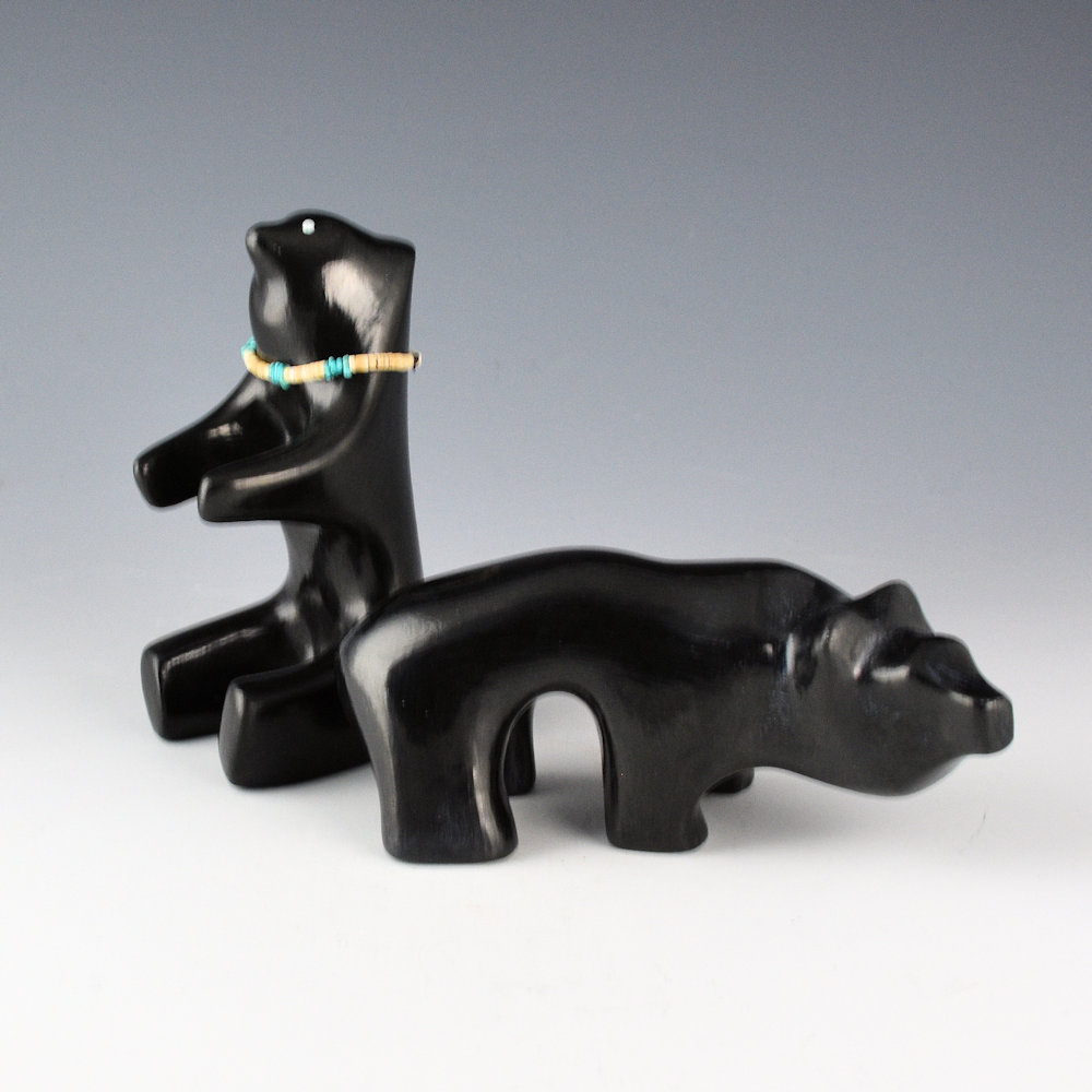 Jarren Naranjo (b. 1996) is a grandson of Flora Naranjo and a son of Sammy Naranjo. Each piece is made from native clay, stone polished and traditionally fired black. Jarren said this is one of the largest sitting bears. The bear is made from clay, and it is standing on all four legs. His bears have a very sculptural appearance with angular faces. Note how the entire piece, even the bottom, is fully polished! The bear is signed, Jarren Naranjo.