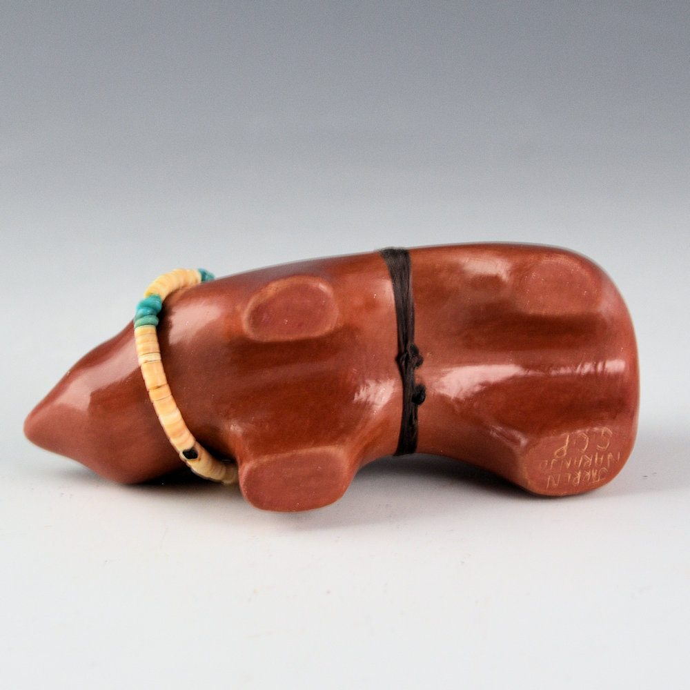 Jarren Naranjo (b. 1996) is a grandson of Flora Naranjo and a son of Sammy Naranjo. Each piece is made from native clay, stone polished and traditionally fired red. The bear is made from clay. It has a turned head and after the firing, inset turquoise eyes. There is an arrowhead added to the back and a shell and turquoise necklace. Very charming! The bear is signed, Jarren Naranjo.