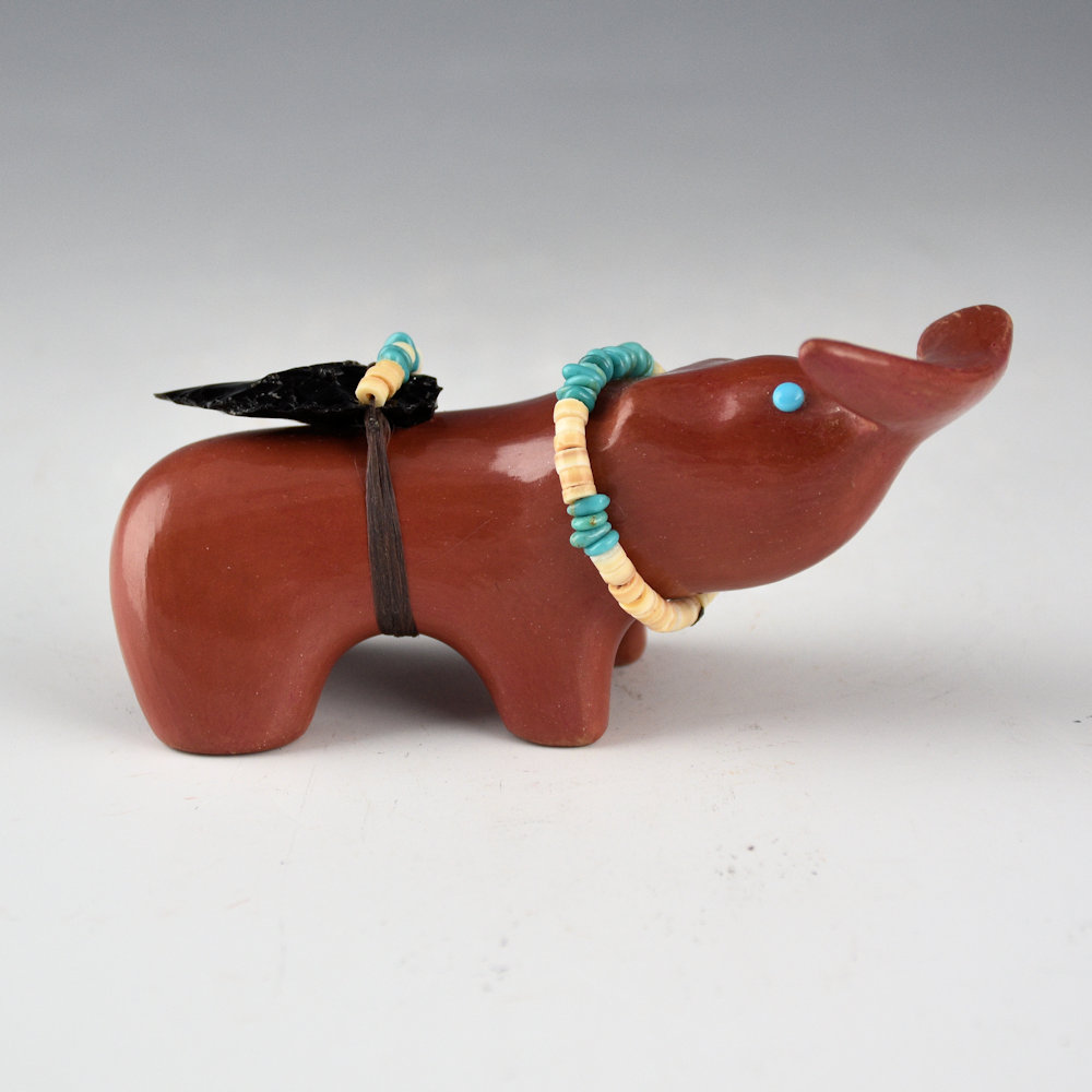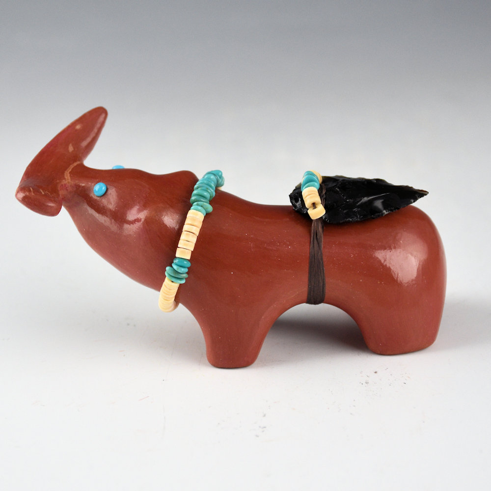 Jarren Naranjo (b. 1996) is a grandson of Flora Naranjo and a son of Sammy Naranjo. Each piece is made from native clay, stone polished and traditionally fired red. The bear is made from clay, and it was sculpted holding a fish in its mouth. The bear and fish are all one piece! The bear has an arrowhead on its back and a shell and turquoise necklace. The bear is signed, Jarren Naranjo.