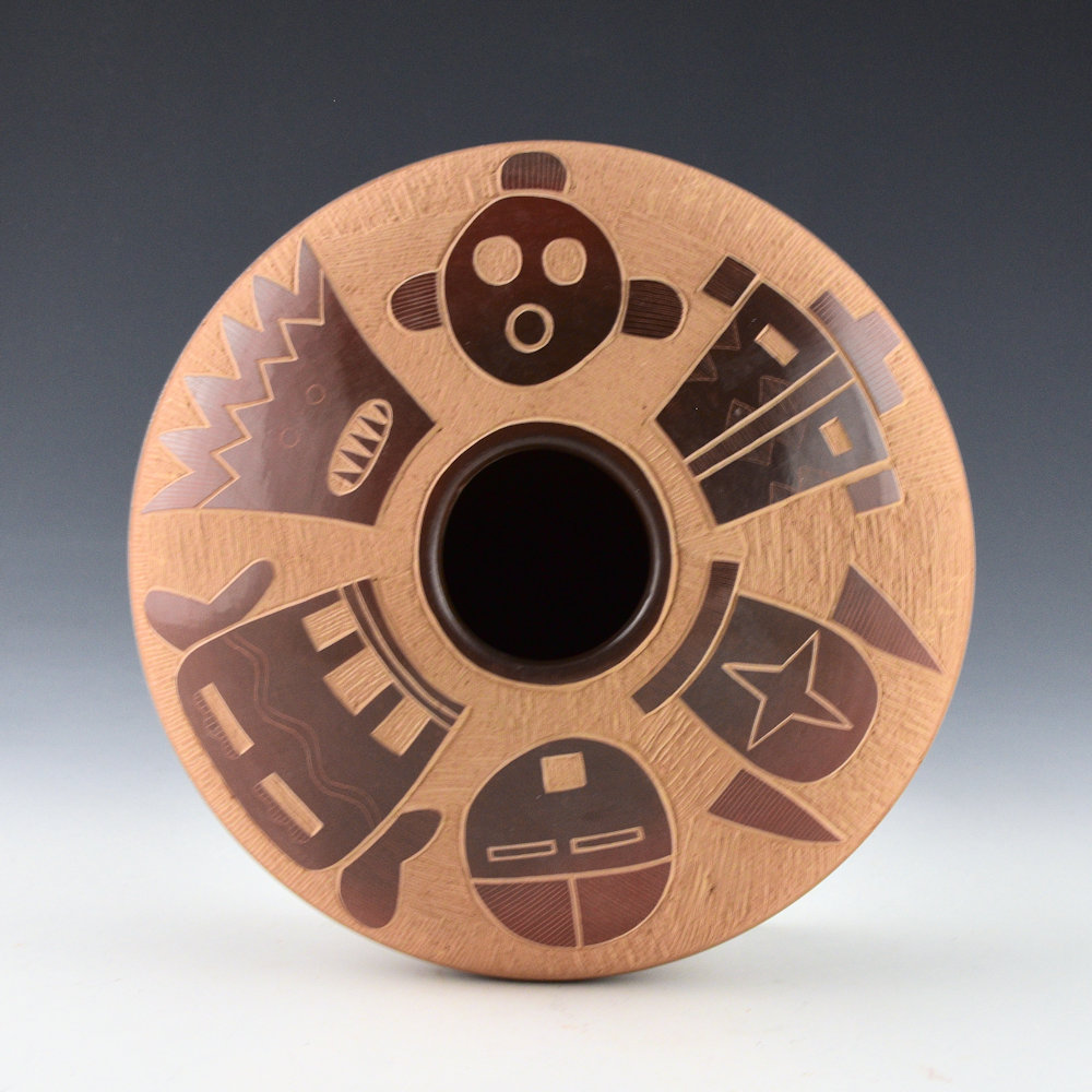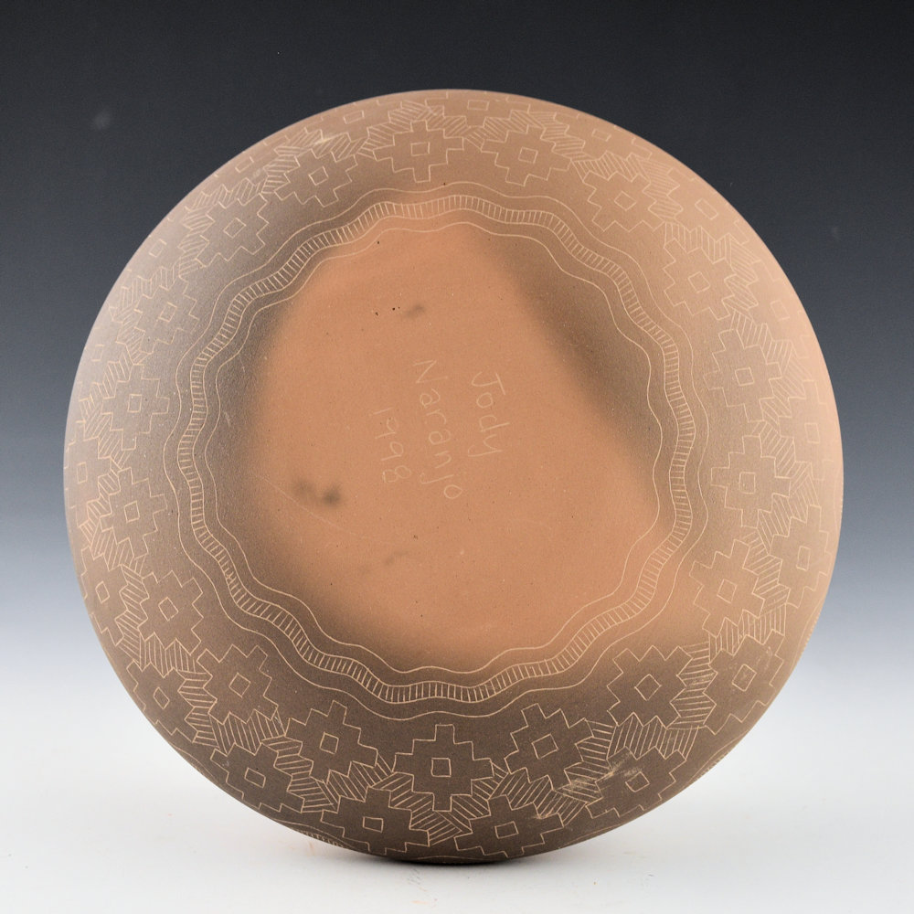 This bowl by Jody Naranjo is from 1998. The bowl has a sharp shoulder, and it is polished on top and matte on the bottom. On the top, there are six katsina faces (Mudhead, Sun, Lonhair Mana, Crow Mother, and others). They are etched into the polished surface. The bottom is matte and is etched with her interlocking stars. The bowl was fired a brown coloration and then etched with designs. It is signed, “Jody Naranjo” and it is in excellent condition with no chips, cracks, restoration, or repair.