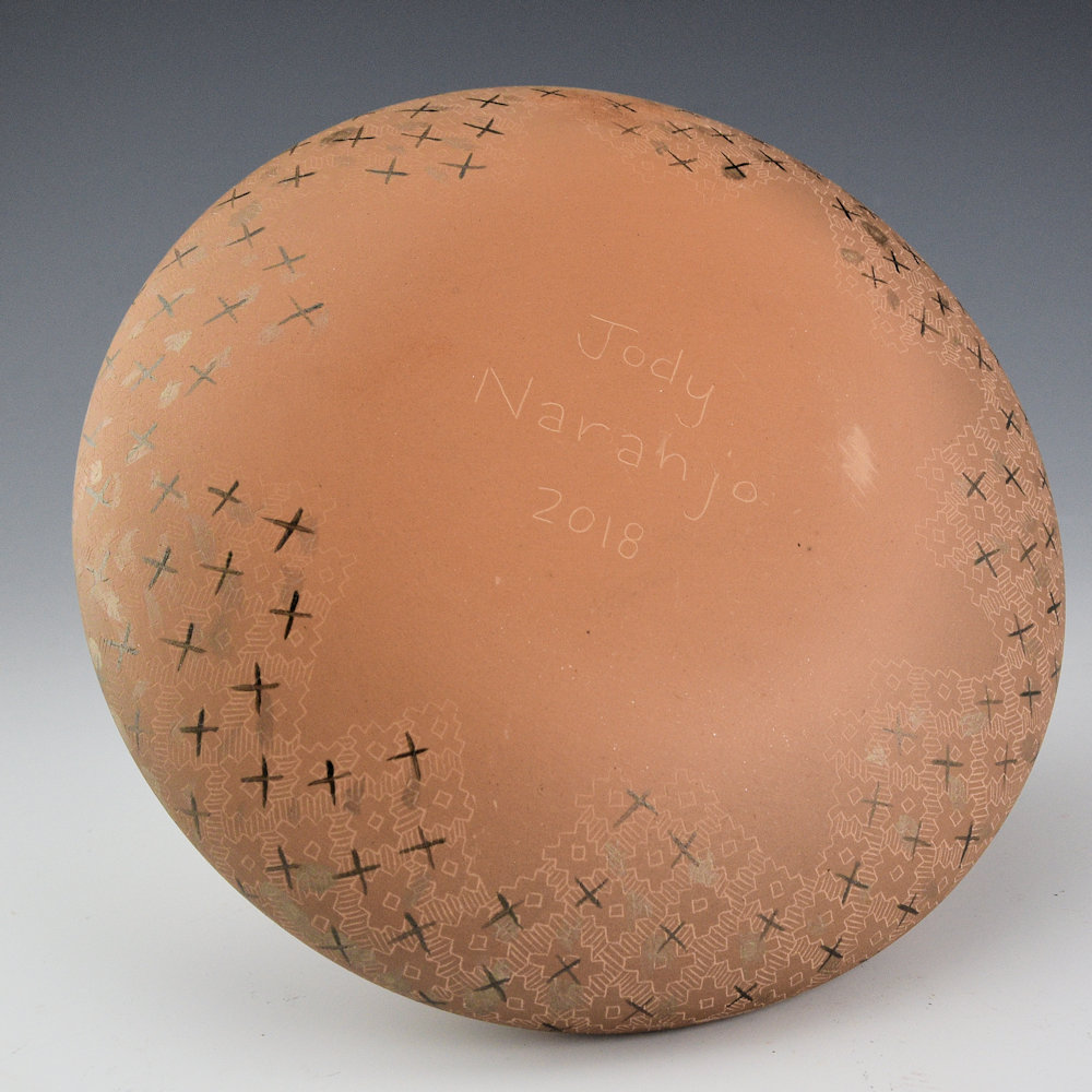 This bowl by Jody Naranjo is from 2018. The jar has a wide shoulder and elongated neck with an asymmetric rim. It is matte and fully etched with star designs. Around the top of the shoulder are etched fish that are painted with acrylic post-firing. It is signed, “Jody Naranjo” and it is in very good condition with no chips, cracks, restoration, or repair.