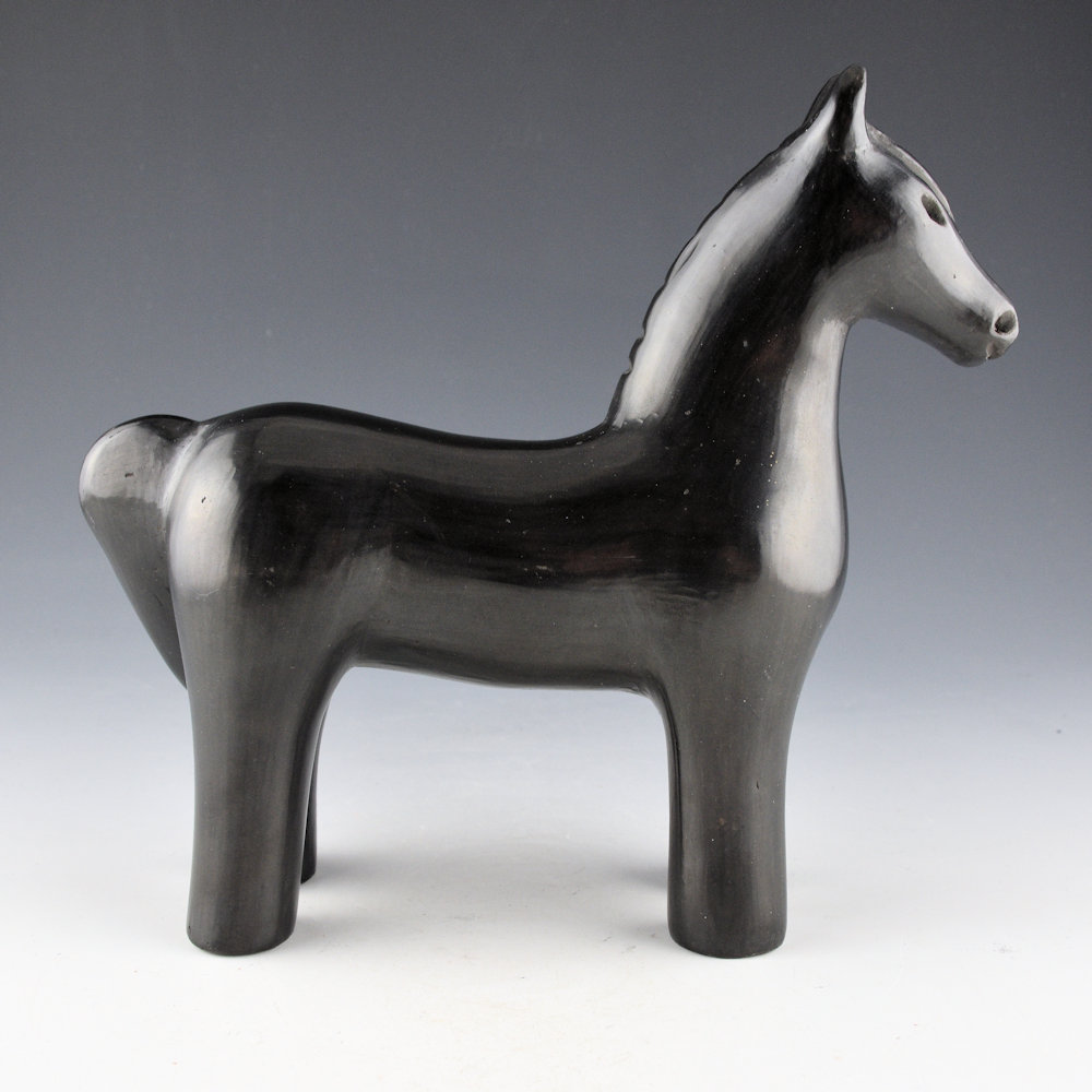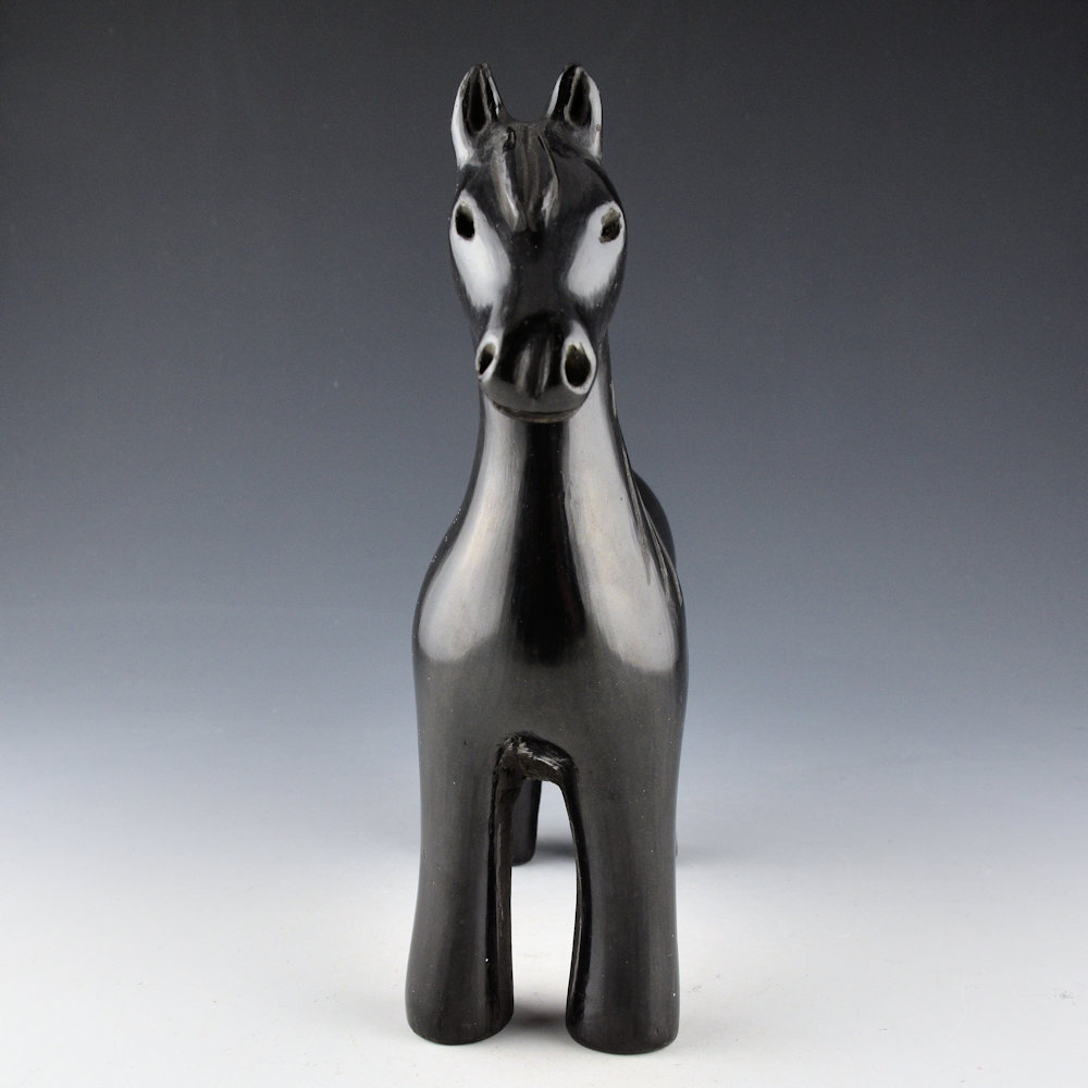 This clay horse is by Maria I. Naranjo (1919-2015). She is considered the first potter from Santa Clara pueblo to make nacimientos (nativity) in blackware pottery. She originally made them in the Spanish style, but started making them in the traditional Indian style in the 1960s. She also created a variety of figurative animals. This horse is made from native clay, and it is fully polished. Maria’s horses are always distinctive, as they have the four legs separated, each individually polished. The mane and tail are carved into the clay. The piece was fired to a deep black coloration. I’m always amazed when figurative pieces like this horse survive over the years with any breakage! The horse is signed, “Margaret N.”. It is in excellent condition with no chips, cracks, restoration, or repair.