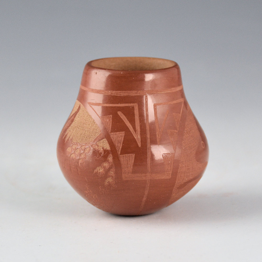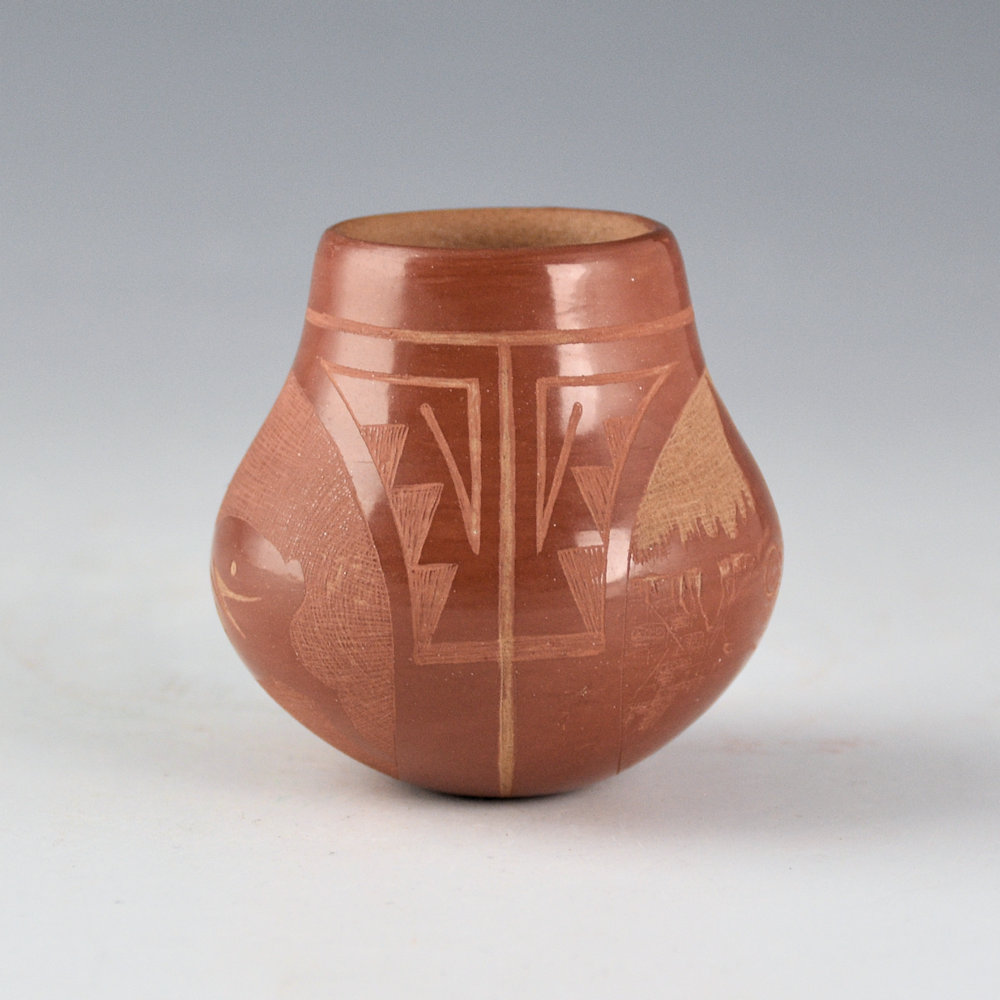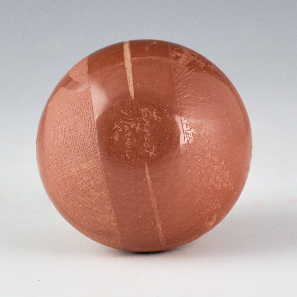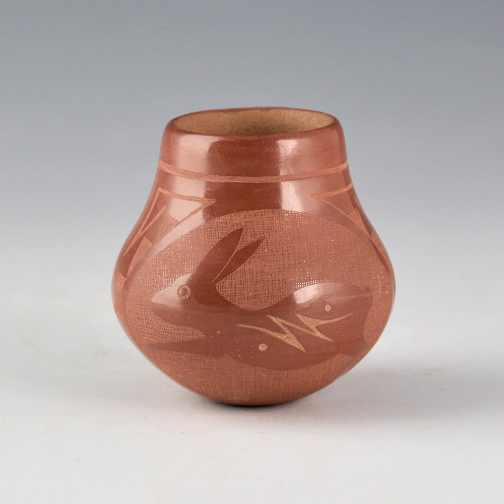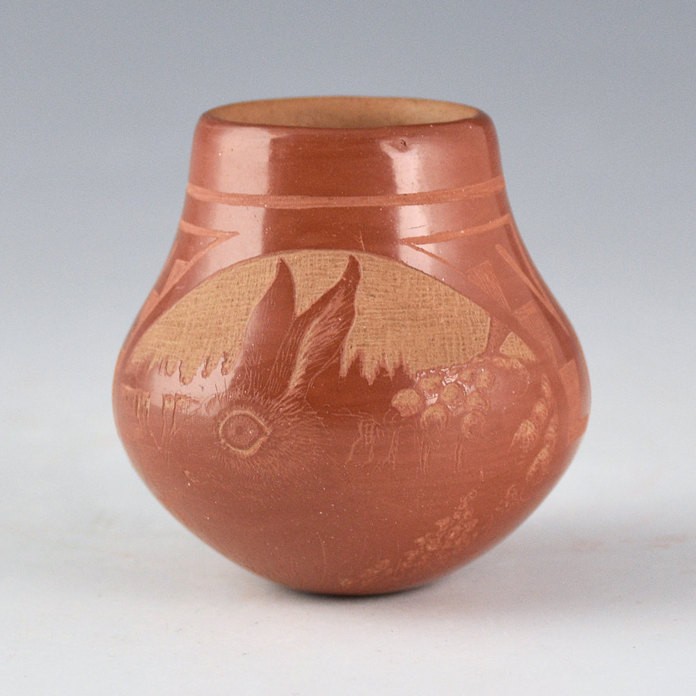 Marian Naranjo worked with her husband, Ernest Naranjo, in the early 1970s. She would make and polish the pottery while he would etch the designs. Later, she would work in the 1980s with Kevin Naranjo and continue in a similar style of teamwork. This is one of her classic shapes with a round shoulder and short neck. The jar is very thin-walled. It is fully polished and fired red. One side has a realistic rabbit in the flowers. The opposite side has a Mimbres rabbit running. Separating the two sides are geometric cloud and rain patterns. The jar is tightly etched using the various levels of clay to create the colorations. The jar is signed on the bottom, “Ernest & Marian Rose”. It is in excellent condition with no chips, cracks, restoration, or repair.
