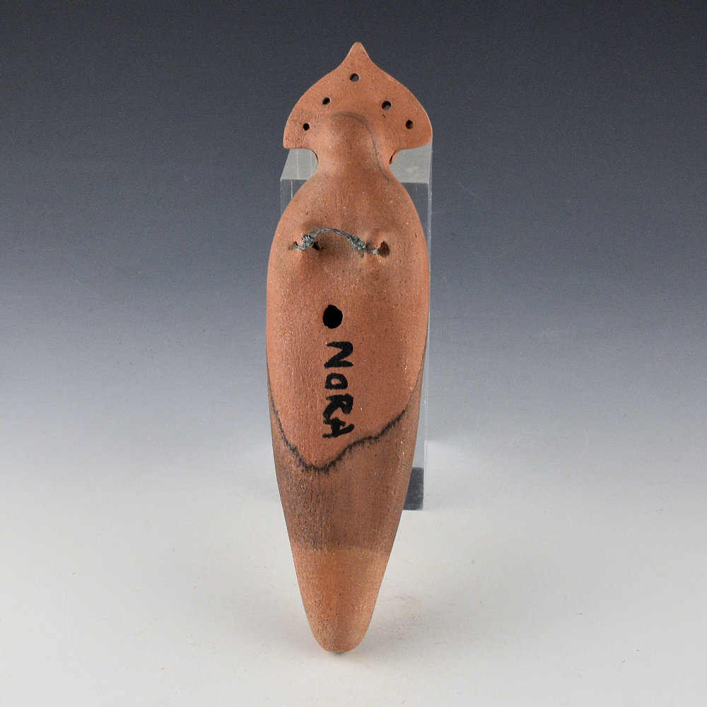 Nora Naranjo-Morse is known for creative clay figures and sculptural work. This is a clay figure, and one of her “Mud Woman” series. The figure is meant to be hung on a wall. She has a tablita on her head and clay slipped earrings. The body has a clay painted to create a shawl. It is signed on the back, “Nora”. It is in excellent condition with no chips, cracks, restoration or repair.