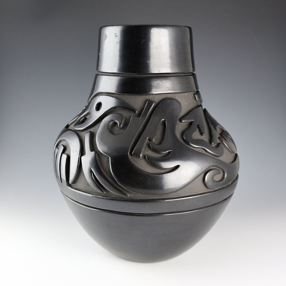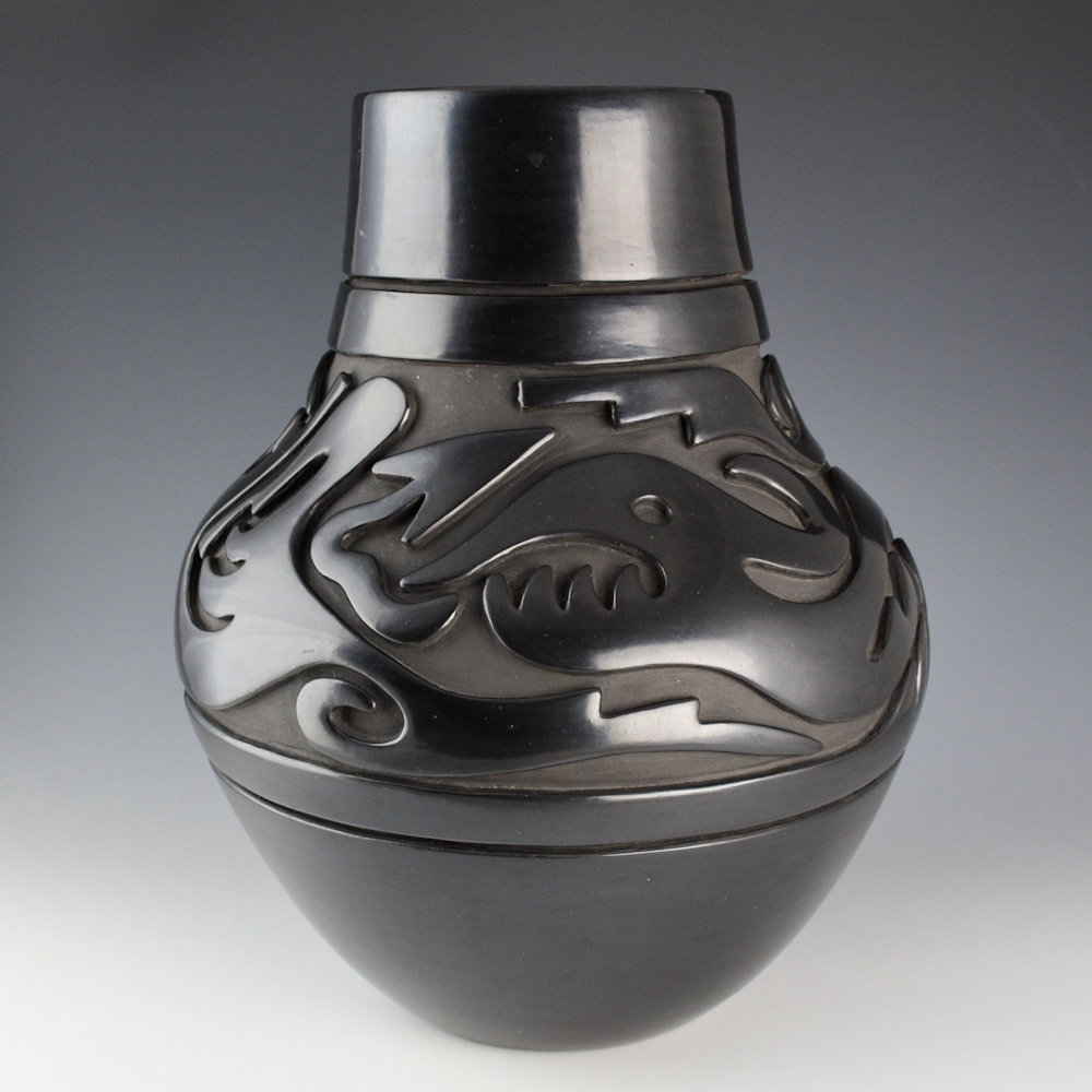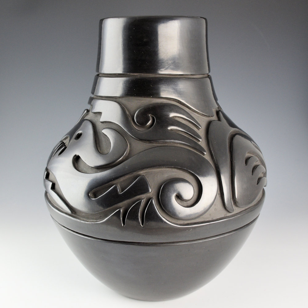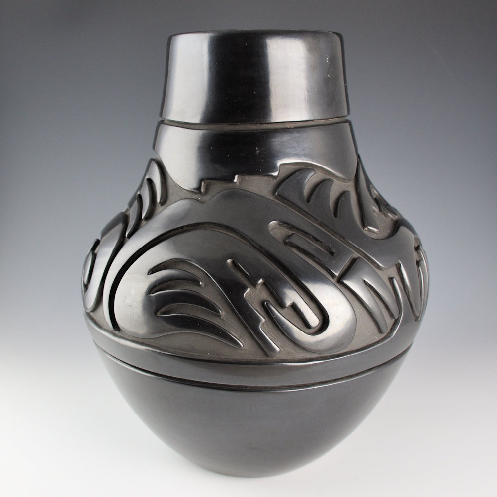 Naranjo, Teresita – 13.5″ Tall Jar with Carved Avanyu (1980s)