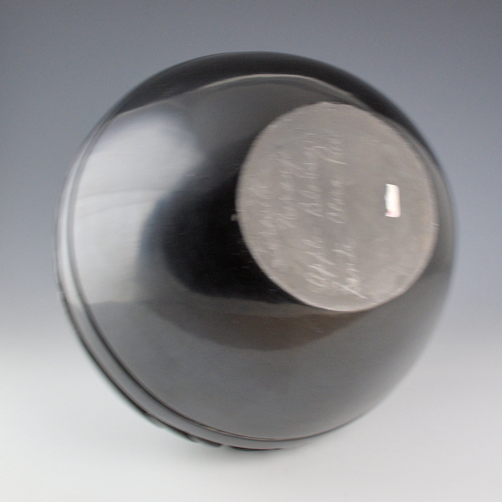This is a classic carved jar by Teresita Naranjo. Teresita was a daughter of Christina Naranjo and was known for her deeply carved pottery. Each piece was coil-built, carved, stone polished, and traditionally fired. The rim and base of the jar are fully polished. The central band is carved with a flowing avanyu as the design. It is VERY deeply carved with multiple sections and a lot of small angles and swirls. The carving is exceptional on this piece. Teresita was one of the first Santa Clara potters to begin designing with such deep and flowing carving. The bowl is signed on the bottom, “Teresita Naranjo”. It is in excellent condition with no chips, cracks, restoration or repair.