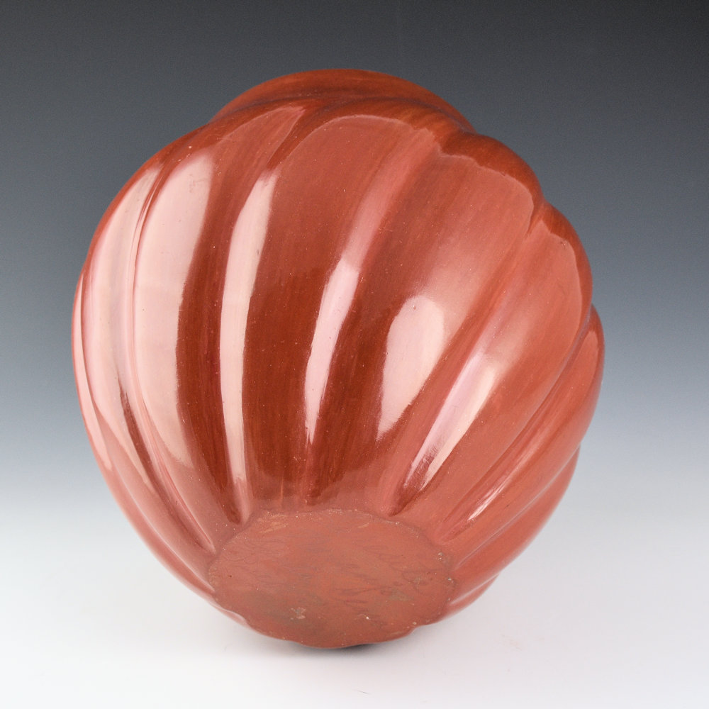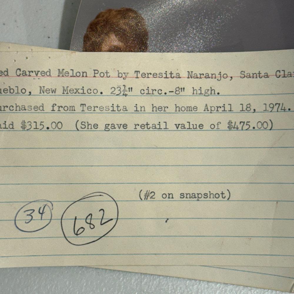 This is a striking melon jar by Teresita Naranjo.  Teresita was a daughter of Christina Naranjo and was known for her deeply carved pottery.   Each piece was coil-built, carved, stone-polished, and traditionally fired.  This jar is from 1974 and was purchased directly from Teresita.  There is a photo of Teresita holding the piece.  The jar has 12 melon ribs, each spiraling around the piece.  Of course, the jar is highly stone-polished, and it was traditionally fired red.  The jar is in very good condition with no chips, cracks, restoration, or repairs.  It is signed on the bottom in the clay, “Teresita Naranjo”.  The last photo is of Teresita holding the jar. There is also a typed card by the original purchaser, who bought it in 1974.  Both great pieces of provenance!
