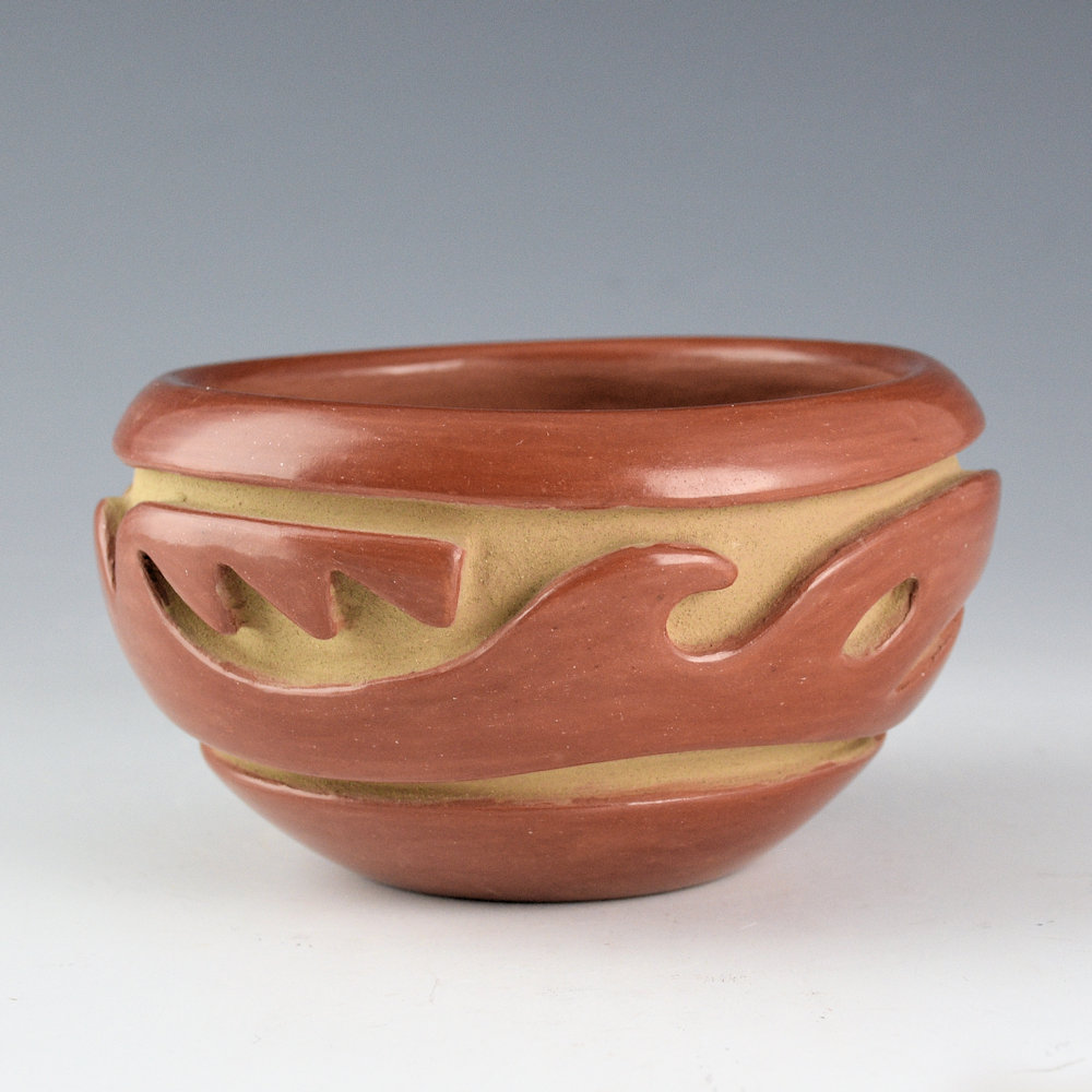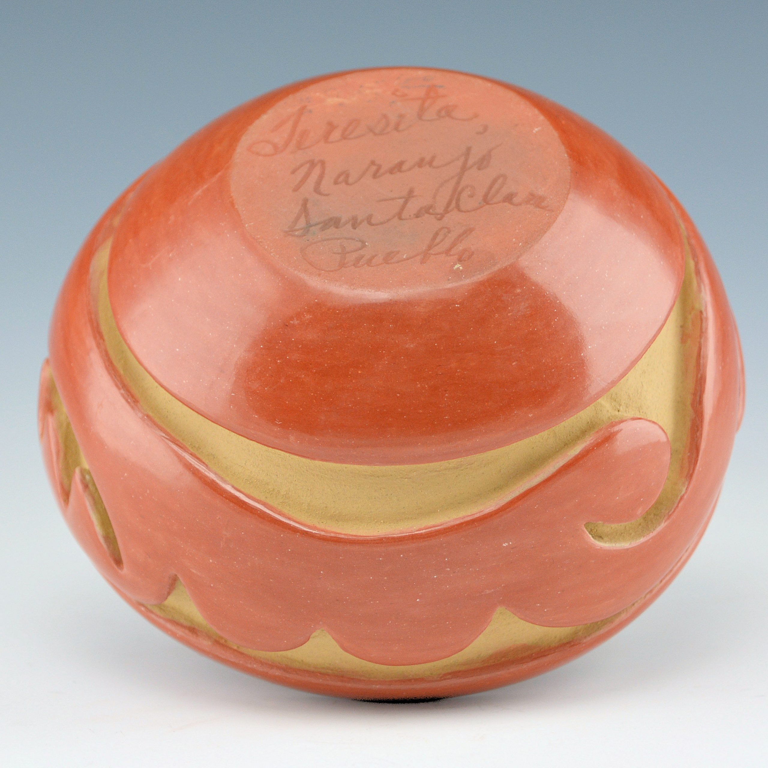 Teresita Naranjo was a daughter of Christina Naranjo and know for her deeply carved pottery. This bowl has her stylized avanyu as the design. The bowl is fully polished red and has the classic cream colored clay in the background. The avanyu encircles the bowl and the body has cloud and rain designs. It is signed on the bottom in the clay, “Teresita Naranjo” and it is in very good condition with no chips, cracks, restoration or repair.