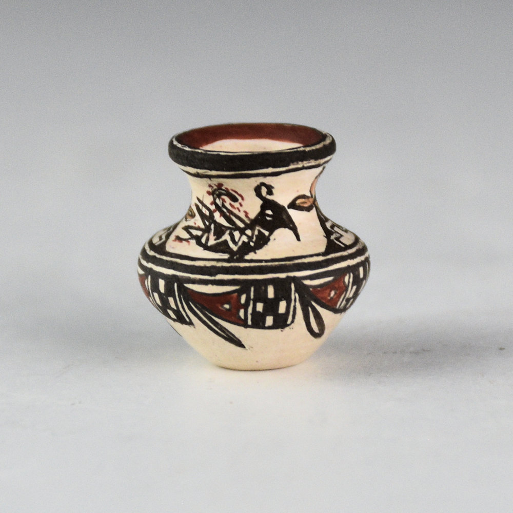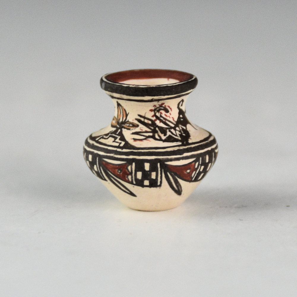 Thomas Natseway is one of the most renowned miniaturists in Pueblo pottery. Rarely does he make a piece that is over 1" tall! Thomas has won numerous awards for his pottery at events such as Santa Fe Indian Market and Gallup Ceremonials.