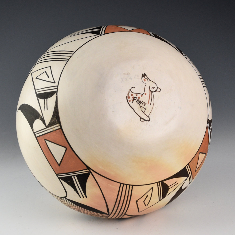 This is a classic jar by Eunice “Fawn” Navasie. She was a daughter-in-law of Paqua Naha and a sister-in-law of Joy “Frogwoman” Navasie. This jar is coil-built, slipped and polished white, and painted with bee-weed and red clay. This jar has a round shoulder and short neck. There are swirling Hopi birds encircling the piece in three panels. The birds are painted with bee-weed and an orange-red clay slip. The color of the red indicates this pieces is from the late 1960s. The jar was traditionally fired and note the “meringue” colored blushes right on the neck! The jar is signed on the bottom, “Fawn” inside her fawn hallmark. It is in excellent condition with no chips, cracks, restoration or repair.