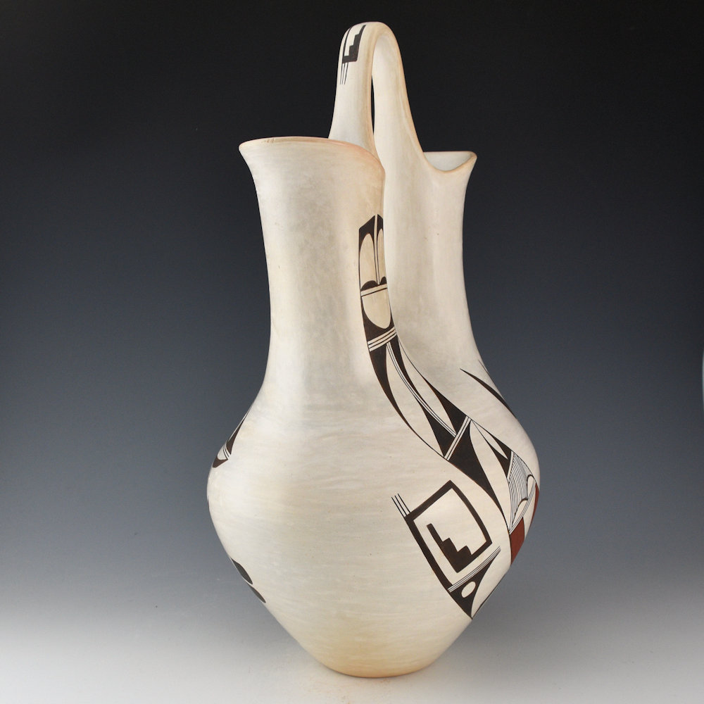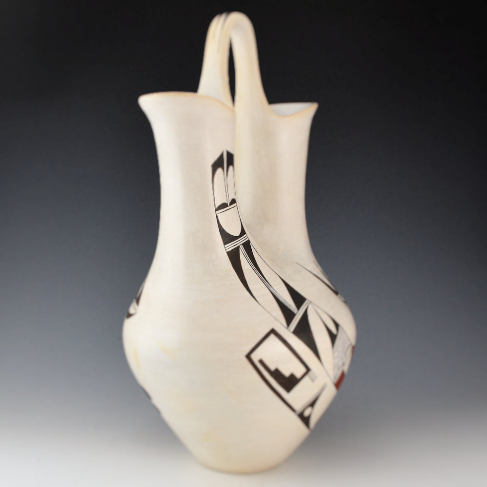 Joy Navasie was known for her white slipped pottery and classic use of design elements. She learned to make pottery from her mother, Paqua, who also used white clay and signed with a frog as a hallmark. The white kaolin clay is a slip that is applied to the surface of the vessel, and then black (bee-weed) and red clay slips are used for painting. This wedding vase is a classic of her pottery from the early 1970s. The vase has a round shoulder and symmetric spouts. There is a Hopi bird on each side, with the stylized tail feather extending up each spout. The wings and tail are around the body of the wedding vase. It is painted with bee-weed (black) and her early orange-red red clay to accent the designs. The wedding vase was traditionally fired outside with the resulting light colorations that can be seen on the piece. The vase is signed on the bottom with her frog hallmark. It is in excellent condition with no chips, cracks, restoration or repair.