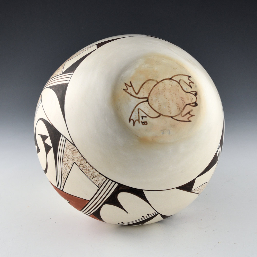 Leona Navasie (b. 1939) is a daughter of Joy “Frog Woman” Navasie and a granddaughter of Paqua Naha. She began making pottery in the 1960s. This is one of the few pieces of her pottery we have had in the gallery. The piece has a round shoulder and an elongated neck. There are clouds painted above the shoulder. Around the sides are swirling Sikyatki bird wings. The jar is painted with bee-weed and red clay slip. The piece was traditionally fired. It is in excellent condition with no chips, cracks, restoration or repair. It is signed on the bottom with a frog hallmark and the letters, “LB”.