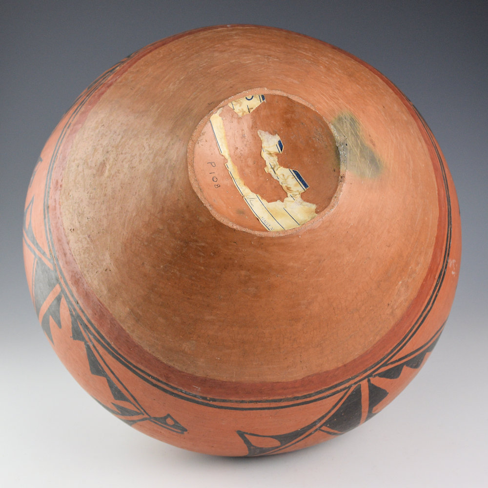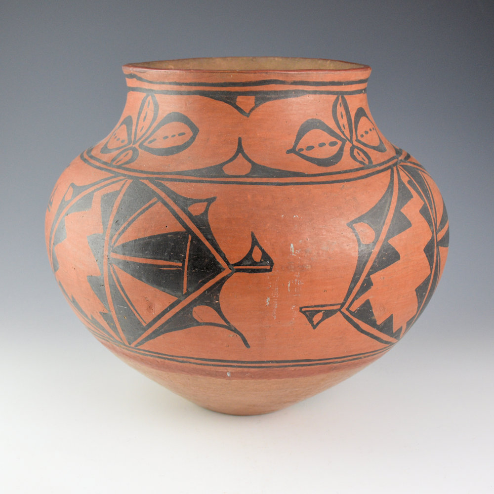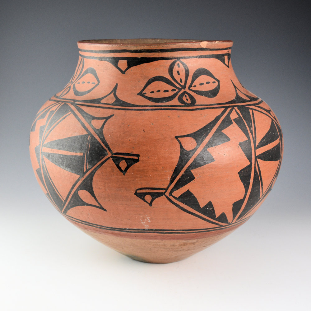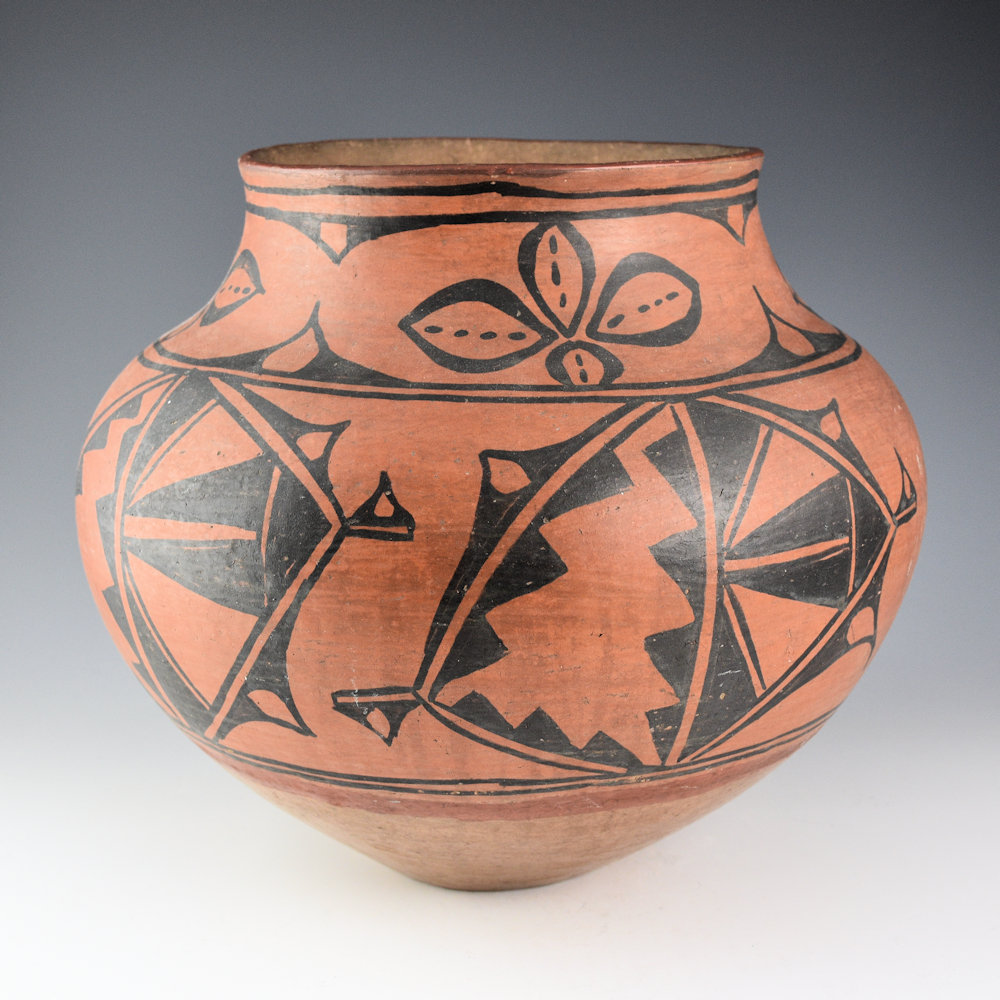 This is a classic black-on-red jar from the 1890s. This style was as popular as the polychrome pottery at the time. The jar is a classic shape with a round body and a short neck. There are plant designs on the neck. While the jar is fully painted with dynamic imagery, there is not enough definitive imagery to give the jar an attribution, so we say it is by a potter and painter once known. The surface of the jar is a reflection of the traditional firing process. It is in very good condition with no cracks, restoration, or repair.