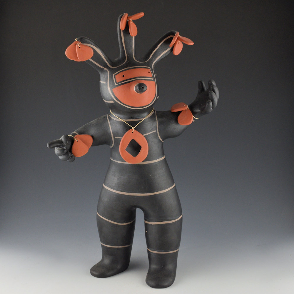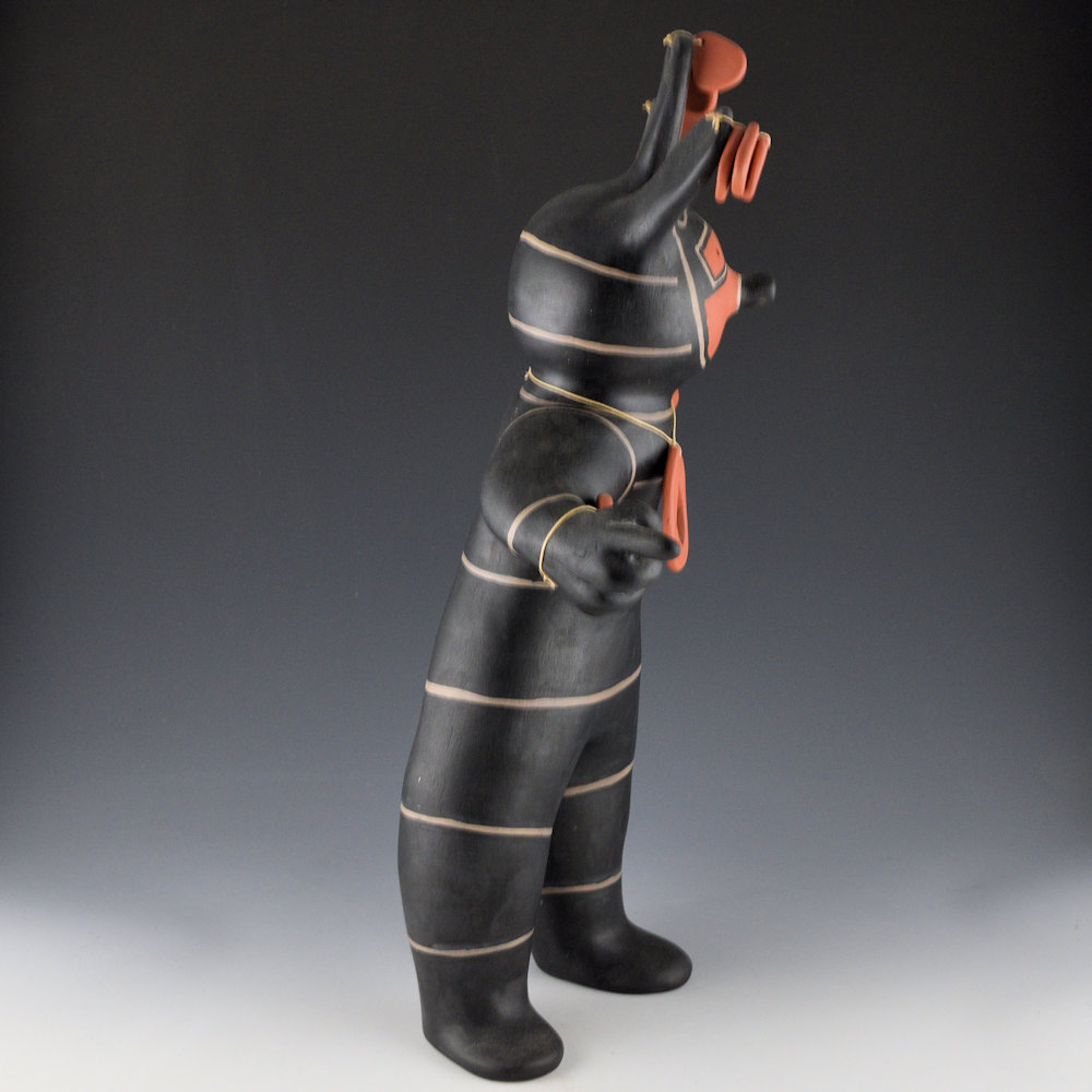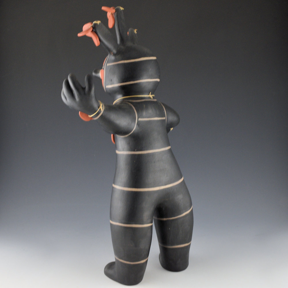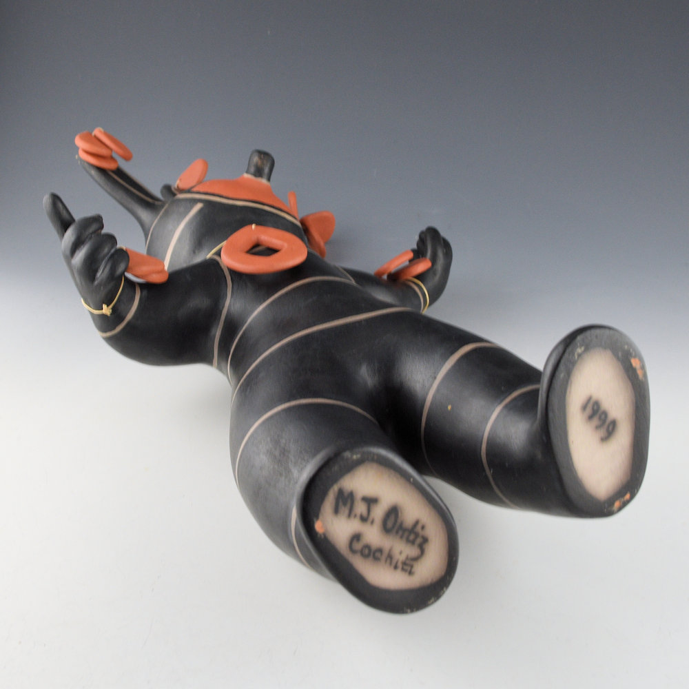 Janice Ortiz is a sister of noted potter Virgil Ortiz. She has created a series of traditional-style figures which are based on the four directions (North, South, East and West). Each of the directions is meant to be a specific color. This figure represents “West” and, while the traditional color is blue, the only clay options are the black created from wild spinach (a plant). The figure has a wonderful sense of motion with the hands and arms! There are bands of design across the body. Each piece is coil-built and painted with native clay slips and wild spinach plant for the black. They are each traditionally fired. The piece is signed “M.J. Ortiz”. It is in excellent condition with no chips, cracks, restoration, or repair.