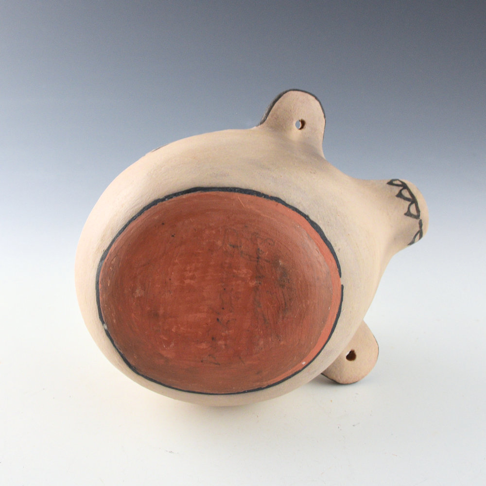 Seferina Ortiz is the matriarch of a family of renowned potters, including Virgil Ortiz, Janice Ortiz, and Lisa Holt. This is a classic canteen that sits on its side. It is coil-built and painted with a white clay slip and wild spinach for the black. The canteen is from the 1970s. The piece is painted with rain clouds on the handles and around the rim. The top/front has two lizards in relief and down the center is a corn plant. The body of the canteen is painted with bee-weed (black) on a white clay slip. This style of design is reminiscent of the work of her mother, Laurencita Herrara. The canteen is signed on the bottom “Seferina Ortiz”. It was traditionally fired and is in excellent condition with no chips, cracks, restoration, or repair.