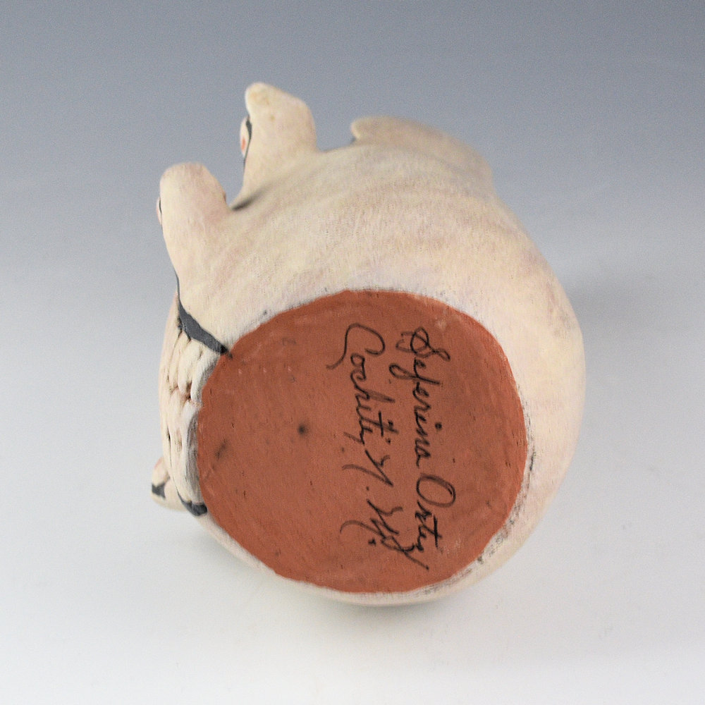 Seferina Ortiz is certainly one of the great matriarchs of Cochiti Pueblo. She learned to make pottery from her mother, Laurencita Herrera. She is also the matriarch of a family of innovative potters including Virgil Ortiz, Janice Ortiz, and Lisa Holt. Seferina created traditional style Cochiti pottery figures and vessels. Seferina won numerous awards for her pottery at events such as Santa Fe Indian Market.