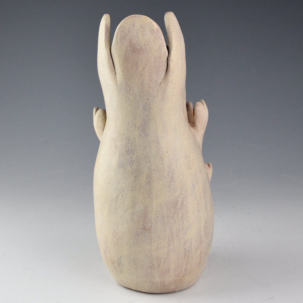 Seferina Ortiz was the matriarch of a family of renowned potters, including Virgil Ortiz, Janice Ortiz, Inez Ortiz, and Lisa Holt. This is a classic storyteller by Seferina. The mother is holding four children in her arms and on her legs. It has Seferina’s classic style of face. Each of the children is painted differently. She is wearing a squash blossom necklace. The figure is slipped with white clay and then painted with a red clay slip and wild spinach (black). The piece is signed on the bottom, “Seferina Ortiz”. It was traditionally fired and in very good condition with no chips, cracks, restoration, or repair. Definitely a classic figure by this historically important potter!