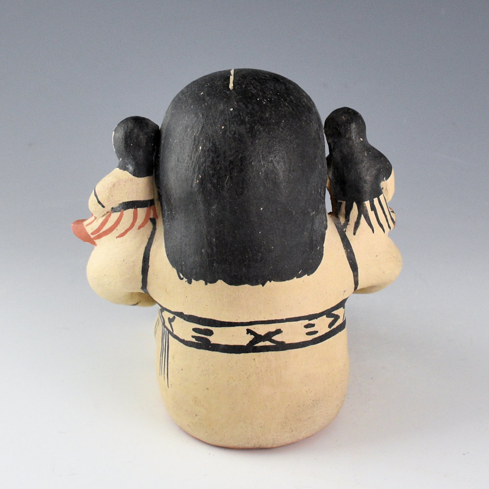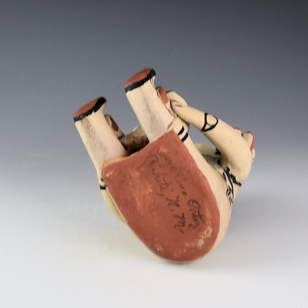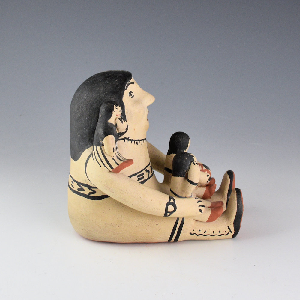 Seferina Ortiz was the matriarch of a family of renowned potters, including Virgil Ortiz, Janice Ortiz, Inez Ortiz, and Lisa Holt. This is a classic storyteller by Seferina. The mother is holding four children in her arms and on her legs. It has Seferina’s classic style of face. Each of the children is painted differently. She is wearing a squash blossom necklace. The figure is slipped with white clay and then painted with a red clay slip and wild spinach (black). The piece is signed on the bottom, “Seferina Ortiz”. It was traditionally fired and in very good condition with no chips, cracks, restoration, or repair. Definitely a classic figure by this historically important potter!