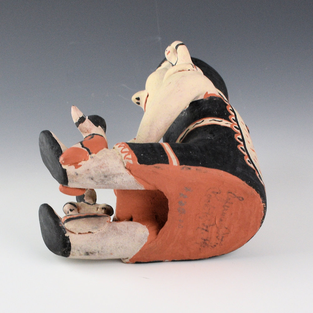 Seferina Ortiz is certainly one of the great matriarchs of Cochiti Pueblo. She learned to make pottery from her mother, Laurencita Herrera. She is also the matriarch of a family of innovative potters including Virgil Ortiz, Janice Ortiz, and Lisa Holt. Seferina created traditional style Cochiti pottery figures and vessels. Seferina won numerous awards for her pottery at events such as Santa Fe Indian Market.