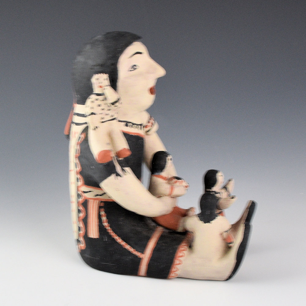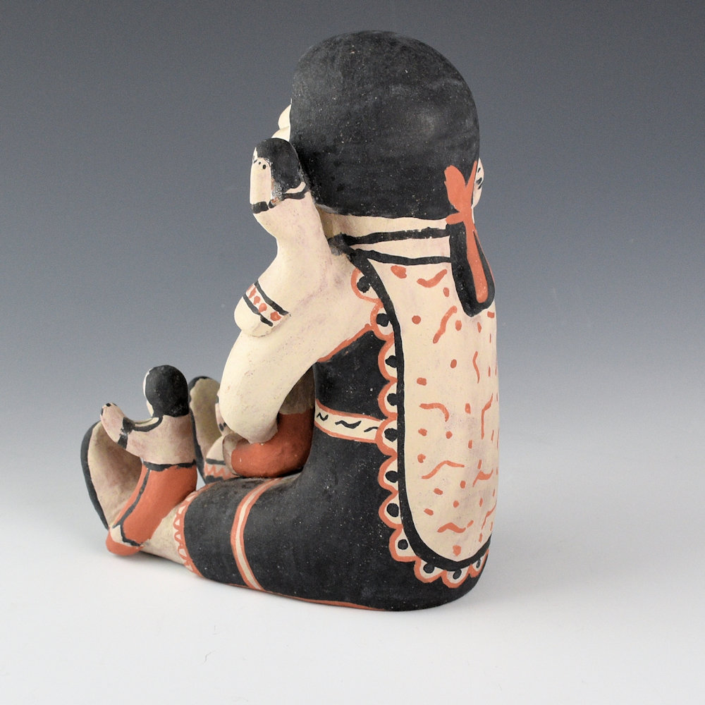 Seferina Ortiz was the matriarch of a family of renowned potters, including Virgil Ortiz, Janice Ortiz, Inez Ortiz, and Lisa Holt. This is a classic storyteller by Seferina. The mother is holding two children in her arms, lap, and on her shoulders. Each of the children is painted differently. She is wearing detailed manta and necklack, with more detail on the back of her dress. The figure is slipped with white clay and then painted with a red clay slip and wild spinach (black). The piece is signed on the bottom, “Seferina Ortiz”. It was traditionally fired and in very good condition with no chips, cracks, restoration, or repair. Definitely a classic figure by this historically important potter!