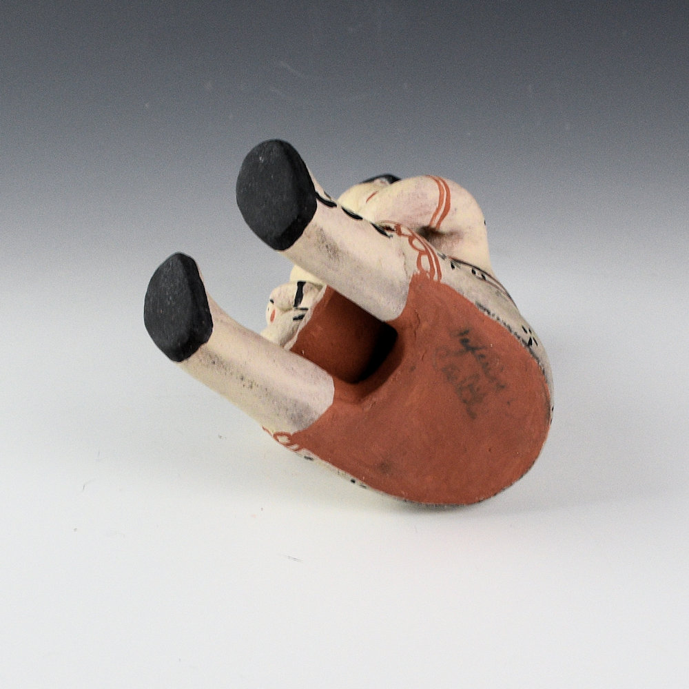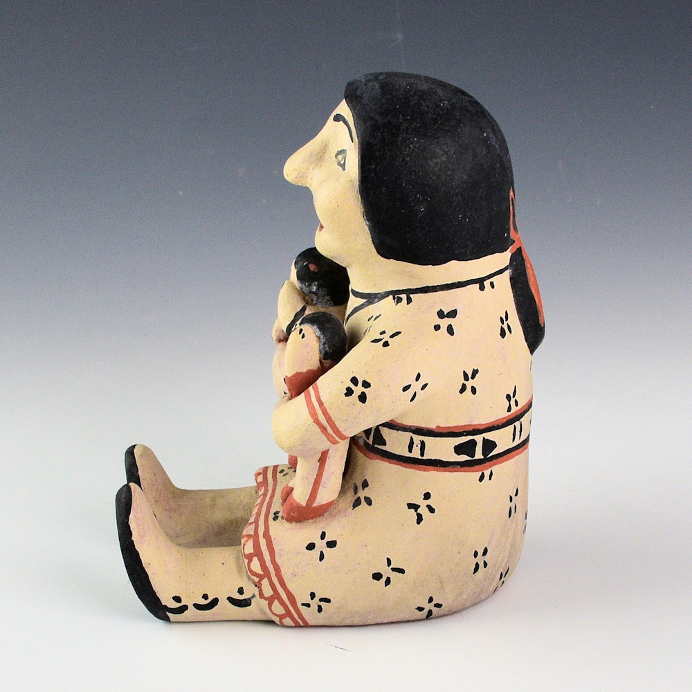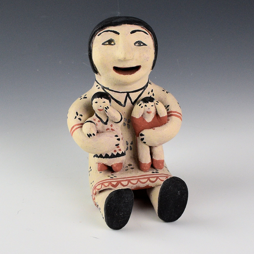 Seferina Ortiz was the matriarch of a family of renowned potters, including Virgil Ortiz, Janice Ortiz, Inez Ortiz, and Lisa Holt. This is a classic storyteller by Seferina.  The mother is holding two children in her arms.  It has Seferina’s classic style of face.  Each of the children is painted differently.  She is wearing detailed dress that is painted with flowers.  The figure is slipped with white clay and then painted with a red clay slip and wild spinach (black).  The piece is signed on the bottom, “Seferina Ortiz”.  It was traditionally fired and in very good condition with no chips, cracks, restoration, or repair.  Definitely a classic figure by this historically important potter!