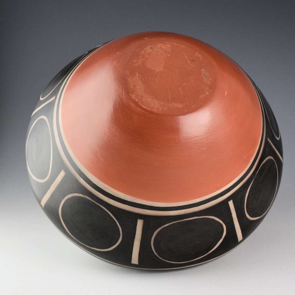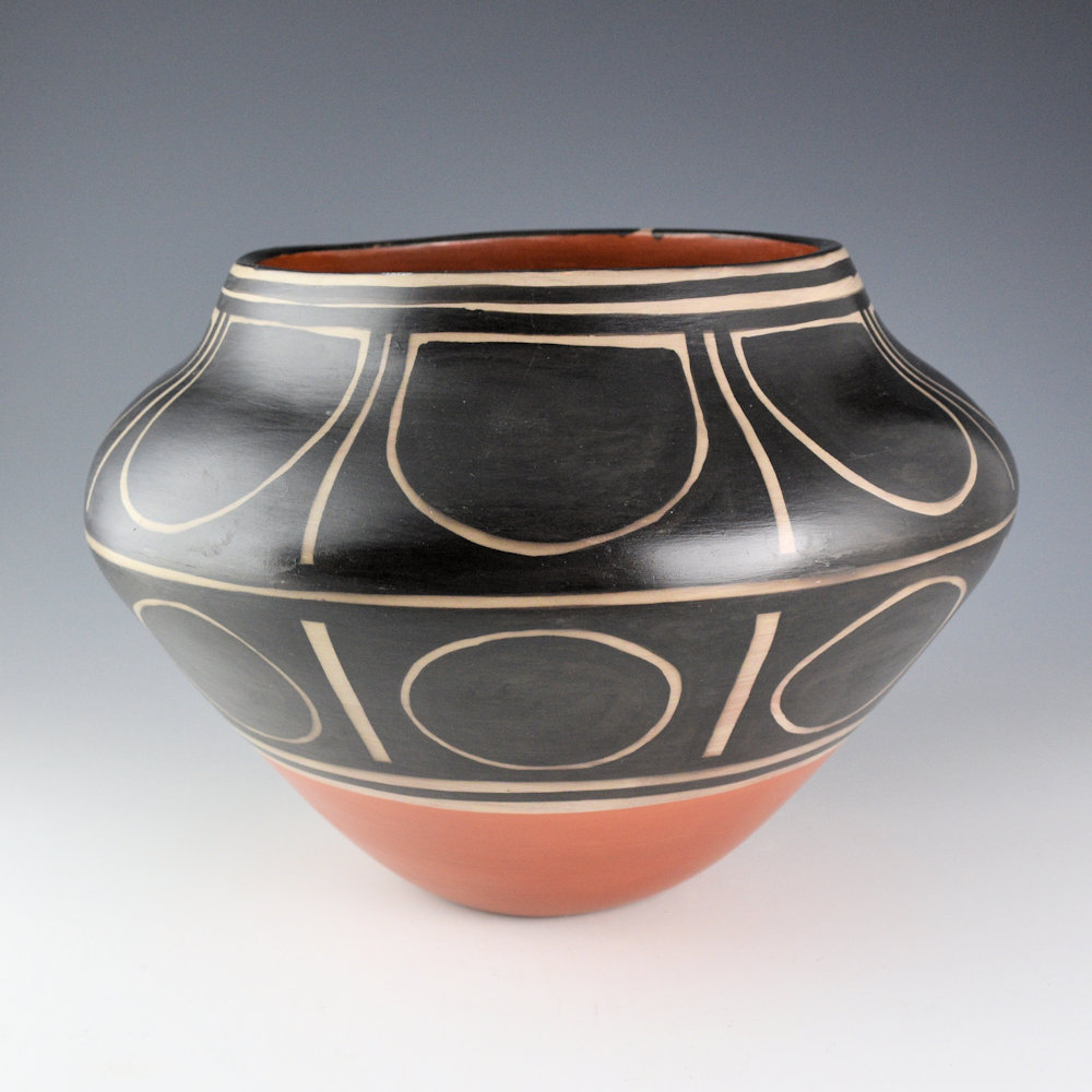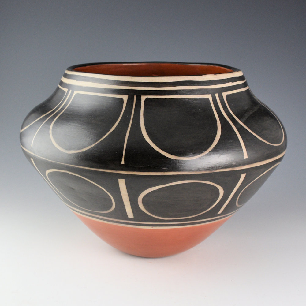 Paulita Pacheco was a sister of noted potter Robert Tenorio. She was married to Gilbert Pacheco and her daughter, Rose Pacheco continues to make traditional-style Kewa pottery. Paulita learned to make pottery from her mother Juanita C. Tenorio and grandmother Andrea Ortiz. This is a large jar that is coil-built and painted with wild spinach plant (black) and red clay slip. The jar has a high shoulder and sloping neck. The neck has a flower petal design. Below the shoulder is a sun pattern. The large black-on-white areas give the jar the appearance of an historic Santo Domingo jar! The jar was traditionally fired. The piece is signed on the bottom, “Paulita Pacheco”. It is in excellent condition with no chips, cracks, restoration or repair.