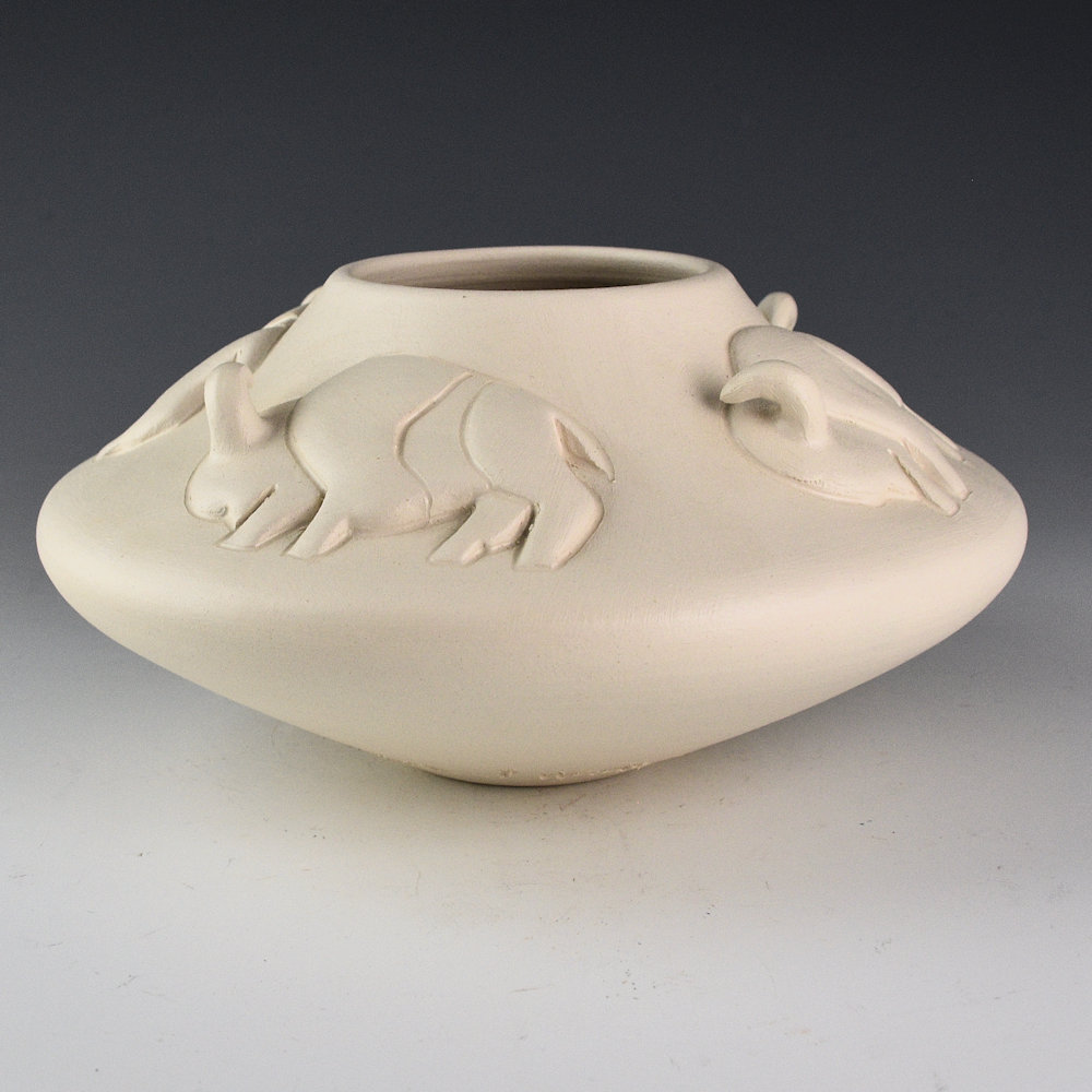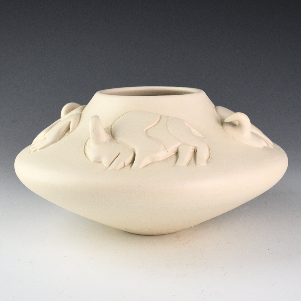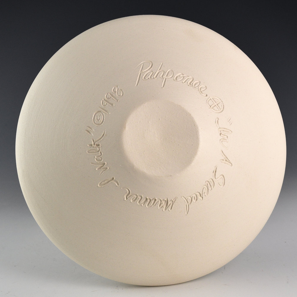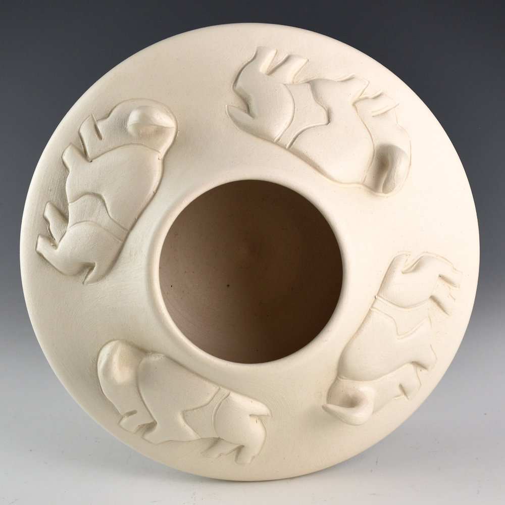 Pahponee (Kickapoo) is known for her contemporary pottery. Her name means “Snow Woman”. She began making pottery in the early 1980s. She is a descendant of the Kickapoo and Potawatomi Nations, originally from the Great Lakes. This is one of her iconic pieces. It is coil-built and has a wide shoulder and sloping sides. The jar has four buffalo in relief on the sides. Their horns extend upwards, away from the jar is even more “realistic” relief. The piece is entitled, “In a Sacred Manner I Walk”. The jar was fired a white coloration. It is signed, “Pahponee”. It is in excellent condition with no chips, cracks, restoration, or repair.